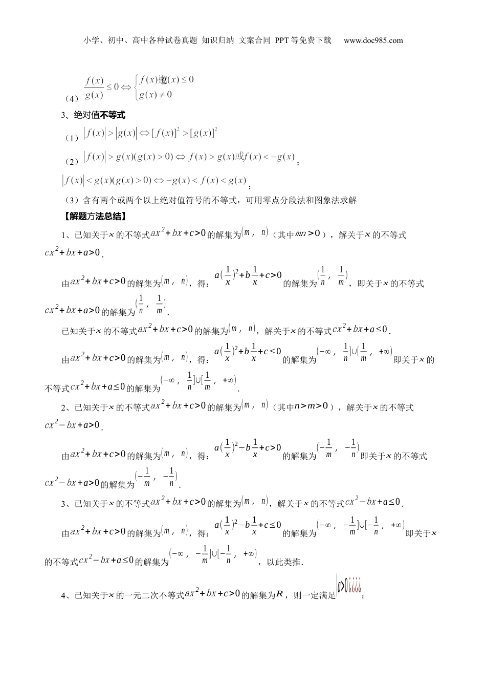 小学、初中、高中各种试卷真题知识归纳文案合同PPT等免费下载www.doc985.com第05讲一元二次不等式与其他常见不等式解法目录考点要求考题统计考情分析(1)会从实际情景中抽象出一元二次不等式.(2)结合二次函数图象,会判断一元二次方程的根的个数,以及解一元二次不等式.(3)了解简单的分式、绝对值不等式的解法.2020年I卷第1题,5分从年高考题看,三个二近几命来“次的关系是必考内,单考查的”容独,为已知条件的一频率很低偶尔作部分出在其考点的题中.现他目小学、初中、高中各种试卷真题知识归纳文案合同PPT等免费下载www.doc985.com1一元二次不等式、一元二次不等式,其中,是方程的两个根,且(1)当时,二次函数图象开口向上.(2)①若,解集为.②若,解集为.③若,解集为.(2)当时,二次函数图象开口向下.①若,解集为②若,解集为2分式不等式、(1)(2)(3)小学、初中、高中各种试卷真题知识归纳文案合同PPT等免费下载www.doc985.com(4)3不等式、绝对值(1)(2);;(3)含有两个或两个以上绝对值符号的不等式,可用零点分段法和图象法求解【解题法总结】方1、已知关于x的不等式ax2+bx+c>0的解集为(m,n)(其中mn>0),解关于x的不等式cx2+bx+a>0.由ax2+bx+c>0的解集为(m,n),得:a(1x)2+b1x+c>0的解集为(1n,1m),即关于x的不等式cx2+bx+a>0的解集为(1n,1m).已知关于x的不等式ax2+bx+c>0的解集为(m,n),解关于x的不等式cx2+bx+a≤0.由ax2+bx+c>0的解集为(m,n),得:a(1x)2+b1x+c≤0的解集为(−∞,1n]∪[1m,+∞)即关于x的不等式cx2+bx+a≤0的解集为(−∞,1n]∪[1m,+∞).2、已知关于x的不等式ax2+bx+c>0的解集为(m,n)(其中n>m>0),解关于x的不等式cx2−bx+a>0.由ax2+bx+c>0的解集为(m,n),得:a(1x)2−b1x+c>0的解集为(−1m,−1n)即关于x的不等式cx2−bx+a>0的解集为(−1m,−1n).3、已知关于x的不等式ax2+bx+c>0的解集为(m,n),解关于x的不等式cx2−bx+a≤0.由ax2+bx+c>0的解集为(m,n),得:a(1x)2−b1x+c≤0的解集为(−∞,−1m]∪[−1n,+∞)即关于x的不等式cx2−bx+a≤0的解集为(−∞,−1m]∪[−1n,+∞),以此类推.4、已知关于x的一元二次不等式ax2+bx+c>0的解集为R,则一定满足{a>0¿¿¿¿;小学、初中、高中各种试卷真题知识归纳文案合同PPT等免费下载www.doc985.com5、已知关于x的一元二次不等式ax2+bx+c>0的解集为φ,则一定满足{a<0¿¿¿¿;6、已知关于x的一元二次不等式ax2+bx+c<0的解集为R,则一定满足{a<0¿¿¿¿;7、已知关于x的一元二次不等式ax2+bx+c<0的解集为φ,则一定满足{a>0¿¿¿¿.【典例例题】题型一:不含参数一元二次不等式的解法【解题总结】解一元二次不等式不等式的思路是:先求出其相应方程根,将根标在轴上,结合图象,写出其解集例1.(2023·上海金山·统考二模)若实数满足不等式,则的取值范围是__________.【答案】【解析】不等式,即,解得,则的取值范围是.故答案为:.例2.(2023·高三课时练习)不等式的解集为______.【答案】【解析】解:由题知不等式为,即,即,解得,所以解集为.故答案为:例3.(2023·高三课时练习)函数的定义域为______.【答案】小学、初中、高中各种试卷真题知识归纳文案合同PPT等免费下载www.doc985.com【解析】要使函数有意义,则,解得.所以函数的定义域为.故答案为:.例4.(2023·高三课时练习)不等式的解集为______.【答案】【解析】不等式即,的根为,故的解集为,即不等式的解集为,故答案为:题型二:含参数一元二次不等式的解法【解题总结】1、数形结合处理.2、含参时注意分类讨论.例5.(2023·全国·高三专题练习)已知集合,集合,若“是”“的充分不必要条件,则实数”的取值范围()A.B.C.D.【答案】A【解析】由得:,,解得:,;由得:;“是”“的充分不必要条件,”,当时,,不满足;当时,,不满足;小学、初中、高中各种试卷真题知识归纳文案合同PPT等免费下载www.doc985.com当时,,若,则需;综上所述:实数的取值范围为.故选:A.例6.(2023·全国·高三专题练习)若关于x的不等式的解集中恰有4个整数,则实数...