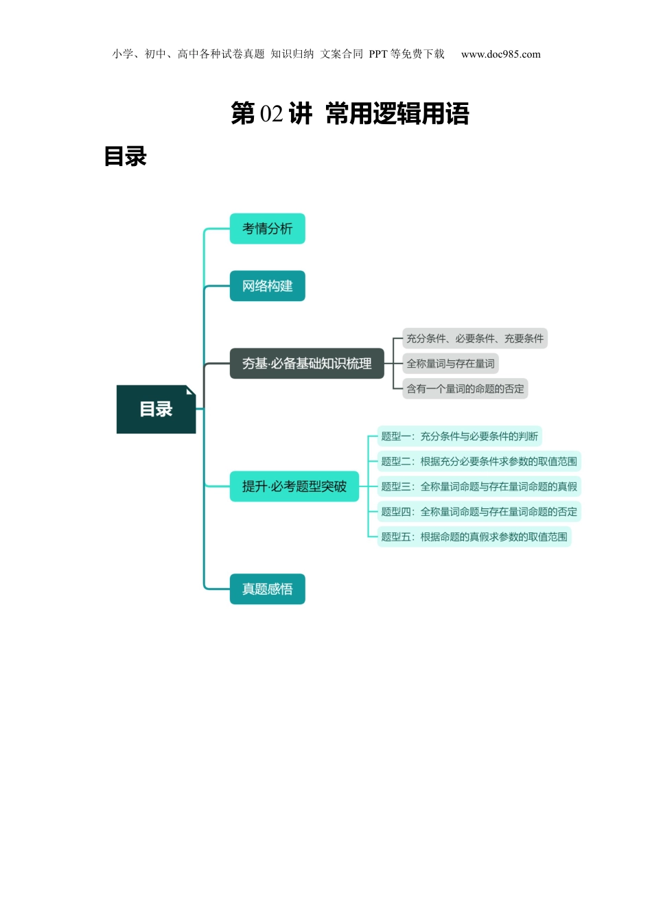小学、初中、高中各种试卷真题知识归纳文案合同PPT等免费下载www.doc985.com第02讲常用逻辑用语目录小学、初中、高中各种试卷真题知识归纳文案合同PPT等免费下载www.doc985.com考点要求考题统计考情分析(1)必要条件、充分条件、充要条件;(2)全称量词与存在量词;(3)全称量词命题与存在量词命题的否定.2022年天津卷第2题,5分2021年全国甲卷第7题,5分从年高考命题看,常用逻辑用近几来语没有单命题考,偶以已知条独查尔件的出在其考点的题中.形式现他目重点关注如下两点:(1)集合与充分必要条件相结合问题的解题方法;(2)全称命题与存在命题的否定和以全称命题与存在命题为条件,求参数的范围问题.一充分条件必要条件充要条件、、、1、定义如果命题若“,则为真(记作”),则是的充分条件;同时是的必要条件.2、从逻辑推理关系上看(1)若且,则是的充分不必要条件;(2)若且,则是的必要不充分条件;小学、初中、高中各种试卷真题知识归纳文案合同PPT等免费下载www.doc985.com(3)若且,则是的的充要条件(也说和等价);(4)若且,则不是的充分条件,也不是的必要条件.对充分和必要条件的理解和判断,要搞清楚其定义的实质:,则是的充分条件,同时是的必要条件.所谓充分是指只要“”成立,就成立;所谓必要是指要使得“”成立,必须要成立(即如果不成立,则肯定不成立).二.全称量词与存在量词(1)全称量词与全称量词命题.短语所有的、任意一个在逻辑中通常叫做全称量词,并用“”“”符号“表示.含有全称量词的命题叫做全称量词命题.全称量词命题对”“中的任意一个,有成立可用符号简记为”“,读作对任意”“属于,有成立.”(2)存在量词与存在量词命题.短语存在一个、至少有一个在逻辑中通常叫做存在量词,“”“”并用符号“表示.含有存在量词的命题叫做存在量词命题.存在量词命题存在”“中的一个,使成立可用符号简记为”“,读作存在”“中元素,使成立(存在量词命”题也叫存在性命题).三.有一量词的命题的否定含个(1)全称量词命题的否定为,.(2)存在量词命题的否定为.注:全称、存在量词命题的否定是高考常见考点之一.【解题方法结】总1、从集合与集合之间的关系上看设.(1)若,则是的充分条件(),是的必要条件;若,则是的充分不必要条件,是的必要不充分条件,即且;注:关于数集间的充分必要条件满足:小“大.”(2)若,则是的必要条件,是的充分条件;(3)若,则与互为充要条件.2、常见的一些词语和它的否定词如下表原词语等于大于小于是都是任意(所有)至多有一个至多有一个否定词语不等于小于等于大于等于不是不都是某个至少有两个一个都没有(1)要判定一个全称量词命题是真命题,必须对限定集合中的每一个元素证明其成立,要判断全称量词命题为假命题,只要能举出集合中的一个,使得其不成立即可,这就是通常所说的举一个反例.小学、初中、高中各种试卷真题知识归纳文案合同PPT等免费下载www.doc985.com(2)要判断一个存在量词命题为真命题,只要在限定集合中能找到一个使之成立即可,否则这个存在量词命题就是假命题.【典例例题】题型一:充分条件与必要条件的判断【解题结】总1、要明确推出的含义,是成立一定成立才能叫推出而不是有可能成立.2、充分必要条件在面对集合问题时,一定是小集合推出大集合,而大集合推不出小集合.3、充分必要条件考察范围广,失分率高,一定要注意各个知识面的培养.例1.(2023·江苏扬州·扬州中学校考模拟预测)已知向量,,则“是”“的(”)A.充分不必要条件B.必要不充分条件C.充要条件D.既不充分也不必要条件例2.(2023·全国·高三专题练习)已知直线平面,则直线“平面是平面”“平面的”()A.充分不必要条件B.必要不充分条件C.充要条件D.既不充分也不必要条件例3.(2023·天津和平·高三天津一中校考阶段练习)“是”“的(”)A.充分不必要条件B.必要不充分条件C.充要条件D.既不充分也不必要条件例4.(2023·天津南开·南开中学校考模拟预测)已知,,则“是”“的(”)A.充分不必要条件B.必要不充分条件C.充要条件D.既不充分也不...