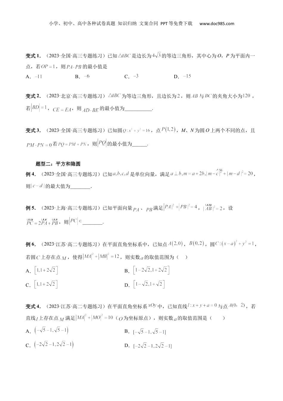 小学、初中、高中各种试卷真题知识归纳文案合同PPT等免费下载www.doc985.com重难点突破02向量中的隐圆问题目录技巧一.向量极化恒等式推出的隐圆乘积型:⃗PA⋅⃗PB=λ定理:平面内,若A,B为定点,且⃗PA⋅⃗PB=λ,则P的轨迹是以M为圆心√λ+14AB2为半径的圆证明:由⃗PA⋅⃗PB=λ,根据极化恒等式可知,PM2−14AB2=λ,所以PM=√14AB2+λ,P的轨迹是以M为圆心√λ+14AB2为半径的圆.技巧二.极化恒等式和型:PA2+PB2=λ定理:若A,B为定点,P满足PA2+PB2=λ,则P的轨迹是以AB中点M为圆心,√λ−12AB22为半径的圆。(λ−12AB2>0)证明:PA2+PB2=2[PM2+(12AB)2]=λ,所以PM=√λ−12AB22,即P的轨迹是以AB中点M为圆小学、初中、高中各种试卷真题知识归纳文案合同PPT等免费下载www.doc985.com心,√λ−12AB22为半径的圆.技巧三.定幂方和型若A,B为定点,{mPA2+PB2=n¿{PA2+mPB2=n¿¿¿¿,则P的轨迹为圆.证明:mPA2+PB2=n⇒m[(x+c)2+y2]+[(x−c)2+y2]=n⇒(m+1)(x2+y2)+2c(m−1)x+(m+1)c2−n=0⇒x2+y2+2(m−1)cm+1⋅x+c2(m+1)−nm+1=0.技巧四.与向量模相关构成隐圆坐标法妙解题型一:数量积隐圆例1.(2023·上海松江·校考模拟预测)在中,.为所在平面内的动点,且,若,则给出下面四个结论:①的最小值为;②的最小值为;③的最大值为;④的最大值为8.其中,正确结论的个数是()A.1B.2C.3D.4例2.(2023·全国·高三专题练习)若正的边长为4,为所在平面内的动点,且,则的取值范围是()A.B.C.D.例3.(2023·山东菏泽·高一统考期中)在中,AC=5,BC=12,∠C=90°.P为所在平面内的动点,且PC=2,则的取值范围是()A.B.C.D.小学、初中、高中各种试卷真题知识归纳文案合同PPT等免费下载www.doc985.com变式1.(2023·全国·高三专题练习)已知是边长为的等边三角形,其中心为O,P为平面内一点,若,则的最小值是A.B.C.D.变式2.(2023·北京·高三专题练习)为等边三角形,且边长为,则与的夹角大小为,若,,则的最小值为___________.变式3.(2023·全国·高三专题练习)已知圆,点,M、N为圆O上两个不同的点,且若,则的最小值为______.题型二:平方和隐圆例4.(2023·全国·高三专题练习)已知是单位向量,满足,则的最大值为________.例5.(2023·上海·高三专题练习)已知平面向量、满足,,设,则________.例6.(2023·江苏·高二专题练习)在平面直角坐标系中,已知点,,圆,若圆上存在点,使得,则实数的取值范围为()A.B.C.D.变式4.(2023·江苏·高二专题练习)在平面直角坐标系中,已知直线与点,若直线上存在点满足(为坐标原点),则实数的取值范围是()A.B.C.D.小学、初中、高中各种试卷真题知识归纳文案合同PPT等免费下载www.doc985.com变式5.(2023·宁夏吴忠·高二吴忠中学校考阶段练习)设,,O为坐标原点,点P满足,若直线上存在点Q使得,则实数k的取值范围为()A.B.C.D.变式6.(2023·江西吉安·高三吉安三中校考阶段练习)在平面直角坐标系xOy中,已知圆C:,点,若圆C上存在点M,满足,则点M的纵坐标的取值范围是___________.题型三:定幂方和隐圆例7.(2023·湖南长沙·高一长沙一中校考期末)已知点,,直线:上存在点,使得成立,则实数的取值范围是______.例8.(2023·浙江·高三期末)已如平面向量、、,满足,,,,则的最大值为()A.B.C.D.例9.(2023·河北衡水·高三河北衡水中学校考期中)已知平面单位向量,的夹角为60°,向量满足,若对任意的,记的最小值为M,则M的最大值为A.B.C.D.变式7.(2023·江苏·高三专题练习)已知,是两个单位向量,与,共面的向量满足,则的最大值为()A.B.2C.D.1变式8.(2023·浙江舟山·高一舟山中学校考阶段练习)已知、、是平面向量,是单位向量.若小学、初中、高中各种试卷真题知识归纳文案合同PPT等免费下载www.doc985.com,,则的最大值为_______.变式9.(2023·四川达州·高二四川省大竹中学校考期中)已知,,是平面向量,是单位向量.若非零向量与的夹角为,向量满足,则的最小值是_______.变式10.(2023·全国·高三专题练习...