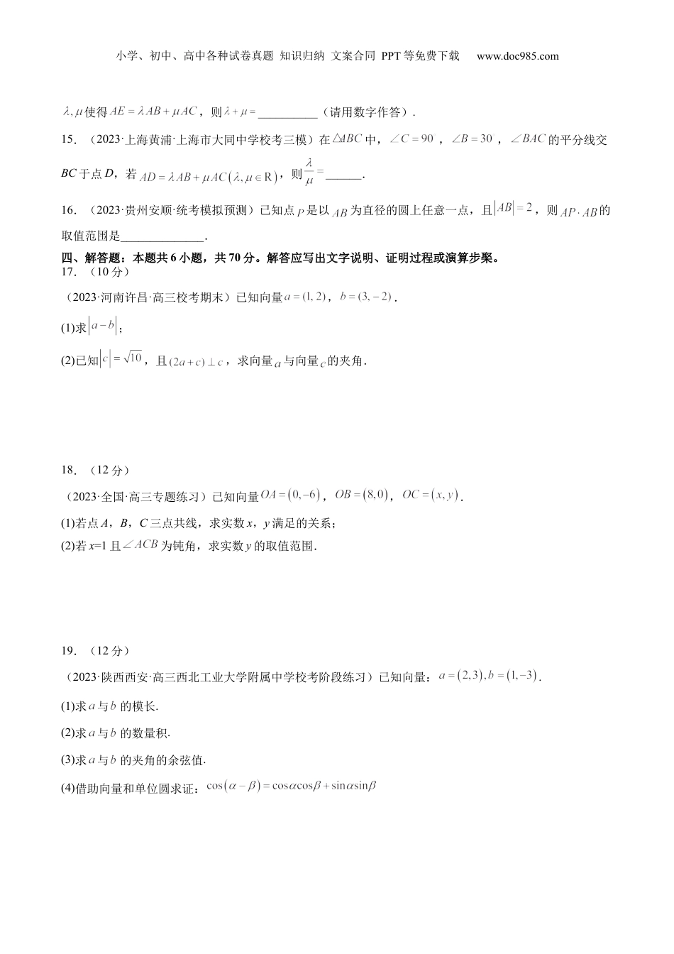 小学、初中、高中各种试卷真题知识归纳文案合同PPT等免费下载www.doc985.com第五章平面向量与复数(测试)时间:120分钟分值:150分第Ⅰ卷一、选择题:本题共8小题,每小题5分,共40分。在每小题给出的四个选项中,只有一项是符合题目要求的。1.(2023·新疆喀什·校考模拟预测)已知,,若与模相等,则=().A.3B.4C.5D.62.(2023·江西上饶·校联考模拟预测)已知向量,若与共线,则()A.4B.3C.2D.13.(2023·浙江绍兴·统考模拟预测)在中,,,设,,则()A.B.C.D.4.(2023·陕西商洛·统考三模)已知两个单位向量,的夹角为150°,则()A.7B.3C.D.15.(2023·全国·校联考三模)将向量绕坐标原点O顺时针旋转得到,则()A.0B.C.2D.6.(2023·全国·校联考三模)已知向量,则向量在向量方向上的投影为()A.B.C.5D.7.(2023·安徽六安·安徽省舒城中学校考模拟预测)已知平面向量,满足,,点D满足,E为的外心,则的值为()A.B.C.D.8.(2023·贵州安顺·统考模拟预测)已知O是平面上的一个定点,A、B、C是平面上不共线的三点,动点P满足,则点P的轨迹一定经过的()小学、初中、高中各种试卷真题知识归纳文案合同PPT等免费下载www.doc985.comA.重心B.外心C.内心D.垂心二、选择题:本题共4小题,每小题5分,共20分。在每小题给出的选项中,有多项符合题目要求。全部选对的得5分,部分选对的得2分,有选错的得0分。9.(2023·全国·模拟预测)有关平面向量的说法,下列错误的是()A.若,,则B.若与共线且模长相等,则C.若且与方向相同,则D.恒成立10.(2023·安徽六安·安徽省舒城中学校考模拟预测)已知向量,满足且,则下列结论正确的是()A.B.C.D.11.(2023·海南·海口市琼山华侨中学校联考模拟预测)已知向量,,,则下列说法正确的是()A.若,则B.若,则C.若,则D.若向量与的夹角为锐角,则实数的取值范围是12.(2023·湖北襄阳·襄阳四中校考模拟预测)在直角梯形中,为中点,分别为线段的两个三等分点,点为线段上任意一点,若,则的值可能是()A.1B.C.D.3第Ⅱ卷三、填空题:本题共4小题,每小题5分,共20分。13.(2023·河南·洛宁县第一高级中学校联考模拟预测)已知向量,,,若,则______.14.(2023·江苏镇江·江苏省镇江中学校考三模)在中,,点是的中点.若存在实数小学、初中、高中各种试卷真题知识归纳文案合同PPT等免费下载www.doc985.com使得,则__________(请用数字作答).15.(2023·上海黄浦·上海市大同中学校考三模)在中,,,的平分线交BC于点D,若,则______.16.(2023·贵州安顺·统考模拟预测)已知点是以为直径的圆上任意一点,且,则的取值范围是______________.四、解答题:本题共6小题,共70分。解答应写出文字说明、证明过程或演算步棸。17.(10分)(2023·河南许昌·高三校考期末)已知向量,.(1)求;(2)已知,且,求向量与向量的夹角.18.(12分)(2023·全国·高三专题练习)已知向量,,.(1)若点A,B,C三点共线,求实数x,y满足的关系;(2)若x=1且为钝角,求实数y的取值范围.19.(12分)(2023·陕西西安·高三西北工业大学附属中学校考阶段练习)已知向量:.(1)求与的模长.(2)求与的数量积.(3)求与的夹角的余弦值.(4)借助向量和单位圆求证:小学、初中、高中各种试卷真题知识归纳文案合同PPT等免费下载www.doc985.com20.(12分)(2023·全国·高三专题练习)在中,角A,B,C所对的边分别为a,b,c,.(1)求C的大小;(2)若点D满足,,,求c.21.(12分)(2023·四川广元·高一广元中学校考期中)已知H是内的一点,.(1)若H是的外心,求∠BAC;(2)若H是的垂心,求∠BAC的余弦值.22.(12分)(2023·山东聊城·高一统考期中)在中,角A,B,C所对的边分别为a,b,c.AD为BC边上的中线,点E,F分别为边AB,AC上动点,EF交AD于.已知,且.(1)求边的长度;(2)若,求的余弦值;(3)在(2)的条件下,若,求的取值范围.小学、初中、高中各种试卷真题知识归纳文案合同PPT等免费下载www.doc985.com
