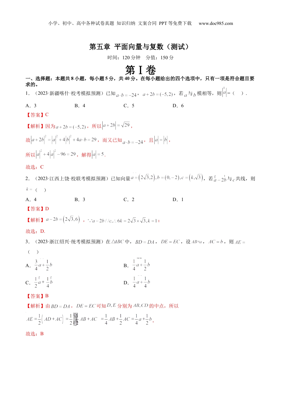 小学、初中、高中各种试卷真题知识归纳文案合同PPT等免费下载www.doc985.com第五章平面向量与复数(测试)时间:120分钟分值:150分第Ⅰ卷一、选择题:本题共8小题,每小题5分,共40分。在每小题给出的四个选项中,只有一项是符合题目要求的。1.(2023·新疆喀什·校考模拟预测)已知,,若与模相等,则=().A.3B.4C.5D.6【答案】C【解析】因为,所以,故,而又已知,且,所以,解得.故选:C2.(2023·江西上饶·校联考模拟预测)已知向量,若与共线,则()A.4B.3C.2D.1【答案】D【解析】,;故选:D.3.(2023·浙江绍兴·统考模拟预测)在中,,,设,,则()A.B.C.D.【答案】B【解析】由,可知分别为的中点,所以,故选:B小学、初中、高中各种试卷真题知识归纳文案合同PPT等免费下载www.doc985.com4.(2023·陕西商洛·统考三模)已知两个单位向量,的夹角为150°,则()A.7B.3C.D.1【答案】D【解析】,所以.故选:D.5.(2023·全国·校联考三模)将向量绕坐标原点O顺时针旋转得到,则()A.0B.C.2D.【答案】D【解析】根据题意可知.故选:D6.(2023·全国·校联考三模)已知向量,则向量在向量方向上的投影为()A.B.C.5D.【答案】B【解析】由题知,向量,所以.又,所以向量在向量方向上的投影为.故选:B.7.(2023·安徽六安·安徽省舒城中学校考模拟预测)已知平面向量,满足,,点D满足,E为的外心,则的值为()A.B.C.D.【答案】B小学、初中、高中各种试卷真题知识归纳文案合同PPT等免费下载www.doc985.com【解析】由题意,, ,解得:,∴两向量夹角, ,以为坐标原点,,垂直于所在直线为,轴建立平面直角坐标系,如图所示,则,设,由,知,解得,∴又E为的外心,∴,∴为等边三角形,∴,∴,∴.故选:B.8.(2023·贵州安顺·统考模拟预测)已知O是平面上的一个定点,A、B、C是平面上不共线的三点,动点P满足,则点P的轨迹一定经过的()A.重心B.外心C.内心D.垂心【答案】C【解析】因为为方向上的单位向量,为方向上的单位向量,小学、初中、高中各种试卷真题知识归纳文案合同PPT等免费下载www.doc985.com则的方向与的角平分线一致,由,可得,即,所以点P的轨迹为的角平分线所在直线,故点P的轨迹一定经过的内心.故选:C.二、选择题:本题共4小题,每小题5分,共20分。在每小题给出的选项中,有多项符合题目要求。全部选对的得5分,部分选对的得2分,有选错的得0分。9.(2023·全国·模拟预测)有关平面向量的说法,下列错误的是()A.若,,则B.若与共线且模长相等,则C.若且与方向相同,则D.恒成立【答案】ABC【解析】对于A选项,取,因为,,则、不一定共线,A错;对于B选项,若与共线且模长相等,则或,B错;对于C选项,任何两个向量不能比大小,C错;对于D选项,恒成立,D对.故选:ABC.10.(2023·安徽六安·安徽省舒城中学校考模拟预测)已知向量,满足且,则下列结论正确的是()A.B.C.D.【答案】AD【解析】因为,所以;因为,所以,所以,故C错误,D正确;因为,所以,A正确;因为,所以,B错误;小学、初中、高中各种试卷真题知识归纳文案合同PPT等免费下载www.doc985.com故选:AD.11.(2023·海南·海口市琼山华侨中学校联考模拟预测)已知向量,,,则下列说法正确的是()A.若,则B.若,则C.若,则D.若向量与的夹角为锐角,则实数的取值范围是【答案】AC【解析】对于A,因为,,所以,所以,A正确;对于B,因为,所以,所以,又,,所以,所以,B错误;对于C,由可得,,所以,所以,由,,可得,所以,所以,,所以,C正确;对于D,由向量与的夹角为锐角,可得,且向量与不共线,所以,且,所以实数的取值范围是,D错误;故选:AC.12.(2023·湖北襄阳·襄阳四中校考模拟预测)在直角梯形中,为中点,分别为线段的两个三等分点,点为线段上任意一点,若,则的值可能是()A.1B.C.D.3【答案】AB小学、初中、高中各种试卷真题知识归纳文案合同PPT等免费下载www.doc985.com【解析】如图,以A为坐标原点建立平面直角坐标系,不妨设,则,则设,则 ,∴,∴整理得,因为,所以故选:AB.第Ⅱ卷三、填空题...