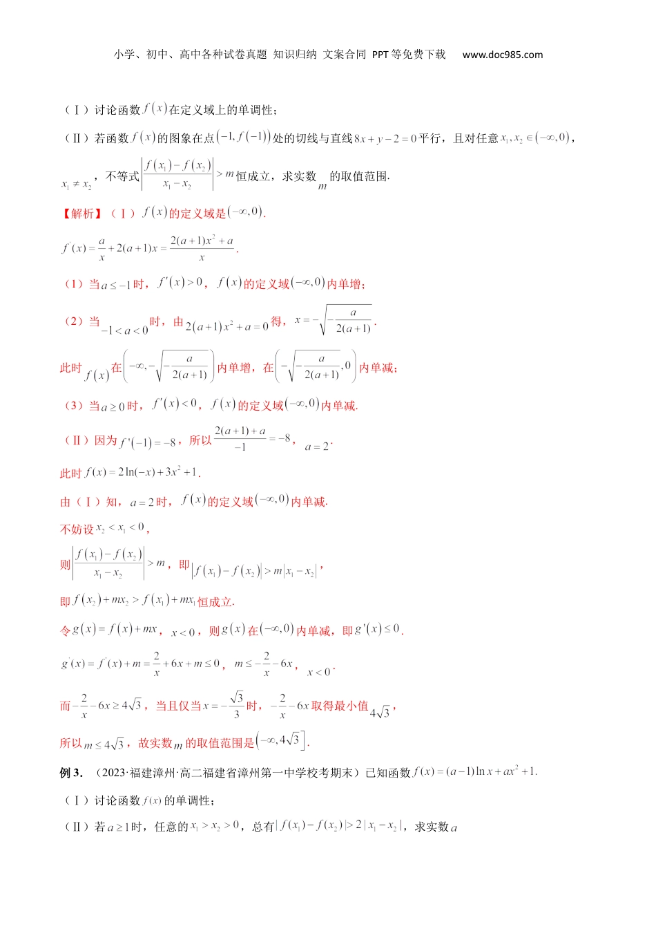 小学、初中、高中各种试卷真题知识归纳文案合同PPT等免费下载www.doc985.com重难点突破06双变量问题目录破解双参数不等式的方法:一是转化,即由已知条件入手,寻找双参数满足的关系式,并把含双参数的不等式转化为含单参数的不等式;二是巧构函数,再借用导数,判断函数的单调性,从而求其最值;三是回归双参的不等式的证明,把所求的最值应用到双参不等式,即可证得结果.题型一:双变量单调问题例1.(2023·全国·高三专题练习)已知函数.(1)当时,求曲线在处的切线方程;(2)设,证明:对任意,,.【解析】(1)当时,,,切点为求导,切线斜率曲线在处的切线方程为.(2),的定义域为,求导,在上单调递减.不妨假设,∴等价于.即.令,则.,,.从而在单调减少,故,即,故对任意.例2.(2023·安徽·校联考三模)设,函数.小学、初中、高中各种试卷真题知识归纳文案合同PPT等免费下载www.doc985.com(Ⅰ)讨论函数在定义域上的单调性;(Ⅱ)若函数的图象在点处的切线与直线平行,且对任意,,不等式恒成立,求实数的取值范围.【解析】(Ⅰ)的定义域是..(1)当时,,的定义域内单增;(2)当时,由得,.此时在内单增,在内单减;(3)当时,,的定义域内单减.(Ⅱ)因为,所以,.此时.由(Ⅰ)知,时,的定义域内单减.不妨设,则,即,即恒成立.令,,则在内单减,即.,,.而,当且仅当时,取得最小值,所以,故实数的取值范围是.例3.(2023·福建漳州·高二福建省漳州第一中学校考期末)已知函数(Ⅰ)讨论函数的单调性;(Ⅱ)若时,任意的,总有,求实数小学、初中、高中各种试卷真题知识归纳文案合同PPT等免费下载www.doc985.com的取值范围.【解析】(Ⅰ)()①当时,故在上单调递增;②当时,故在上单调递减;③当时,令解得则当时;当时,故在上单调递减;在上单调递增;综上所述:当时,故在上单调递增;当时,故在上单调递减;当时,在上单调递减;在上单调递增.(II)由(Ⅰ)知当时故在上单调递增;对任意即令因为所以在上单调递增;所以即在上恒成立故令则又因为所以>1当且仅当时取等号,所以,故不等式恒成立的条件是即.小学、初中、高中各种试卷真题知识归纳文案合同PPT等免费下载www.doc985.com所以,实数的取值范围为.变式1.(2023·全国·模拟预测)已知函数,,且.(1)当时,讨论的单调性;(2)当时,若对任意的,不等式恒成立,求实数的取值范围.【解析】(1)函数的定义域为,将代入的解析式,得,求导得.当时,,故在上单调递增;当时,令,得.所以当时,,当时,,于是在区间上单调递减,在区间上单调递增.综上,当时,在上单调递增;当时,在区间上单调递减,在区间上单调递增.(2)当时,.因为,所以不等式可化为,所以对任意的恒成立,所以函数为上的减函数,所以在上恒成立,可得在上恒成立,设,则,令,得.所以当上单调递增,在区间上单调递减,所以,得.所以实数的取值范围为.变式2.(2023·天津南开·高三南开大学附属中学校考开学考试)已知函数.小学、初中、高中各种试卷真题知识归纳文案合同PPT等免费下载www.doc985.com(1)讨论的单调性;(2)当时,证明;(3)若对任意的不等正数,总有,求实数的取值范围.【解析】(1)由题意得:定义域为,;当时,,,在上恒成立,在上单调递增;当时,令,解得:,当时,;当时,;在上单调递增,在上单调递减;综上所述:当时,在上单调递增;当时,在上单调递增,在上单调递减.(2)由(1)知:;要证,只需证,即证;设,则,当时,;当时,;在上单调递增,在上单调递减,;又,,即.(3)不妨设,则由得:,即,令,则在上单调递增,小学、初中、高中各种试卷真题知识归纳文案合同PPT等免费下载www.doc985.com在上恒成立,即,又,;令,则,令,解得:(舍)或,当时,;当时,;在上单调递增,在上单调递减,,,解得:;的取值范围为.题型二:双变量不等式:转化为单变量问题例4.(2023·全国·高三专题练习)已知函数.(1)讨论的单调性;(2)已知,若存在两个极值点,且,求的取值范围.【解析】(1)函数的定义域为,,当时,,当且仅当即“=”,则,在上单调递减...