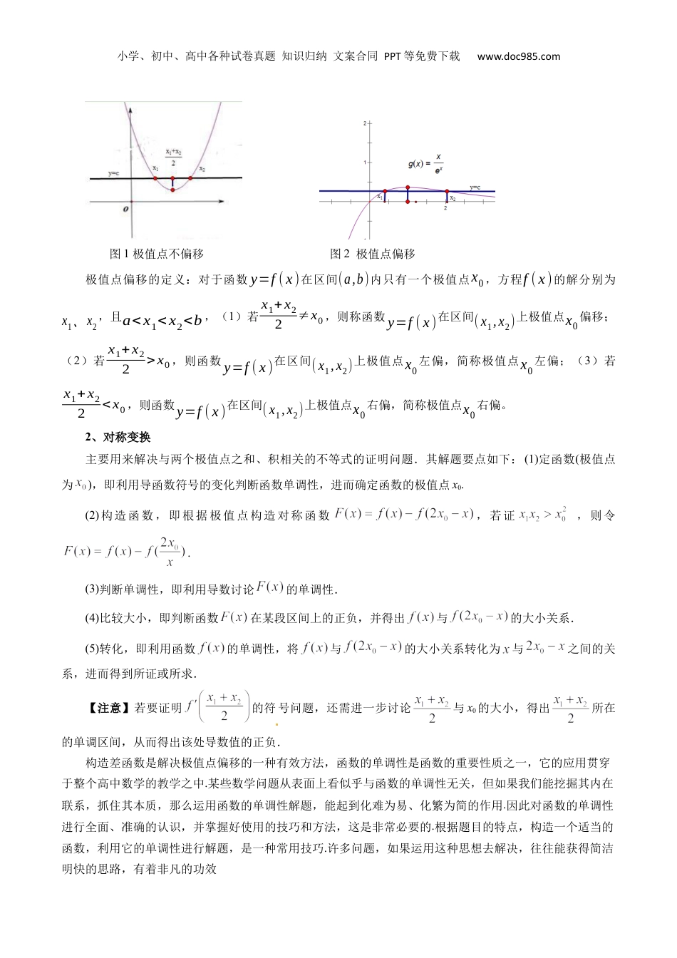小学、初中、高中各种试卷真题知识归纳文案合同PPT等免费下载www.doc985.com重难点突破05极值点偏移问题与拐点偏移问题目录1、极值点偏移的相关概念所谓极值点偏移,是指对于单极值函数,由于函数极值点左右的增减速度不同,使得函数图像没有对称性。若函数f(x)在x=x0处取得极值,且函数y=f(x)与直线y=b交于A(x1,b),B(x2,b)两点,则AB的中点为M(x1+x22,b),而往往x0≠x1+x22。如下图所示。小学、初中、高中各种试卷真题知识归纳文案合同PPT等免费下载www.doc985.com图1极值点不偏移图2极值点偏移极值点偏移的定义:对于函数y=f(x)在区间(a,b)内只有一个极值点x0,方程f(x)的解分别为x1、x2,且a<x1<x2<b,(1)若x1+x22≠x0,则称函数y=f(x)在区间(x1,x2)上极值点x0偏移;(2)若x1+x22>x0,则函数y=f(x)在区间(x1,x2)上极值点x0左偏,简称极值点x0左偏;(3)若x1+x22<x0,则函数y=f(x)在区间(x1,x2)上极值点x0右偏,简称极值点x0右偏。2、对称变换主要用来解决与两个极值点之和、积相关的不等式的证明问题.其解题要点如下:(1)定函数(极值点为),即利用导函数符号的变化判断函数单调性,进而确定函数的极值点x0.(2)构造函数,即根据极值点构造对称函数,若证,则令.(3)判断单调性,即利用导数讨论的单调性.(4)比较大小,即判断函数在某段区间上的正负,并得出与的大小关系.(5)转化,即利用函数的单调性,将与的大小关系转化为与之间的关系,进而得到所证或所求.【注意】若要证明的符号问题,还需进一步讨论与x0的大小,得出所在的单调区间,从而得出该处导数值的正负.构造差函数是解决极值点偏移的一种有效方法,函数的单调性是函数的重要性质之一,它的应用贯穿于整个高中数学的教学之中.某些数学问题从表面上看似乎与函数的单调性无关,但如果我们能挖掘其内在联系,抓住其本质,那么运用函数的单调性解题,能起到化难为易、化繁为简的作用.因此对函数的单调性进行全面、准确的认识,并掌握好使用的技巧和方法,这是非常必要的.根据题目的特点,构造一个适当的函数,利用它的单调性进行解题,是一种常用技巧.许多问题,如果运用这种思想去解决,往往能获得简洁明快的思路,有着非凡的功效小学、初中、高中各种试卷真题知识归纳文案合同PPT等免费下载www.doc985.com3、应用对数平均不等式证明极值点偏移:①由题中等式中产生对数;②将所得含对数的等式进行变形得到;③利用对数平均不等式来证明相应的问题.4、比值代换是一种将双变量问题化为单变量问题的有效途径,然后构造函数利用函数的单调性证明题中的不等式即可.题型一:极值点偏移:加法型例1.(2023·河南周口·高二校联考阶段练习)已知函数,(1)若,求的单调区间;(2)若,,是方程的两个实数根,证明:.例2.(2023·河北石家庄·高三校联考阶段练习)已知函数.(1)求函数的单调区间;(2)若函数有两个零点、,证明.例3.(2023·广东深圳·高三红岭中学校考期末)已知函数.(1)讨论函数的单调性;(2)①证明函数(为自然对数的底数)在区间内有唯一的零点;②设①中函数的零点为,记(其中表示中的较小值),若小学、初中、高中各种试卷真题知识归纳文案合同PPT等免费下载www.doc985.com在区间内有两个不相等的实数根,证明:.变式1.(2023·重庆沙坪坝·重庆南开中学校考模拟预测)已知函数为其极小值点.(1)求实数的值;(2)若存在,使得,求证:.变式2.(2023·湖北武汉·高二武汉市第六中学校考阶段练习)已知函数,a为实数.(1)求函数的单调区间;(2)若函数在处取得极值,是函数的导函数,且,,证明:变式3.(2023·江西景德镇·统考模拟预测)已知函数(1)若函数在定义域上单调递增,求的最大值;(2)若函数在定义域上有两个极值点和,若,,求的最小值.变式4.(2023·全国·模拟预测)已知函数.(1)讨论函数的极值点的个数;小学、初中、高中各种试卷真题知识归纳文案合同PPT等免费下载www.doc985.com(2)若函数恰有三个极值点、、,且,求的最大值.变式5.(2023·广西玉林·高二广西壮族自治区北流市高级中学校联考阶段练习)已知函数.(1)讨论函数f(x)的单调性;(2)当时,若,求证:变式6.(2023·...