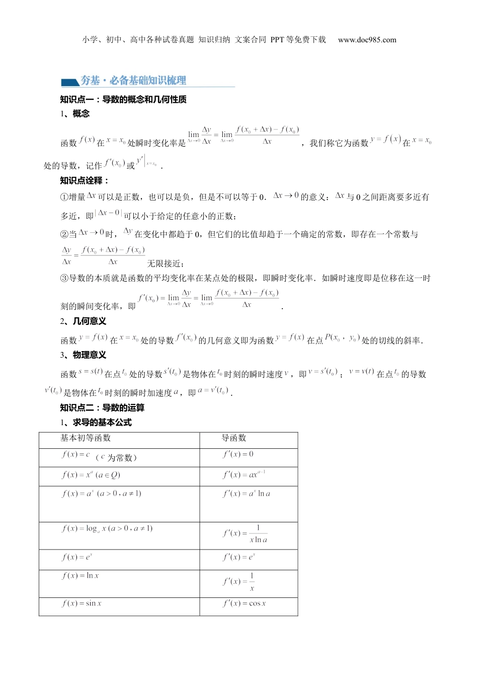 小学、初中、高中各种试卷真题知识归纳文案合同PPT等免费下载www.doc985.com第01讲导数的概念与运算目录考点要求考题统计考情分析(1)了解导数的概念、掌握基本初等函数的导数.(2)通过函数图象,理解导数的几何意义.(3)能够用导数公式和导数的运算法则求简单函数的导数,能求简单的复合函数的导数.2022年I卷第15题,5分2021年甲卷第13题,5分2021年I卷第7题,5分高考对合的考相对定,考内集查稳查容、率、题型、度均变化不大.频难重点考导数的计算、四则运算法则查的应用和求切线方程为.主小学、初中、高中各种试卷真题知识归纳文案合同PPT等免费下载www.doc985.com知识点一:导数的概念和几何性质1、概念函数在处瞬时变化率是,我们称它为函数在处的导数,记作或.知识点诠释:①增量可以是正数,也可以是负,但是不可以等于0.的意义:与0之间距离要多近有多近,即可以小于给定的任意小的正数;②当时,在变化中都趋于0,但它们的比值却趋于一个确定的常数,即存在一个常数与无限接近;③导数的本质就是函数的平均变化率在某点处的极限,即瞬时变化率.如瞬时速度即是位移在这一时刻的瞬间变化率,即.2、几何意义函数在处的导数的几何意义即为函数在点处的切线的斜率.3、物理意义函数在点处的导数是物体在时刻的瞬时速度,即;在点的导数是物体在时刻的瞬时加速度,即.知识点二:导数的运算1、求导的基本公式基本初等函数导函数(为常数)小学、初中、高中各种试卷真题知识归纳文案合同PPT等免费下载www.doc985.com2、导数的四则运算法则(1)函数和差求导法则:;(2)函数积的求导法则:;(3)函数商的求导法则:,则.3、复合函数求导数复合函数的导数和函数,的导数间关系为:【解题方法总结】1、在点的切线方程切线方程的计算:函数在点处的切线方程为,抓住关键.2、过点的切线方程设切点为,则斜率,过切点的切线方程为:,又为切线方程过点因,所以然后解出的值.(有几个值,就有几条切线)意:在题目要分题目的点在线在线.注做此类时清提供曲上还是曲外题型一:导数的定义【例1】(2023·全国·高三专题练习)已知函数的图象如图所示,函数的导数为,则()A.B.C.D.【对点训练1】(2023·云南楚雄·高三统考期末)已知某容器的高度为20cm,现在向容器内注入液体,且小学、初中、高中各种试卷真题知识归纳文案合同PPT等免费下载www.doc985.com容器内液体的高度h(单位:cm)与时间t(单位:s)的函数关系式为,当时,液体上升高度的瞬时变化率为3cm/s,则当时,液体上升高度的瞬时变化率为()A.5cm/sB.6cm/sC.8cm/sD.10cm/s【对点训练2】(2023·河北衡水·高三衡水市第二中学期末)已知函数的导函数是,若,则()A.B.1C.2D.4【对点训练3】(2023·全国·高三专题练习)若函数在处可导,且,则()A.1B.C.2D.【对点训练4】(2023·高三课时练习)若在处可导,则可以等于().A.B.C.D.【解题方法总结】对所给函数式经过添项、拆项等恒等变形与导数定义结构相同,然后根据导数定义直接写出.题型二:求函数的导数【例2】(2023·全国·高三专题练习)求下列函数的导数.(1);(2);(3)(4);小学、初中、高中各种试卷真题知识归纳文案合同PPT等免费下载www.doc985.com【对点训练5】(2023·高三课时练习)求下列函数的导数:(1);(2);(3);(4);(5);(6).【对点训练6】(2023·海南·统考模拟预测)在等比数列中,,函数,则__________.【对点训练7】(2023·辽宁大连·育明高中校考一模)已知可导函数,定义域均为,对任意满足,且,求__________.【对点训练8】(2023·河南·高三校联考阶段练习)已知函数的导函数为,且,则______.【对点训练9】(2023·全国·高三专题练习)已知函数,则__________.【解题方法总结】对所给函数求导,其方法是利用和、差、积、商及复合函数求导法则,直接转化为基本函数求导问题.题型:导数的几何意义三方向1、在点P处切线【例3】(2023·广东广州·统考模拟预测)曲线在点处的切线方程为__________.小学、初中、高中各种试卷真题知识归纳文案合同PPT等免费下载www.doc985.com【对点训练10...