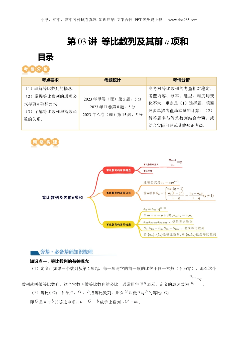 小学、初中、高中各种试卷真题知识归纳文案合同PPT等免费下载www.doc985.com第03讲等比数列及其前n项和目录考点要求考题统计考情分析(1)理解等比数列的概念.(2)掌握等比数列的通项公式与前n项和公式.(3)了解等比数列与指数函数的关系.2023年甲卷(理)第5题,5分2023年II卷第8题,5分2023年乙卷(理)第15题,5分高考对等比数列的考相对定,查稳考内容、频率、题型、难度均变查化不大.重点是(1)选择题、填空题多单考基本量的计算;(独查2)解答题多与等差数列结合考,或查结合实问题或其知识考.际他查知识点一.等比数列的有关概念(1)定义:如果一个数列从第2项起,每一项与它的前一项的比等于同一常数(不为零),那么这个数列就叫做等比数列.这个常数叫做等比数列的公比,通常用字母表示,定义的表达式为.(2)等比中项:如果,,成等比数列,那么叫做与的等比中项.即是与的等比中项⇔,,成等比数列⇒.小学、初中、高中各种试卷真题知识归纳文案合同PPT等免费下载www.doc985.com知识点二.等比数列的有关公式(1)等比数列的通项公式设等比数列的首项为,公比为,则它的通项公式.推广形式:(2)等比数列的前n项和公式等比数列的公比为,其前项和为注①等比数列的前项和公式有两种形式,在求等比数列的前项和时,首先要判断公比是否为1,再由的情况选择相应的求和公式,当不能判断公比是否为1时,要分与两种情况讨论求解.②已知(项数),则利用求解;已知,则利用求解.③,为关于的指数型函数,且系数与常数互为相反数.知识点三.等比数列的性质(1)等比中项的推广.若时,则,特别地,当时,.(2)①设为等比数列,则(为非零常数),,仍为等比数列.②设与为等比数列,则也为等比数列.(3)等比数列的单调性(等比数列的单调性由首项与公比决定).当或时,为递增数列;当或时,为递减数列.(4)其生等比数列.他衍若已知等比数列,公比为,前项和为,则:①等间距取抽为等比数列,公比为.②等长度取截为等比数列,公比为(当时,不为偶数).小学、初中、高中各种试卷真题知识归纳文案合同PPT等免费下载www.doc985.com【解题方法总结】(1)若,则.(2)若,(项数相同)是等比数列,则,,,,仍是等比数列.(3)在等比数列中,等距离取出若干项也构成一个等比数列,即为等比数列,公比为.(4)公比不为-1的等比数列的前项和为,则,,仍成等比数列,其公比为.(5)为等比数列,若,则成等比数列.(6)当,时,是成等比数列的充要条件,此时.(7)有穷等比数列中,与首末两项等距离的两项的积相等.特别地,若项数为奇数时,还等于中间项的平方.(8)若为正项等比数列,则为等差数列.(9)若为等差数列,则为等比数列.(10)若既是等差数列又是等比数列是非零常数列.题型一:等比数列的基本运算例1.(2023·北京·高三汇文中学校考阶段练习)在等比数列中,,,则等于()A.9B.72C.9或70D.9或【答案】D【解析】由题意,,在等比数列中,,,设公比为,,即,解得或,∴,当时,,小学、初中、高中各种试卷真题知识归纳文案合同PPT等免费下载www.doc985.com当时,.故选:D.例2.(2023·全国·高三专题练习)已知递增的等比数列中,前3项的和为7,前3项的积为8,则的值为()A.2B.4C.6D.8【答案】D【解析】由前3项的和为7,得前3项的积为8,得,即,则,代入,得,即,解得或,因为为递增的等比数列,所以,则,所以,故选:D.例3.(2023·浙江温州·乐清市知临中学校考模拟预测)已知等比数列的前n项和为,公比为q,且,则()A.B.C.D.【答案】D【解析】因为,所以,所以,所以,解得,A错误,C错误,D正确,所以,B错误;故选:D.变式1.(2023·四川遂宁·射洪中学校考模拟预测)在等比数列中,若,,则公比q应为()A.B.C.D.-2【答案】D小学、初中、高中各种试卷真题知识归纳文案合同PPT等免费下载www.doc985.com【解析】因为,解得q=-2.故选:D变式2.(2023·全国·高三专题练习)设等比数列的各项均为正数,前n项和,若,,则()A.B.C.15D.40【答案】C【解析】由题知,即,即,即.由题知,所以.所...