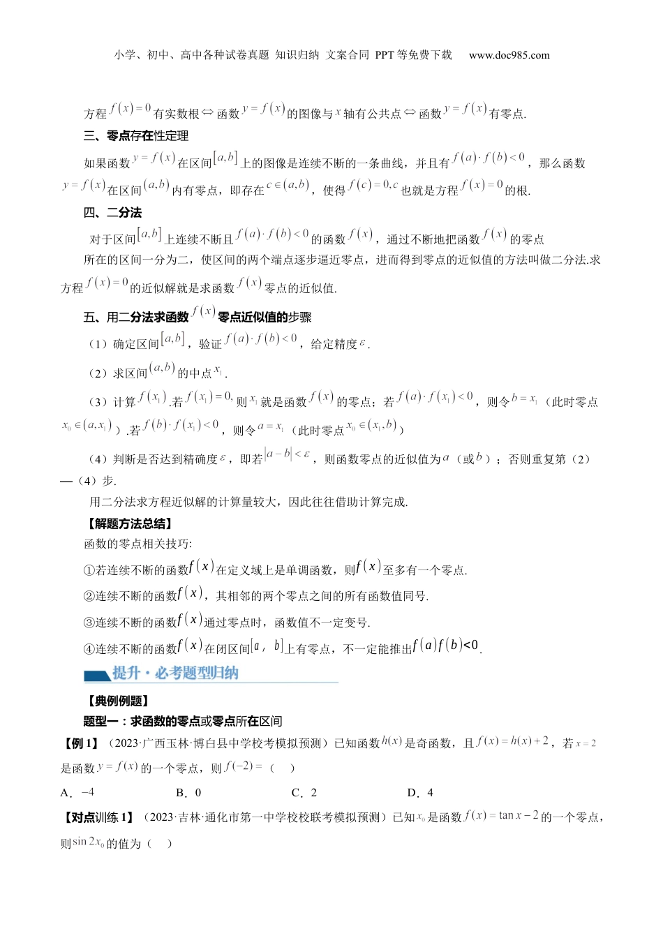 小学、初中、高中各种试卷真题知识归纳文案合同PPT等免费下载www.doc985.com第07讲函数与方程目录考点要求考题统计考情分析(1)理解函数的零点与方程的解的联系.(2)理解函数零点存在定理,并能简单应用.(3)了解用二分法求方程的近似解.2022年天津卷第15题,5分2021年天津卷第9题,5分2021年北京卷第15题,5分从近几年高考题来,高考对函数命看与方程也常以不同的方式进考经行,如:函数零点的个数问题、查比位问题、近似解问题,以选题、置择填题、解题等形式出在试卷中的空答现不同,且考得较为、位置查灵活深,值得广大关.刻师生注一、函数的零点对于函数,我们把使的实数叫做函数的零点.、方程的与函数零点的关二根系小学、初中、高中各种试卷真题知识归纳文案合同PPT等免费下载www.doc985.com方程有实数根函数的图像与轴有公共点函数有零点.、零点在三存性定理如果函数在区间上的图像是连续不断的一条曲线,并且有,那么函数在区间内有零点,即存在,使得也就是方程的根.、分法四二对于区间上连续不断且的函数,通过不断地把函数的零点所在的区间一分为二,使区间的两个端点逐步逼近零点,进而得到零点的近似值的方法叫做二分法.求方程的近似解就是求函数零点的近似值.、分法求函数五用二零点近似值的步骤(1)确定区间,验证,给定精度.(2)求区间的中点.(3)计算.若则就是函数的零点;若,则令(此时零点).若,则令(此时零点)(4)判断是否达到精确度,即若,则函数零点的近似值为(或);否则重复第(2)(—4)步.用二分法求方程近似解的计算量较大,因此往往借助计算完成.【解题方法总结】函数的零点相关技巧:①若连续不断的函数f(x)在定义域上是单调函数,则f(x)至多有一个零点.②连续不断的函数f(x),其相邻的两个零点之间的所有函数值同号.③连续不断的函数f(x)通过零点时,函数值不一定变号.④连续不断的函数f(x)在闭区间[a,b]上有零点,不一定能推出f(a)f(b)<0.【典例例题】题型一:求函数的零点零点在或所区间【例1】(2023·广西玉林·博白县中学校考模拟预测)已知函数是奇函数,且,若是函数的一个零点,则()A.B.0C.2D.4【对点训练1】(2023·吉林·通化市第一中学校校联考模拟预测)已知是函数的一个零点,则的值为()小学、初中、高中各种试卷真题知识归纳文案合同PPT等免费下载www.doc985.comA.B.C.D.【对点训练2】(2023·全国·高三专题练习)已知函数的零点依次为,则()A.B.C.D.【对点训练3】(2023·全国·高三专题练习)已知,若是方程的一个解,则可能存在的区间是()A.B.C.D.【解题总结】求函数f(x)零点的方法:(1)代数法,即求方程f(x)=0的实根,适合于宜因式分解的多项式;(2)几何法,即利用函数y=f(x)的图像和性质找出零点,适合于宜作图的基本初等函数.题型:函数的零点数的值二利用确定参取范围【例2】(2023·山西阳泉·统考三模)函数在区间存在零点.则实数m的取值范围是()A.B.C.D.【对点训练4】(2023·全国·高三专题练习)函数的一个零点在区间内,则实数的取值范围是()A.B.C.D.【对点训练5】(2023·河北·高三学业考试)已知函数是R上的奇函数,若函数的零点在区间内,则的取值范围是()A.B.C.D.【对点训练6】(2023·浙江绍兴·统考二模)已知函数,若在区间上有零点,则的最大值为__________.【对点训练7】(2023·上海浦东新·高三上海市进才中学校考阶段练习)已知函数在上有零点,则实数的取值范围___________.【解题总结】小学、初中、高中各种试卷真题知识归纳文案合同PPT等免费下载www.doc985.com本类问题应细致观察、分析图像,利用函数的零点及其他相关性质,建立参数关系,列关于参数的不等式,解不等式,从而获解.题型:方程的个数与函数零点的在问题三根存性【例3】(2023·黑龙江哈尔滨·哈尔滨三中校考模拟预测)已知实数,满足,,则________.【对点训练8】(2023·新疆·校联考二模)已知函数,若存在唯一的零点,且,则的取值范围是________.【对点训练9】(2023·天津滨海新·统考三模)已知函数,若函数在上恰有三个不同的零点,则的取值范围是________....