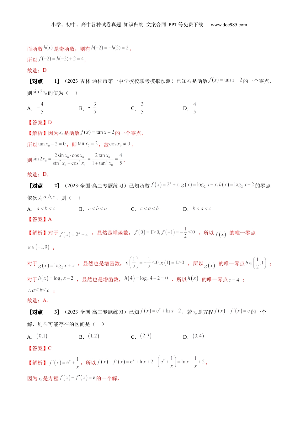 小学、初中、高中各种试卷真题知识归纳文案合同PPT等免费下载www.doc985.com第07讲函数与方程目录考点要求考题统计考情分析(1)理解函数的零点与方程的解的联系.(2)理解函数零点存在定理,并能简单应用.(3)了解用二分法求方程的近似解.2022年天津卷第15题,5分2021年天津卷第9题,5分2021年北京卷第15题,5分从近几年高考题来,高考对函数命看与方程也经常以不同的方式进考行,比如:函数零点的个数问题、查位问题、近似解问题,以选题、置填择题、解答题等形式出在试卷中的空现不同,且考得较为、位置灵活深查,值得广大关.刻生注师一、函数的零点对于函数,我们把使的实数叫做函数的零点.二、方程的二与函数零点的关二小学、初中、高中各种试卷真题知识归纳文案合同PPT等免费下载www.doc985.com方程有实数根函数的图像与轴有公共点函数有零点.二、零点二在二二二如果函数在区间上的图像是连续不断的一条曲线,并且有,那么函数在区间内有零点,即存在,使得也就是方程的根.二、二分法对于区间上连续不断且的函数,通过不断地把函数的零点所在的区间一分为二,使区间的两个端点逐步逼近零点,进而得到零点的近似值的方法叫做二分法.求方程的近似解就是求函数零点的近似值.二、二二分法求函数零点近似值的二二(1)确定区间,验证,给定精度.(2)求区间的中点.(3)计算.若则就是函数的零点;若,则令(此时零点).若,则令(此时零点)(4)判断是否达到精确度,即若,则函数零点的近似值为(或);否则重复第(2)(—4)步.用二分法求方程近似解的计算量较大,因此往往借助计算完成.【解题方法总结】函数的零点相关技巧:①若连续不断的函数f(x)在定义域上是单调函数,则f(x)至多有一个零点.②连续不断的函数f(x),其相邻的两个零点之间的所有函数值同号.③连续不断的函数f(x)通过零点时,函数值不一定变号.④连续不断的函数f(x)在闭区间[a,b]上有零点,不一定能推出f(a)f(b)<0.【典例例题】题型一:求函数的零点二零点二在二二【例1】(2023·广西玉林·博白县中学校考模拟预测)已知函数是奇函数,且,若是函数的一个零点,则()A.B.0C.2D.4【答案】D【解析】因为是函数的一个零点,则,于是,即,小学、初中、高中各种试卷真题知识归纳文案合同PPT等免费下载www.doc985.com而函数是奇函数,则有,所以.故选:D【对点二二1】(2023·吉林·通化市第一中学校校联考模拟预测)已知是函数的一个零点,则的值为()A.B.C.D.【答案】D【解析】因为是函数的一个零点,所以,即,故,则.故选:D.【对点二二2】(2023·全国·高三专题练习)已知函数的零点依次为,则()A.B.C.D.【答案】A【解析】对于,显然是增函数,,所以的唯一零点;对于,显然也是增函数,,所以的唯一零点;对于,显然也是增函数,,所以的唯一零点;;故选:A.【对点二二3】(2023·全国·高三专题练习)已知,若是方程的一个解,则可能存在的区间是()A.B.C.D.【答案】C【解析】,所以,因为是方程的一个解,小学、初中、高中各种试卷真题知识归纳文案合同PPT等免费下载www.doc985.com所以是方程的解,令,则,当时,恒成立,所以单调递增,又,所以.故选:C.【解题总结】求函数f(x)零点的方法:(1)代数法,即求方程f(x)=0的实根,适合于宜因式分解的多项式;(2)几何法,即利用函数y=f(x)的图像和性质找出零点,适合于宜作图的基本初等函数.题型:函数的零点数的值二利用确定参取范【例2】(2023·山西阳泉·统考三模)函数在区间存在零点.则实数m的取值范围是()A.B.C.D.【答案】B【解析】由在上单调递增,在上单调递增,得函数在区间上单调递增,因为函数在区间存在零点,所以,即,解得,所以实数m的取值范围是.故选:B.【对点二二4】(2023·全国·高三专题练习)函数的一个零点在区间内,则实数的取值范围是()A.B.C.D.【答案】D【解析】 和在上是增函数,小学、初中、高中各种试卷真题知识归纳文案合同PPT等免费下载www.doc985.com∴在上是增函数,∴只需即可,即,解得.故选:D.【对点二二5】(2023·河北·高三学业考试)已知函数是R上的奇函数,若函数...
