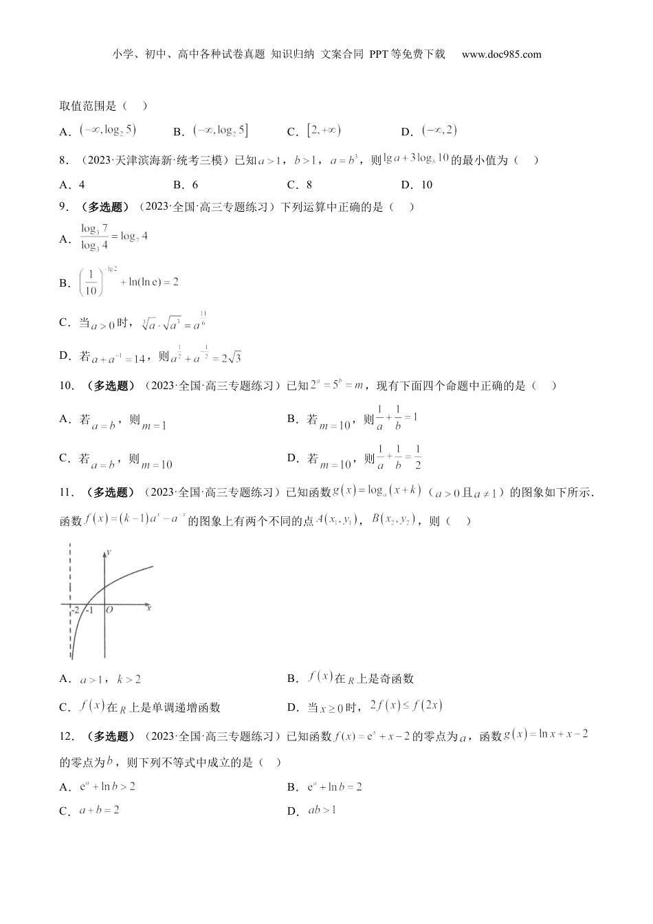 小学、初中、高中各种试卷真题知识归纳文案合同PPT等免费下载www.doc985.com第05讲对数与对数函数(模拟精练+真题演练)1.(2023·上海金山·上海市金山中学校考模拟预测)“”是“”的()A.充分不必要条件B.必要不充分条件C.充要条件D.既不充分也不必要条件2.(2023·安徽·校联考模拟预测)19世纪美国天文学家西蒙·纽康在翻阅对数表时,偶然发现表中以1开头的数出现的频率更高.约半个世纪后,物理学家本·福特又重新发现这个现象,从实际生活得出的大量数据中,以1开头的数出现的频数约为总数的三成,并提出本·福特定律,即在大量进制随机数据中,以开头的数出现的概率为,如斐波那契数、阶乘数、素数等都比较符合该定律.后来常有数学爱好者用此定律来检验某些经济数据、选举数据等大数据的真实性.若(,),则的值为()A.2B.3C.4D.53.(2023·河南·校联考模拟预测)已知,,有以下命题:①;②;③;④.其中正确命题的序号是()A.②③B.①③C.①④D.②④4.(2023·河北石家庄·统考三模)18世纪数学家欧拉研究调和级数得到了以下的结果:当很大时,(常数).利用以上公式,可以估计的值为()A.B.C.D.5.(2023·山西阳泉·统考三模)函数在区间存在零点.则实数m的取值范围是()A.B.C.D.6.(2023·安徽黄山·统考三模)“”是“函数在区间上单调递增”的()A.充分不必要条件B.充要条件C.必要不充分条件D.既不充分也不必要条件7.(2023·内蒙古赤峰·校联考三模)已知函数,若方程有解,则实数b的小学、初中、高中各种试卷真题知识归纳文案合同PPT等免费下载www.doc985.com取值范围是()A.B.C.D.8.(2023·天津滨海新·统考三模)已知,,,则的最小值为()A.4B.6C.8D.109.(多选题)(2023·全国·高三专题练习)下列运算中正确的是()A.B.C.当时,D.若,则10.(多选题)(2023·全国·高三专题练习)已知,现有下面四个命题中正确的是()A.若,则B.若,则C.若,则D.若,则11.(多选题)(2023·全国·高三专题练习)已知函数(且)的图象如下所示.函数的图象上有两个不同的点,,则()A.,B.在上是奇函数C.在上是单调递增函数D.当时,12.(多选题)(2023·全国·高三专题练习)已知函数的零点为,函数的零点为,则下列不等式中成立的是()A.B.C.D.小学、初中、高中各种试卷真题知识归纳文案合同PPT等免费下载www.doc985.com13.(2023·四川成都·成都七中校考模拟预测)设定义在上且,则______.14.(2023·全国·模拟预测)写出一个同时具有下列性质①②③的函数______.①;②当时,(为的导函数);③函数的图象关于点对称.15.(2023·天津和平·统考二模)设,,,若,,则的最大值为__________.16.(2023·辽宁·校联考三模)已知函数,若,且,则实数的取值范围是__________.17.(2023·全国·高三专题练习)求值:(1);(2);(3);(4).(5)2log32-log3+log38-;(6)(log2125+log425+log85)·(log52+log254+log1258).(7)lg25+lg2+lg+lg(0.01)-1;(8)(lg2)2+lg2·lg50+lg25;(9)(log32+log92)·(log43+log83);(10)2log32-log3+log38-3log55;18.(2023·全国·高三专题练习)(1)计算;(2)已知,求实数x的值;小学、初中、高中各种试卷真题知识归纳文案合同PPT等免费下载www.doc985.com(3)若,,用a,b,表示.19.(2023·四川成都·统考二模)已知函数(1)当时,求函数的定义域;(2)当函数的值域为R时,求实数的取值范围.20.(2023·全国·高三专题练习)已知函数,有意义时的取值范围为,其中为实数.(1)求的值;(2)写出函数的单调区间,并求函数的最大值.21.(2023·海南省直辖县级单位·校联考一模)已知函数为奇函数.(1)求常数的值;(2)当时,判断的单调性;(3)若函数,且在区间上没有零点,求实数的取值范围.22.(2023·高三课时练习)已知函数的定义域为,值域为,且函数为上的严格减函数,求实数a的取值范围.小学、初中、高中各种试卷真题知识归纳文案合同PPT等免费下载www.doc985.com1.(2022·北京·统考高考真题)在北京冬奥会上,国...