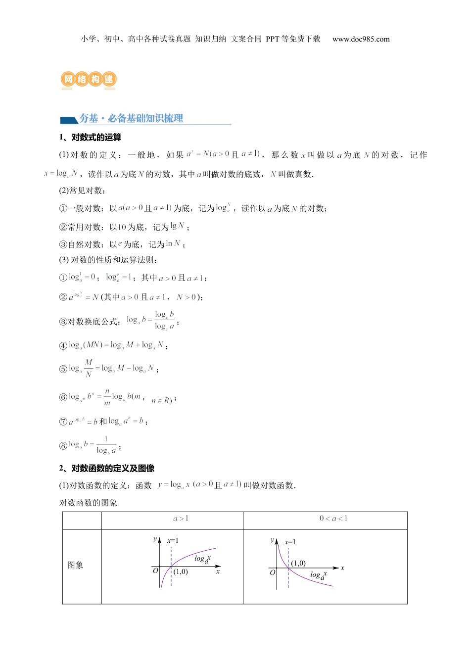 小学、初中、高中各种试卷真题知识归纳文案合同PPT等免费下载www.doc985.com第05讲对数与对数函数目录考点要求考题统计考情分析(1)理解对数的概念及运算性质,能用换底公式将一般对数转化成自然对数或常用对数.(2)通过实例,了解对数函数的概念,会画对数函数的图象,理解对数函数的单调性与特殊点.(3)了解指数函数与对数函数(,且)互为反函数.2022年天津卷第6题,5分2022年浙江卷第7题,5分2022年I卷I卷第7题,5分近五年的高考从情况来,对数运算与对数函数看是高考的一个重点也是一个点,常与二次函数、难函数、指数函数、三角幂函数综合,考数值大小查的和函数方程问题比较.小学、初中、高中各种试卷真题知识归纳文案合同PPT等免费下载www.doc985.com1、对数式的运算(1)对数的定义:一般地,如果且,那么数叫做以为底的对数,记作,读作以为底的对数,其中叫做对数的底数,叫做真数.(2)常见对数:①一般对数:以且为底,记为,读作以为底的对数;②常用对数:以为底,记为;③自然对数:以为底,记为;(3)对数的性质和运算法则:①;;其中且;②(其中且,);③对数换底公式:;④;⑤;⑥,;⑦和;⑧;2、对数函数的定义及图像(1)对数函数的定义:函数且叫做对数函数.对数函数的图象图象xyx=1(1,0)xalogOxyx=1(1,0)xalogO小学、初中、高中各种试卷真题知识归纳文案合同PPT等免费下载www.doc985.com性质定义域:值域:过定点,即时,在上增函数在上是减函数当时,,当时,当时,,当时,【解题方法总结】1、对数函数常用技巧在同一坐标系内,当时,随的增大,对数函数的图象愈靠近轴;当时,对数函数的图象随的增大而远离轴.(见下图)yx11a增大a增大xxxxa4a3a2a1loglogloglogO题一对数运算及对数方程、对数式型:不等【例1】(2023·四川成都·成都七中校考模拟预测)______.【答案】【解析】.故答案为:【对点训练1】(2023·辽宁沈阳·沈阳二中校考模拟预测)已知,,则______.【答案】/【解析】由题设,则且,所以,即,故.故答案为:小学、初中、高中各种试卷真题知识归纳文案合同PPT等免费下载www.doc985.com【对点训练2】(2023·上海徐汇·位育中学校考模拟预测)方程的解集为________.【答案】【解析】因为,则,解得,所以方程的解集为.故答案为:【对点训练3】(2023·山东淄博·统考二模)设,满足,则__________.【答案】/0.5【解析】令,则,所以,整理得,解得(负值舍去),所以.故答案为:.【对点训练4】(2023·天津南开·统考二模)计算的值为______.【答案】8【解析】原式.故答案为:8.【对点训练5】(2023·全国·高三专题练习)若,,用a,b表示____________【答案】【解析】因为,所以,小学、初中、高中各种试卷真题知识归纳文案合同PPT等免费下载www.doc985.com.故答案为:.【对点训练6】(2023·上海·高三校联考阶段练习)若,且,则__________.【答案】【解析】,且,且,,,,.故答案为:.【对点训练7】(2023·全国·高三专题练习)=____________;【答案】【解析】原式.故答案为:.【对点训练8】(2023·全国·高三专题练习)解关于x的不等式解集为_____.【答案】【解析】不等式,解,即,有,解得,解,即,化为,有,解得,因此,小学、初中、高中各种试卷真题知识归纳文案合同PPT等免费下载www.doc985.com所以不等式解集为.故答案为:【对点训练9】(2023·上海杨浦·高三上海市杨浦高级中学校考开学考试)已知函数是定义在上的奇函数,当时,,则的解集是__________.【答案】【解析】当时,,所以,因为函数是定义在R上的奇函数,所以,所以当时,,所以,要解不等式,只需或或,解得或或,综上,不等式的解集为.故答案为:.【对点训练10】(2023·上海浦东新·高三华师大二附中校考阶段练习)方程的解为_________.【答案】【解析】设函数,,由于函数在上均为增函数,又,故方程的解为.故答案为:.【解题方法总结】对数的有关运算问题要注意公式的顺用、逆用、变形用等.对数方程或对数不等式问题是要将其化为同底,利用对数单调性去掉对数符号,转化为不含对数的问题,但这里必须注意对数的真数为正.题二对数函数的图像型:...