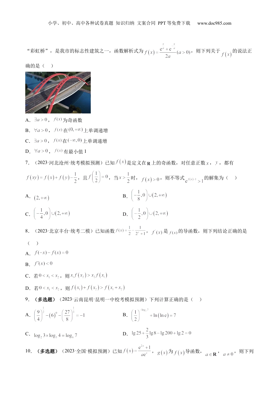 小学、初中、高中各种试卷真题知识归纳文案合同PPT等免费下载www.doc985.com第04讲指数与指数函数(模拟精练+真题演练)1.(2023·四川成都·成都七中校考模拟预测)要得到函数的图象,只需将指数函数的图象()A.向左平移1个单位B.向右平移1个单位C.向左平移个单位D.向右平移个单位2.(2023·山东·沂水县第一中学校联考模拟预测)某款电子产品的售价(万元/件)与上市时间(单位:月)满足函数关系(a,b为常数,且),若上市第2个月的售价为2.8万元,第4个月的售价为2.64万元,那么在上市第1个月时,该款电子产品的售价约为()(参考数据:)A.3.016万元B.2.894万元C.3.048万元D.2.948万元3.(2023·河北石家庄·统考三模)已知函数同时满足性质:①;②对于,,则函数可能是()A.B.C.D.4.(2023·浙江·校联考模拟预测)已知函数,则()A.为奇函数B.为偶函数C.为奇函数D.为偶函数5.(2023·贵州毕节·统考模拟预测)已知函数,则对任意非零实数x,有()A.B.C.D.6.(2023·江西新余·统考二模)钟灵大道是连接新余北站和新余城区的主干道,是新余对外交流的门户之一,而仰天岗大桥就是这一条主干道的起点,其桥拱曲线形似悬链线,桥型优美,被广大市民们美称为小学、初中、高中各种试卷真题知识归纳文案合同PPT等免费下载www.doc985.com“彩虹桥”,是我市的标志性建筑之一,函数解析式为,则下列关于的说法正确的是()A.,为奇函数B.,在上单调递增C.,在上单调递增D.,有最小值17.(2023·河北沧州·统考模拟预测)已知是定义在上的奇函数,对任意正数,,都有,且,当时,,则不等式的解集为()A.B.C.D.8.(2023·北京丰台·统考二模)已知函数,是的导函数,则下列结论正确的是()A.B.C.若,则D.若,则9.(多选题)(2023·云南昆明·昆明一中校考模拟预测)下列计算正确的是()A.B.C.D.10.(多选题)(2023·全国·模拟预测)已知,为导函数,,,则下列小学、初中、高中各种试卷真题知识归纳文案合同PPT等免费下载www.doc985.com说法正确的是()A.为偶函数B.当且时,恒成立C.的值域为D.与曲线无交点11.(多选题)(2023·安徽合肥·统考一模)已知,函数的图象可能是()A.B.C.D.12.(多选题)(2023·安徽合肥·统考一模)已知数列满足.若对,都有成立,则整数的值可能是()A.B.C.0D.113.(2023·全国·合肥一中校联考模拟预测)若,则当取得最小值时,_______.14.(2023·北京房山·统考二模)已知函数,给出两个性质:①在上是增函数;②对任意,.写出一个同时满足性质①和性质②的函数解析式,_______.15.(2023·上海杨浦·统考二模)由函数的观点,不等式的解集是______16.(2023·上海宝山·统考二模)已知函数(且),若关于的不等式的解集为,其中,则实数的取值范围是_________.17.(2023·广东肇庆·校考模拟预测)已知函数是奇函数.(1)求的值;(2)已知,求的取值范围.小学、初中、高中各种试卷真题知识归纳文案合同PPT等免费下载www.doc985.com18.(2023·陕西渭南·统考一模)计算下列各式的值.(1);(2).19.(2023·河南·校联考模拟预测)已知为定义在上的偶函数,,且.(1)求函数,的解析式;(2)求不等式的解集.20.(2023·河南平顶山·校联考模拟预测)已知函数且)为定义在R上的奇函数(1)利用单调性的定义证明:函数在R上单调递增;(2)若关于x的不等式恒成立,求实数m的取值范围;(3)若函数有且仅有两个零点,求实数k的取值范围.小学、初中、高中各种试卷真题知识归纳文案合同PPT等免费下载www.doc985.com21.(2023·云南昆明·安宁市第一中学校考模拟预测)已知函数.(1)若函数为奇函数,求实数m的值.(2)当时,求的值.22.(2023·天津南开·南开中学校考模拟预测)已知函数(为常数,且,).(1)当时,若对任意的,都有成立,求实数的取值范围;(2)当为偶函数时,若关于的方程有实数解,求实数的取值范围.1.(2020·全国·统考高考真题)若,则()A.B.C.D.2.(2013·全国·高考真题)若存在正数x使2x(x-a)<1成立,则a的取值范围是A.(-∞,+∞)B...