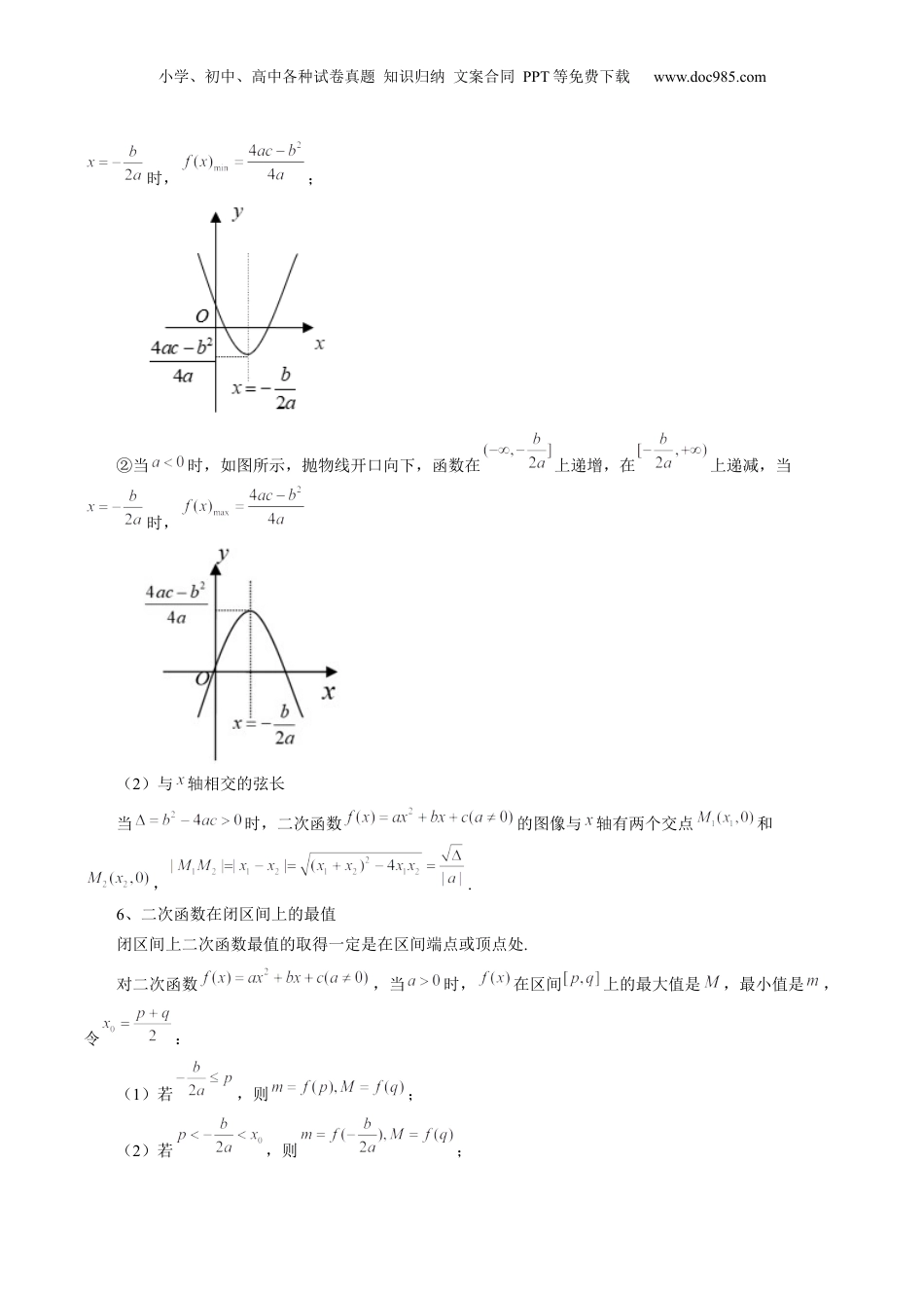 小学、初中、高中各种试卷真题知识归纳文案合同PPT等免费下载www.doc985.com第03讲幂函数与二次函数目录考点要求考题统计考情分析(1)通过具体实例,了解幂函数及其图象的变化规律.(2)掌握二次函数的图象与性质(单调性、对称性、顶点、最值等).2020年江苏卷第7题,5分从五年全国卷的考,近查情况来看本内单命题,幂函数要求相节容很少独对较低,常与指数函数、对数函数综合,幂值的大小,以选题、比较多择题出填空现.小学、初中、高中各种试卷真题知识归纳文案合同PPT等免费下载www.doc985.com1、幂函数的定义一般地,(为有理数)的函数,即以底数为自变量,幂为因变量,指数为常数的函数称为幂函数.2、幂函数的特征:同时满足一下三个条件才是幂函数①的系数为1;②的底数是自变量;③指数为常数.(3)幂函数的图象和性质3、常见的幂函数图像及性质:函数图象定义域值域奇偶性奇偶奇非奇非偶奇单调性在上单调递增在上单调递减,在上单调递增在上单调递增在上单调递增在和上单调递减公共点4、二次函数解析式的三种形式(1)一般式:;(2)顶点式:;其中,为抛物线顶点坐标,为对称轴方程.(3)零点式:,其中,是抛物线与轴交点的横坐标.5、二次函数的图像二次函数的图像是一条抛物线,对称轴方程为,顶点坐标为.(1)单调性与最值①当时,如图所示,抛物线开口向上,函数在上递减,在上递增,当小学、初中、高中各种试卷真题知识归纳文案合同PPT等免费下载www.doc985.com时,;②当时,如图所示,抛物线开口向下,函数在上递增,在上递减,当时,(2)与轴相交的弦长当时,二次函数的图像与轴有两个交点和,.6、二次函数在闭区间上的最值闭区间上二次函数最值的取得一定是在区间端点或顶点处.对二次函数,当时,在区间上的最大值是,最小值是,令:(1)若,则;(2)若,则;小学、初中、高中各种试卷真题知识归纳文案合同PPT等免费下载www.doc985.com(3)若,则;(4)若,则.【解题方法总结】1、幂函数在第一象限内图象的画法如下:①当时,其图象可类似画出;②当时,其图象可类似画出;③当时,其图象可类似画出.2、实系数一元二次方程的实根符号与系数之间的关系(1)方程有两个不等正根(2)方程有两个不等负根(3)方程有一正根和一负根,设两根为3、一元二次方程的根的分布问题一般下需要从以下情况4个方面考虑:(1)开口方向;(2)判别式;(3)对称轴与区间端点的关系;(4)区间端点函数值的正负.设为实系数方程的两根,则一元二次的根的分布与其限定条件如表所示.根的分布图像限定条件小学、初中、高中各种试卷真题知识归纳文案合同PPT等免费下载www.doc985.com在区间内有实根没OnmyxOnmyxOnmyx小学、初中、高中各种试卷真题知识归纳文案合同PPT等免费下载www.doc985.comOnmyxOnmyx在区间内有且有一个实根只OnmyxOnmyx在区间内有两个不等实根Onmyx4、有关二次函数的问题,关键是利用图像.(1)要熟练掌握二次函数在某区间上的最值或值域的求法,特别是含参数的两类问题动轴定区——间和定轴动区间,解法是抓住三点一轴,三点指的是区间两个端点和区间中点,一轴指对称轴“”.即注意小学、初中、高中各种试卷真题知识归纳文案合同PPT等免费下载www.doc985.com对对称轴与区间的不同位置关系加以分类讨论,往往分成:①轴处在区间的左侧;②轴处在区间的右侧;③轴穿过区间内部(部分题目还需讨论轴与区间中点的位置关系),从而对参数值的范围进行讨论.(2)对于二次方程实根分布问题,要抓住四点,即开口方向、判别式、对称轴位置及区间端点函数值正负.题一:幂函数的定图像型义及其【例1】(2023·宁夏固原·高三隆德县中学校联考期中)已知函数是幂函数,且在上递减,则实数()A.B.或C.D.【对点训练1】(2023·海南·统考模拟预测)已知为幂函数,则().A.在上单调递增B.在上单调递减C.在上单调递增D.在上单调递减【对点训练2】(2023·河北·高三学业考试)已知幂函数的图象过点,则的值为()A.2B.3C.4D.9【对点训练3】(2023·全国·高三专题练习)幂函数中a的取值集合C是的子集,当幂函数的值域与定义域相同时,集合C为()A.B.C.D.【...