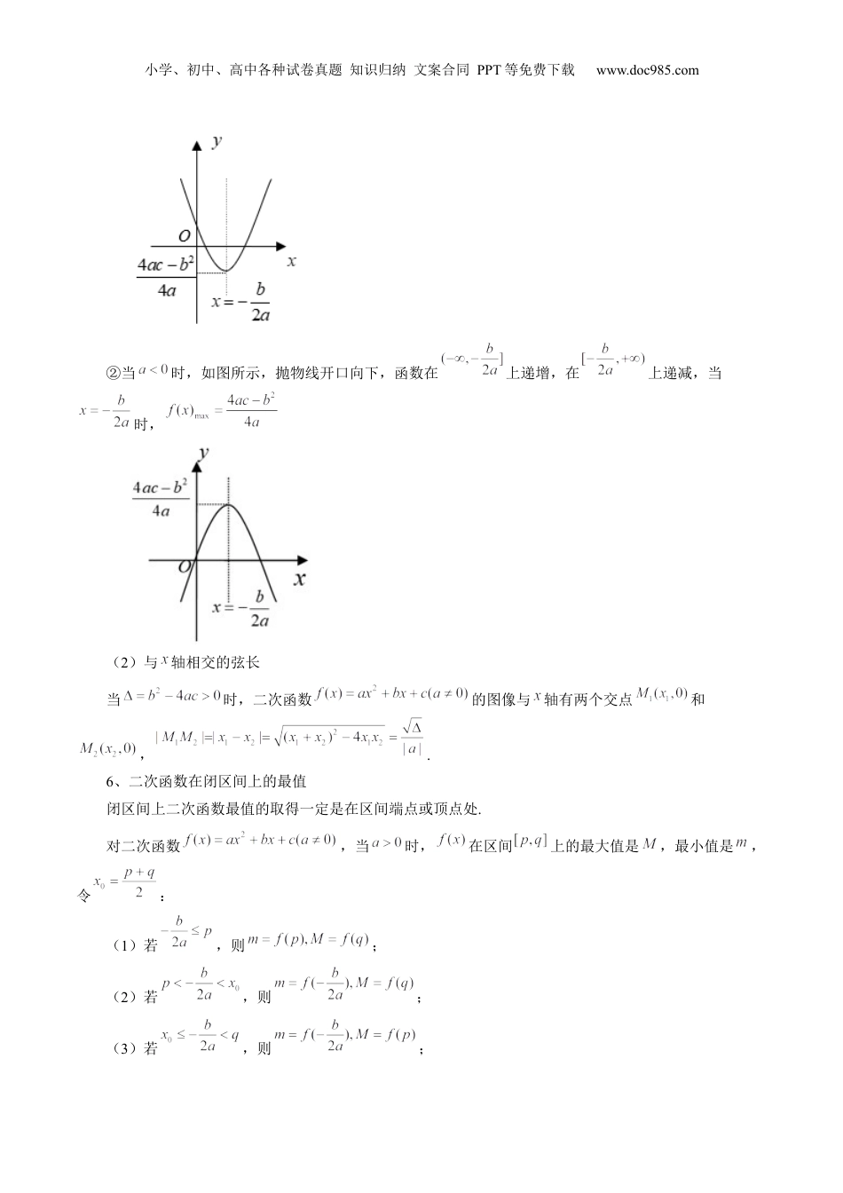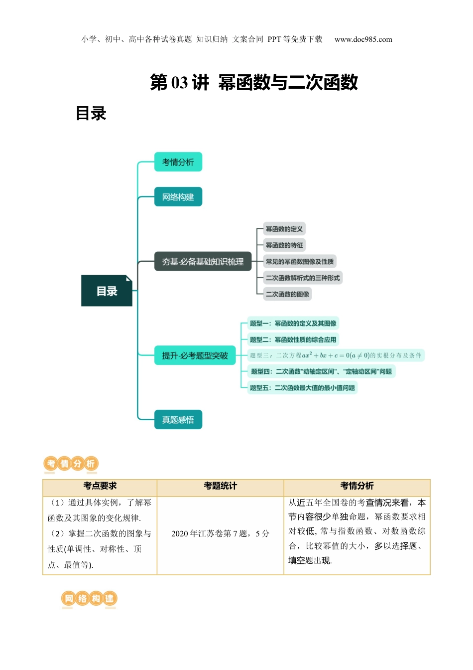 小学、初中、高中各种试卷真题知识归纳文案合同PPT等免费下载www.doc985.com第03讲幂函数与二次函数目录考点要求考题统计考情分析(1)通过具体实例,了解幂函数及其图象的变化规律.(2)掌握二次函数的图象与性质(单调性、对称性、顶点、最值等).2020年江苏卷第7题,5分从五年全国卷的考,近查情况来看本内单命题,幂函数要求相节容很少独对较低,常与指数函数、对数函数综合,比较幂值的大小,以选题、多择题出填空现.小学、初中、高中各种试卷真题知识归纳文案合同PPT等免费下载www.doc985.com1、幂函数的定义一般地,(为有理数)的函数,即以底数为自变量,幂为因变量,指数为常数的函数称为幂函数.2、幂函数的特征:同时满足一下三个条件才是幂函数①的系数为1;②的底数是自变量;③指数为常数.(3)幂函数的图象和性质3、常见的幂函数图像及性质:函数图象定义域值域奇偶性奇偶奇非奇非偶奇单调性在上单调递增在上单调递减,在上单调递增在上单调递增在上单调递增在和上单调递减公共点4、二次函数解析式的三种形式(1)一般式:;(2)顶点式:;其中,为抛物线顶点坐标,为对称轴方程.(3)零点式:,其中,是抛物线与轴交点的横坐标.5、二次函数的图像二次函数的图像是一条抛物线,对称轴方程为,顶点坐标为.(1)单调性与最值①当时,如图所示,抛物线开口向上,函数在上递减,在上递增,当时,;小学、初中、高中各种试卷真题知识归纳文案合同PPT等免费下载www.doc985.com②当时,如图所示,抛物线开口向下,函数在上递增,在上递减,当时,(2)与轴相交的弦长当时,二次函数的图像与轴有两个交点和,.6、二次函数在闭区间上的最值闭区间上二次函数最值的取得一定是在区间端点或顶点处.对二次函数,当时,在区间上的最大值是,最小值是,令:(1)若,则;(2)若,则;(3)若,则;小学、初中、高中各种试卷真题知识归纳文案合同PPT等免费下载www.doc985.com(4)若,则.【解题方法总结】1、幂函数在第一象限内图象的画法如下:①当时,其图象可类似画出;②当时,其图象可类似画出;③当时,其图象可类似画出.2、实系数一元二次方程的实根符号与系数之间的关系(1)方程有两个不等正根(2)方程有两个不等负根(3)方程有一正根和一负根,设两根为3、一元二次方程的根的分布问题一般下需要从以下情况4个方面考虑:(1)开口方向;(2)判别式;(3)对称轴与区间端点的关系;(4)区间端点函数值的正负.设为实系数方程的两根,则一元二次的根的分布与其限定条件如表所示.根的分布图像限定条件小学、初中、高中各种试卷真题知识归纳文案合同PPT等免费下载www.doc985.com在区间内有实根没OnmyxOnmyxOnmyx小学、初中、高中各种试卷真题知识归纳文案合同PPT等免费下载www.doc985.comOnmyxOnmyx在区间内有且只有一个实根OnmyxOnmyx在区间内有两个不等实根Onmyx4、有关二次函数的问题,关键是利用图像.(1)要熟练掌握二次函数在某区间上的最值或值域的求法,特别是含参数的两类问题动轴定区——间和定轴动区间,解法是抓住三点一轴,三点指的是区间两个端点和区间中点,一轴指对称轴“”.即注意小学、初中、高中各种试卷真题知识归纳文案合同PPT等免费下载www.doc985.com对对称轴与区间的不同位置关系加以分类讨论,往往分成:①轴处在区间的左侧;②轴处在区间的右侧;③轴穿过区间内部(部分题目还需讨论轴与区间中点的位置关系),从而对参数值的范围进行讨论.(2)对于二次方程实根分布问题,要抓住四点,即开口方向、判别式、对称轴位置及区间端点函数值正负.题一:幂函数的定图像型义及其【例1】(2023·宁夏固原·高三隆德县中学校联考期中)已知函数是幂函数,且在上递减,则实数()A.B.或C.D.【答案】A【解析】因为是幂函数,所以,解得或,又因为在上单调递减,则.故选:A【对点训练1】(2023·海南·统考模拟预测)已知为幂函数,则().A.在上单调递增B.在上单调递减C.在上单调递增D.在上单调递减【答案】B【解析】因为是幂函数,所以,解得或,所以或,对于,函数在上单调递增,在上单调递减;对于,函数在上单调递减,且为奇函数,故在上单调递减;...