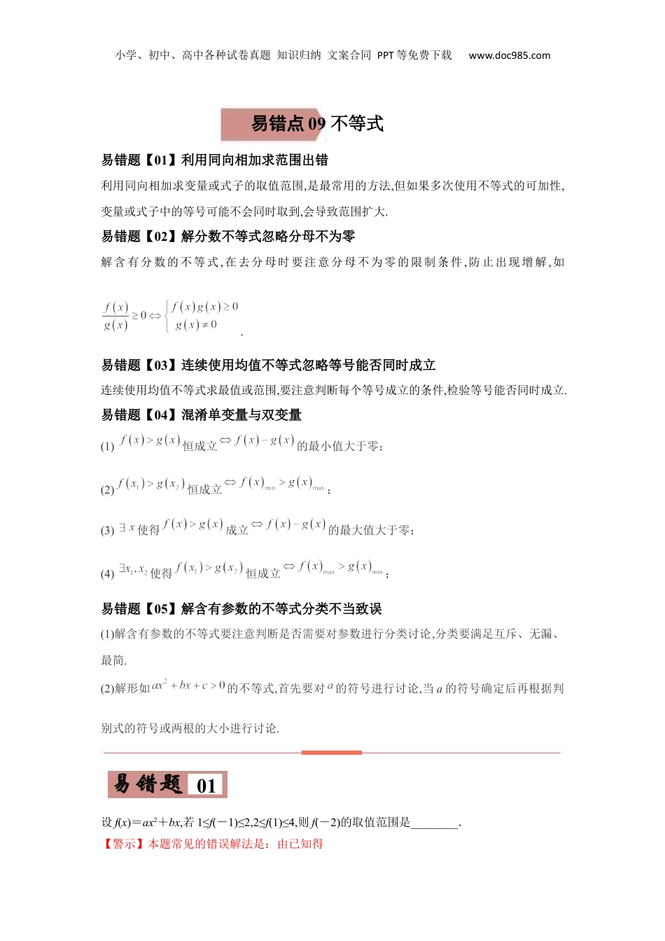 小学、初中、高中各种试卷真题知识归纳文案合同PPT等免费下载www.doc985.com易错点09不等式易错题【01】利用同向相加求范围出错利用同向相加求变量或式子的取值范围,是最常用的方法,但如果多次使用不等式的可加性,变量或式子中的等号可能不会同时取到,会导致范围扩大.易错题【02】解分数不等式忽略分母不为零解含有分数的不等式,在去分母时要注意分母不为零的限制条件,防止出现增解,如.易错题【03】连续使用均值不等式忽略等号能否同时成立连续使用均值不等式求最值或范围,要注意判断每个等号成立的条件,检验等号能否同时成立.易错题【04】混淆单变量与双变量(1)恒成立的最小值大于零;(2)恒成立;(3)使得成立的最大值大于零;(4)使得恒成立;易错题【05】解含有参数的不等式分类不当致误(1)解含有参数的不等式要注意判断是否需要对参数进行分类讨论,分类要满足互斥、无漏、最简.(2)解形如的不等式,首先要对的符号进行讨论,当a的符号确定后再根据判别式的符号或两根的大小进行讨论.01设f(x)=ax2+bx,若1≤f(-1)≤2,2≤f(1)≤4,则f(-2)的取值范围是________.【警示】本题常见的错误解法是:由已知得小学、初中、高中各种试卷真题知识归纳文案合同PPT等免费下载www.doc985.com①+②得3≤2a≤6,6≤4∴a≤12,又由①可得-2≤-a+b≤-1,③②+③得0≤2b≤3,∴-3≤-2b≤0,又f(-2)=4a-2b,3≤4∴a-2b≤12,∴f(-2)的取值范围是[3,12].【答案】【问诊】正确解法是:由得∴f(-2)=4a-2b=3f(-1)+f(1).又 1≤f(-1)≤2,2≤f(1)≤4,5≤3∴f(-1)+f(1)≤10,故5≤f(-2)≤10.【叮嘱】在求式子的范围时,如果多次使用不等式的可加性,式子中的等号不能同时取到,会导致范围扩大.1.已知实数x,y满足,,则()A.1≤x≤3B.2≤y≤1C.2≤4x+y≤15D.xy2.已知,,则的取值范围是()A.B.C.D.02解不等式.【警示】本题易错之处是误以为.【问诊】,小学、初中、高中各种试卷真题知识归纳文案合同PPT等免费下载www.doc985.com所以的解集为.【叮嘱】,且.1.设集合,,则()A.B.C.D.2.设,那么“”是“”的()A.充分不必要条件B.必要不充分条件C.充分必要条件D.既不充分也不必要条件03已知x>0,y>0,且+=1,则x+y的最小值是________.【警示】本题错误解法是: x>0,y>0,1∴=+≥2,≥2,∴∴x+y≥2=4,∴x+y的最小值为4.【答案】3+2【问诊】+≥2取等号的条件是,即,x+y≥2取等号的条件是与矛盾.正确解法为: x>0,y>0,∴x+y=(x+y)(+)=3++≥3+2(当且仅当y=x时取等号),∴当x=+1,y=2+时,(x+y)min=3+2.【叮嘱】多次使用基本不等式要验证等号成立的条件.1.(2022届辽宁省东北育才学校高三上学期模拟)圆关于直线对称,则的最小值是()小学、初中、高中各种试卷真题知识归纳文案合同PPT等免费下载www.doc985.comA.B.C.D.2.(2022届河南省名校大联考高三上学期期中)已知正实数,,满足,则当与同时取得最大值时,()A.B.C.D.04已知f(x)=12x2+x,g(x)=ln(x+1)−a,(1)若对任意x∈[0,2],恒有f(x)>g(x),求实数a的取值范围;(2)若对任意x1,x2∈[0,2],恒有f(x1)>g(x2),求实数a的取值范围;【警示】本题易混淆单变量与双变量【答案】(1);(2)a>ln3【问诊】(1)设h(x)=12x2+x−ln(x+1),因为x∈[0,2]时h′(x)=x+1−1x+1=x2+2xx+1>0,所以h(x)在[0,2]上是增函数,由此可求得h(x)的值域是[0,4−ln3],所以实数a的取值范围是[0,4−ln3].对任意x∈[0,2],恒有f(x)>g(x),即x∈[0,2]时h(x)¿a恒成立,即h(x)min¿a,由⑵可知a¿0.(2)由题中条件可得f(x)的值域A=[0,4],g(x)的值域B=[−a,ln3−a],若对任意x1,x2∈[0,2],恒有f(x1)>g(x2),即f(x)min>g(x)max,即0>ln3−a,所以a>ln3.【叮嘱】①若f(x)值域为[m,n],则不等式f(x)¿a恒成立⇔a¿m;不等式f(x)¿a有解⇔a¿n;②若f(x)值域为[m,n],则不等式f(x)¿a恒成立⇔a¿m;若f(x)值域为(m,n]则小学、初中、高中各种试卷真题知识归纳文案合同PPT等免费下载www.doc985.com不等式f(x)¿a恒成立⇔a¿m.③设g(x)的最大值为M,对任意x2∈[0,2],f(x1)>g(x2)的条件f(x1)>M,于是问题转化为存在x1∈[0,2],使得f(x1)>M,因此只需f(x)的最小值大于M即f(x)max>g(x)max....
