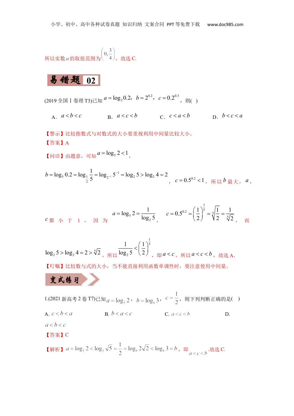 小学、初中、高中各种试卷真题知识归纳文案合同PPT等免费下载www.doc985.com易错点03指数函数与对数函数及函数与方程易错题【01】研究对数型函数忽略定义域研究函数的性质,或求解与有关的函数与方程及不等式问题,不少同学常因忽略的隐含条件出现错误。易错题【02】不会利用中间量比较大小在比较数与式的大小时常利用指数函数、幂函数及对数函数单调性比较大小,若比较指数式与对数式的大小,或同是指数式(对数式)但底数不相同,这些情况下常利用中间量比较大小,常用的中间量是,有时也可借助等中间量来比较大小.易错题【03】不会构造函数比较大小比较两个式子的大小,若两个式子结构比较复杂,但结构类似,这种情况下常式子的结构构造函数,然后利用函数单调性比较大小。易错题【04】确定函数零点所在区间,或零点个数或已知函数零点情况求参数满足条件,常通过数形结合转化为两个函数图象的交点个数问题,故提醒同学们研究函数与方程问题不要得“意”忘“形”。01若在上是减函数,则的取值范围是【警示】本题出错的主要原因是忽略定义域,不会由得出.【答案】【问诊】因为由,所以,此时在上是减函数,由复合函数单调性得,由,解得,所以的取值范围是。小学、初中、高中各种试卷真题知识归纳文案合同PPT等免费下载www.doc985.com【叮嘱】研究对数型函数的性质,一定不要忽略真数大于零的限制。1.函数在单调递增,求a的取值范围()A.B.C.D.【答案】C【解析】令,二次函数抛物线的对称轴方程为,由复合函数的单调性可知,.又在上恒成立,所以,即,所以,解可得,.故选C2.(2021湖北武汉市第一中学高三月考)函数在区间上单调递增,则实数的取值范围为().A.B.C.D.【答案】C【解析】设,可得,则是减函数,要使得函数为上的增函数,只需为减函数,且满足对于恒成立,所以,解得:,小学、初中、高中各种试卷真题知识归纳文案合同PPT等免费下载www.doc985.com所以实数的取值范围为,故选C.02(2019全国Ⅰ卷理T3)已知0.20.32log0.220.2abc,,,则()A.abcB.acbC.cabD.bca【警示】比较指数式与对数式的大小要重视利用中间量比较大小。【答案】A【问诊】由题意,可知5log21a,115122221log0.2loglog5log5log425b,0.20.51c,所以b最大,a,c都小于1,因为521log2log5a,150.2551110.5222c,而522log5log422,所以15211log52,即ac,所以acb,故选A.【叮嘱】比较数与式的大小,当不能直接利用函数单调性时,要注意使用中间量。1.(2021新高考2卷T7)已知,,,则下列判断正确的是()A.B.C.D.【答案】C【解析】,即.故选C.小学、初中、高中各种试卷真题知识归纳文案合同PPT等免费下载www.doc985.com2.(2020全国Ⅲ文T10)设,则()A.B.C.D.【答案】A【解析】因为,,所以,故选A.03(2021全国卷乙卷理T12)设,,,则A.B.C.D.【警示】不会观察式子的结构通过构造函数求解。【答案】B【问诊】解法一:,,,令,,令,则,,,在上单调递增,(1),,,同理令,再令,则,,,在上单调递减,(1),,,.故选:.小学、初中、高中各种试卷真题知识归纳文案合同PPT等免费下载www.doc985.com解法二:由,则排除AD,结合选项BC,只需判断a,c的大小,故设,∴,又 ∴,∴,∴在上单增,∴,∴,∴,故选B【叮嘱】比较几个复杂式子的大小,常通过构造函数,利用函数性质求解。1.(2020全国Ⅰ理T12)若,则()A.B.C.D.【答案】B【解析】设,则为增函数, ,∴,∴,∴.∴小学、初中、高中各种试卷真题知识归纳文案合同PPT等免费下载www.doc985.com,当时,,此时,有;当时,,此时,有,∴C、D错误,故选B.2.(2020全国Ⅱ理T11)若2x−2y<3−x−3−y,则()A.B.C.ln|x−y|>0D.ln|x−y|<0【答案】A【解析】由得:,令,为上的增函数,为上的减函数,为上的增函数,,,,,则A正确,B错误;与的大小不确定,故CD无法确定,故选A.04(2018全国卷Ⅰ)已知函数.若存在2个零点,则的取值范围是A.B.C.D.【警示】不会利用图象求解,导致解题失败.【答案】C【问诊】函数存在2...