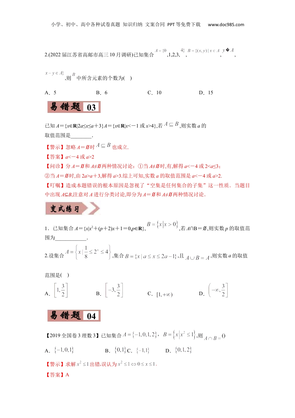 小学、初中、高中各种试卷真题知识归纳文案合同PPT等免费下载www.doc985.com易错点01集合的概念及运算易错题【01】对集合中元素的类型理解不到位集合问题是高考必考问题,一般作为容易题出现,求解集合问题的关键是理解集合中元素的类型,特别是用描述法表示集合,首先要搞清楚集合中代表元素的含义,再看元素的限制条件,明白集合的类型,是连续数集、离散数集、点集或其他类型的集合.易错题【02】忽略集合中元素互异性利用元素与集合的关系或两集合之间的关系求参数的值,集合中元素的互异性常常容易忽略,求解问题时要特别注意,求出以后一定要代入检验,看看是否满足元素的互异性.易错题【03】忽略空集空集是任何集合的子集,在涉及集合关系,如根据求参数的值或范围要注意是否可以为,根据求参数的值或范围必须优先考虑空集的情况,否则会造成漏解.易错题【04】忽视集合转化的等价性把用描述法表示的集合转化为用列举法表述的集合或化简集合容易忽略等价性,如去分母忽略分母不为零,解含有对数式的不等式要保证对数式有意义,要注意集合中的限制条件等.01(2021年全国统一高考数学试卷乙卷理科)已知集合,,,,则A.B.C.D.【警示】本题出错的主要原因是不理解集合中元素的类型.【答案】C【问诊】误选A是因为误认为集合中的元素是代数式,误选D是因为只知道是数集,忽略限制条件,正确求解方法是分别讨论当是偶数、奇数时的集合元素情况,结合集合的基本运算进行判断即可,当是偶数时,设,则,当是奇数时,设,小学、初中、高中各种试卷真题知识归纳文案合同PPT等免费下载www.doc985.com则,,则,则.【叮嘱】求解集合运算问题一定要注意判断集合中元素的类型,如都是数集,分别表示方程的解集,函数的定义域,函数的值域,表示点集.1.已知集合,则()A.B.C.D.2.【2017全国卷3理数】已知集合A=,B=,则AB中元素的个数为A.3B.2C.1D.002已知集合A={1,x,2},B={1,x2},若A∪B=A,则x的不同取值个数为()A.1B.2C.3D.4【警示】由x2=2,解得x1=,x2=-.由x2=x,解得x3=0,x4=1.忽略检验,误选D.【答案】C【问诊】因为A∪B=A,所以B⊆A.所以x2=2或x2=x.由x2=2,解得x=±,由x2=x,解得x=0或x=1.注意当x=1时,x2=1,集合A、B中元素不满足互异性,所以符合题意的x为或-或0,故选C.【叮嘱】由集合的关系求集合中的元素,求出以后要代入检验,看看是否满足元素的互异性.1.(2022届贵州省安顺市高三第一次测试)已知集合,,若,则()A.1B.0或1或3C.0或3D.1或3小学、初中、高中各种试卷真题知识归纳文案合同PPT等免费下载www.doc985.com2.(2022届江苏省高邮市高三10月调研)已知集合,1,2,3,,,,,则中所含元素的个数为()A.5B.6C.10D.1503已知A={x∈R|2a≤x≤a+3}A={x∈R|x<-1或x>4},若,则实数a的取值范围是________.【警示】忽略A=∅时也成立.【答案】a<-4或a>2【问诊】分A=∅和A≠∅两种情况讨论:①当A≠∅时,有,解得a<-4或2<a≤3;②当A=∅时,由2a>a+3,解得a>3.综上可知,实数a的取值范围是a<-4或a>2.【叮嘱】造成本题错误的根本原因是忽视了“空集是任何集合的子集”这一性质.当题目中出现A⊆B,注意对A进行分类讨论,即分为A=∅和A≠∅两种情况讨论.1.已知集合A={x|x2+(p+2)x+1=0,p∈R},,若A∩B=∅,则实数p的取值范围为____________.2.设集合,集合,且,则实数a的取值范围是()A.B.C.D.04【2019全国卷3理数3】已知集合,则()A.B.C.D.【警示】求解出错,误认为.【答案】A小学、初中、高中各种试卷真题知识归纳文案合同PPT等免费下载www.doc985.com【问诊】由题意得,,则.故选A.【叮嘱】求解与不等式解集有关的集合运算问题是高考热点,解不等式必须是等价转化.1.已知集合,则()A.或B.或C.D.2.设全集,,,则()A.B.C.D.错1.(2022届山西省吕梁市高三上学期11月测试)已知集合,集合,则()A.AB.BC.ND.2.(2022届江西省赣州市2022届高三上学期期中)已知、,若,则的值为()A.B.0C.D.或小学、初中、高中各种试卷真题知识归纳文案合同PPT等免费下载www.doc985.com3.(2021届重庆市西南大学附属中学高三下学期月考)设集合,,则()A.B.C.D.4.(2022届湖北省新高考9N联盟部分重点中学高三...