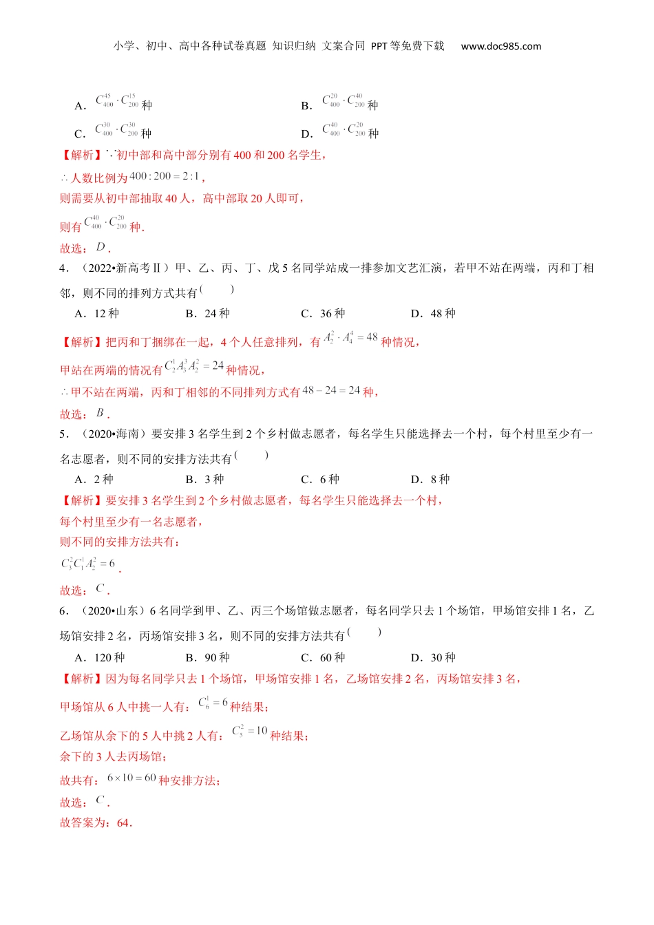 小学、初中、高中各种试卷真题知识归纳文案合同PPT等免费下载www.doc985.com五年(2019-2023)年高考真题分项汇编专题18计数原理计数原理作为高考知识点主要考查题型文小题。主要考查题型为:考点01分类加法与分步乘法计数原理、排列组合考点02二项式定理考点01分类加法与分步乘法计数原理、排列组合1(2020•上海)已知,,,0,1,2,,、,则的情况有种.【解析】当,0种,当,2种,当,4种;当,6种,当,4种;当,2种,当,0种,故共有:.故答案为:18.2.(2023•新高考Ⅰ)某学校开设了4门体育类选修课和4门艺术类选修课,学生需从这8门课中选修2门或3门课,并且每类选修课至少选修1门,则不同的选课方案共有种(用数字作答).【解析】若选2门,则只能各选1门,有种,如选3门,则分体育类选修课选2,艺术类选修课选1,或体育类选修课选1,艺术类选修课选2,则有,综上共有种不同的方案.3.(2023•新高考Ⅱ)某学校为了了解学生参加体育运动的情况,用比例分配的分层随机抽样方法作抽样调查,拟从初中部和高中部两层共抽取60名学生,已知该校初中部和高中部分别有400名和200名学生,则不同的抽样结果共有小学、初中、高中各种试卷真题知识归纳文案合同PPT等免费下载www.doc985.comA.种B.种C.种D.种【解析】初中部和高中部分别有400和200名学生,人数比例为,则需要从初中部抽取40人,高中部取20人即可,则有种.故选:.4.(2022•新高考Ⅱ)甲、乙、丙、丁、戊5名同学站成一排参加文艺汇演,若甲不站在两端,丙和丁相邻,则不同的排列方式共有A.12种B.24种C.36种D.48种【解析】把丙和丁捆绑在一起,4个人任意排列,有种情况,甲站在两端的情况有种情况,甲不站在两端,丙和丁相邻的不同排列方式有种,故选:.5.(2020•海南)要安排3名学生到2个乡村做志愿者,每名学生只能选择去一个村,每个村里至少有一名志愿者,则不同的安排方法共有A.2种B.3种C.6种D.8种【解析】要安排3名学生到2个乡村做志愿者,每名学生只能选择去一个村,每个村里至少有一名志愿者,则不同的安排方法共有:.故选:.6.(2020•山东)6名同学到甲、乙、丙三个场馆做志愿者,每名同学只去1个场馆,甲场馆安排1名,乙场馆安排2名,丙场馆安排3名,则不同的安排方法共有A.120种B.90种C.60种D.30种【解析】因为每名同学只去1个场馆,甲场馆安排1名,乙场馆安排2名,丙场馆安排3名,甲场馆从6人中挑一人有:种结果;乙场馆从余下的5人中挑2人有:种结果;余下的3人去丙场馆;故共有:种安排方法;故选:.故答案为:64.小学、初中、高中各种试卷真题知识归纳文案合同PPT等免费下载www.doc985.com7.(2020•上海)从6个人挑选4个人去值班,每人值班一天,第一天安排1个人,第二天安排1个人,第三天安排2个人,则共有种安排情况.【解析】根据题意,可得排法共有种.故答案为:180.8.(2019•上海)首届中国国际进口博览会在上海举行,某高校拟派4人参加连续5天的志愿者活动,其中甲连续参加2天,其他人各参加1天,则不同的安排方法有种(结果用数值表示)【解析】在五天里,连续的2天,一共有4种,剩下的3人排列,故有种,故答案为:24.考点02二项式定理1.(2022•新高考Ⅰ)的展开式中的系数为(用数字作答).【解析】的通项公式为,当时,,当时,,的展开式中的系数为.故答案为:.5(2021•浙江)已知多项式,则;.【解析】即为展开式中的系数,所以;令,则有,所以.故答案为:5;10.2.(2021•上海)已知二项式展开式中,的系数为80,则.【解析】的展开式的通项公式为,所以的系数为,解得.故答案为:2.3.(2020年高考数学课标Ⅱ卷理科·第14题)4名同学到3个小区参加垃圾分类宣传活动,每名同学只去1个小区,每个小区至少安排1名同学,则不同的安排方法共有__________种.小学、初中、高中各种试卷真题知识归纳文案合同PPT等免费下载www.doc985.com【答案】解析:4名同学到3个小区参加垃圾分类宣传活动,每名同学只去1个小区,每个小区至少安排1名同学先取2名同学看作一组,选法有:现在可看成是3组同学分配到3个小区,分法有:根据分步乘法原理,可得不同...