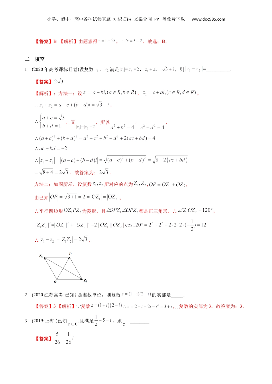 小学、初中、高中各种试卷真题知识归纳文案合同PPT等免费下载www.doc985.com五年(2019-2023)年高考真题分项汇编专题17数系扩充及复数引入复数是高考中必出题型,一般是小题出现,主要形式是选题题前三题形式出现。考点01复数的概念以及基本意义考点02复数的四则运算考点01复数的概念以及基本意义1.(2023年北京卷·)在复平面内,复数对应的点的坐标是,则的共轭复数()A.B.C.D.【答案】D【解析】:在复平面对应的点是,根据复数的几何意义,,由共轭复数的定义可知,.故选:D2.(2023年新课标全国Ⅰ卷·)已知,则()A.B.C.0D.1【答案】A【解析】:因为,所以,即.故选:A.3.(2023年全国乙卷理科·)设,则()A.B.C.D.【答案】B【解析】:由题意可得,则.故选:B.小学、初中、高中各种试卷真题知识归纳文案合同PPT等免费下载www.doc985.com4.(2021年高考浙江卷·)已知,,(i为虚数单位),则()A.B.1C.D.3【答案】C【解析】:,利用复数相等的充分必要条件可得:,故选C.5.(2020年浙江省高考数学试卷·第2题)已知a∈R,若a–1+(a–2)i(i为虚数单位)是实数,则a=()A.1B.–1C.2D.–2【答案】C【解析】:因为为实数,所以,故选:C6.(2021年新高考全国Ⅱ卷)复数在复平面内对应的点所在的象限为()A.第一象限B.第二象限C.第三象限D.第四象限【答案】A【解析】:,所以该复数对应的点为,该点在第一象限,故选A.7.(2022高考北京卷·)若复数z满足,则()A.1B.5C.7D.25【答案】B【解析】:由题意有,故.故选,B.8.(2019·全国Ⅱ·理·)设,则在复平面内对应的点位于()A.第一象限B.第二象限C.第三象限D.第四象限【答案】C【解析】 ,∴,对应坐标,是第三象限.9.(2023年新课标全国Ⅱ卷·)在复平面内,对应的点位于().A.第一象限B.第二象限C.第三象限D.第四象限【答案】A【解析】:因为,则所求复数对应的点为,位于第一象限.故选:A.10.(2020北京高考·)在复平面内,复数对应的点的坐标是,则().A.B.C.D.小学、初中、高中各种试卷真题知识归纳文案合同PPT等免费下载www.doc985.com【答案】B【解析】由题意得,.故选:B.二填空1.(2020年高考课标Ⅱ卷)设复数,满足,,则=__________.【答案】【解析】:方法一:设,,,,又,所以,,.故答案为:.方法二:如图所示,设复数所对应的点为,,由已知,∴平行四边形为菱形,且都是正三角形,∴,∴.2.(2020江苏高考·已知是虚数单位,则复数的实部是_____.【答案】3【解析】复数,复数的实部为3.故答案为:3.3.(2019·上海·)已知且满足,求________.【答案】小学、初中、高中各种试卷真题知识归纳文案合同PPT等免费下载www.doc985.com【解析】,.4.(2019·浙江·)复数(为虚数单位),则.【答案】【解析】解法一:由于,则.解法二:.5.(2019·江苏·)已知复数的实部为,其中为虚数单位,则实数的值是______.【答案】2【解析】因为的实部为,.考点02复数的四则运算1.(2022新高考全国I卷·)若,则()A.B.C.1D.2【答案】D【解析】:由题设有,故,故,故选:D2.(2022年高考全国甲卷数学)若,则()A.B.C.D.【答案】C【解析】故选:C3.(2022年浙江省高考数学试题·)已知(为虚数单位),则()A.B.C.D.【答案】B【解析】:,而为实数,故,故选,B.4.(2022新高考全国II卷·)()A.B.C.D.【答案】.D【解析】:.故选D.小学、初中、高中各种试卷真题知识归纳文案合同PPT等免费下载www.doc985.com5.(2021高考北京·)在复平面内,复数满足,则()A.B.C.D.【答案】D【解析】:由题意可得:.故选:D.6.(2021年新高考Ⅰ卷·)已知,则()A.B.C.D.【答案】C【解析】:因为,故,故,故选C.7.(2021年高考全国乙卷理科·)设,则()A.B.C.D.【答案】C【解析】:设,则,则,所以,,解得,因此,.故选:C.8.(2021年高考全国甲卷理科·)已知,则()A.B.C.D.【答案】B【解析】:,.故选:B.9.(2020年高考课标Ⅰ卷理科·)若z=1+i,则|z2–2z|=()A.0B.1C.D.2【答案】D【解析】由题意可得:,则.故.故选:D.10.(2020年高考课标Ⅲ卷)复数虚部是()小学、初中...