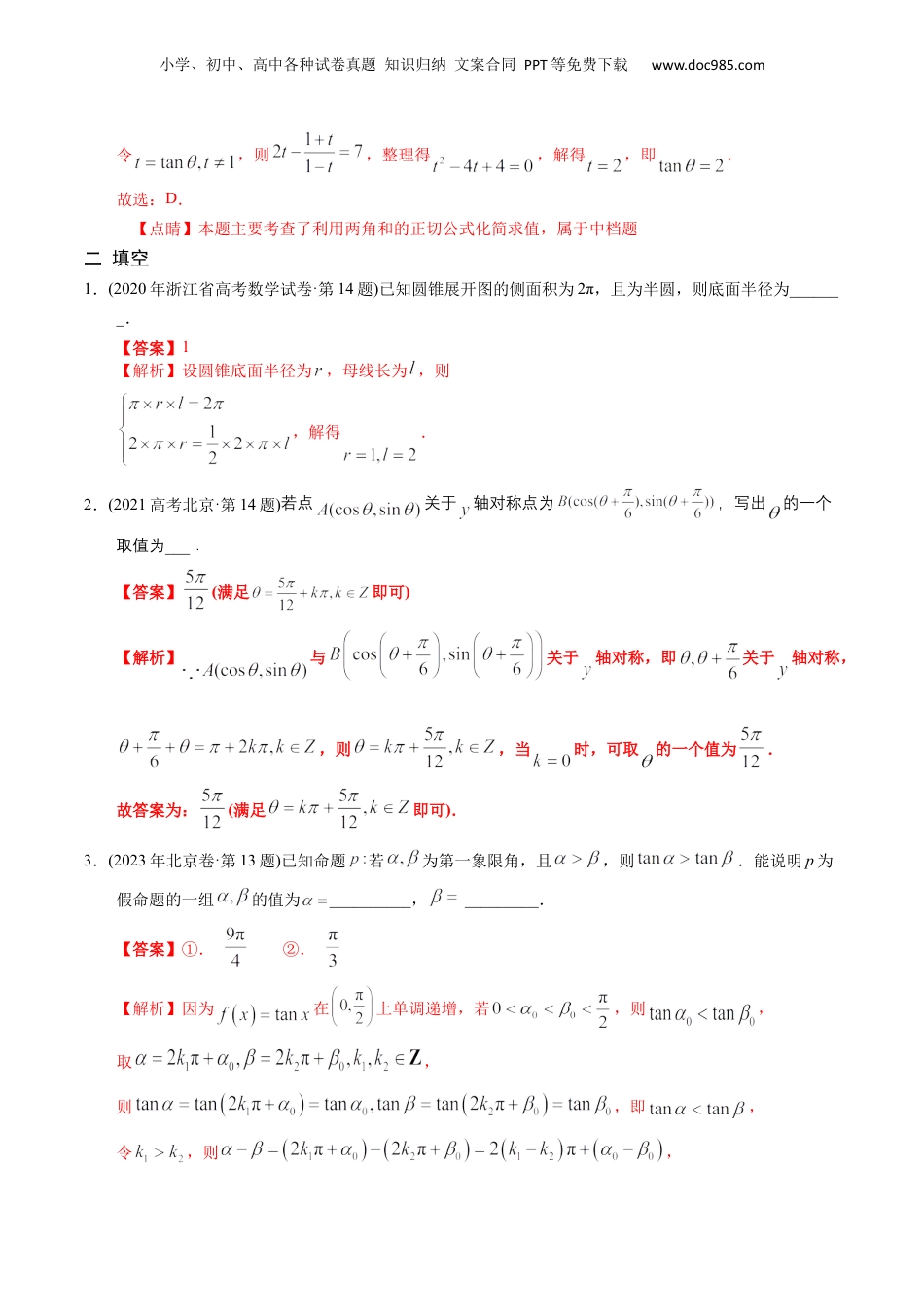 小学、初中、高中各种试卷真题知识归纳文案合同PPT等免费下载www.doc985.com五年(2019-2023)年高考真题分项汇编专题09三角函数三角函数作为高考必考题,高考题型一般作为小题出现,偶尔也会出现解答题。小题部分一般是函数解析式应用,求参数取值范围。考点01三角函数概念考点02三角函数恒等变形考点03三角函数图像及性质考点04三角函数综合应用考点01三角函数概念1.(2020年高考课标Ⅱ卷理科·第2题)若α为第四象限角,则()A.cos2α>0B.cos2α<0C.sin2α>0D.sin2α<0【答案】D【解析】方法一:由α为第四象限角,可得,所以此时的终边落在第三、四象限及轴的非正半轴上,所以故选:D.方法二:当时,,选项B错误;当时,,选项A错误;由在第四象限可得:,则,选项C错误,选项D正确;故选:D.【点睛】本题主要考查三角函数的符号,二倍角公式,特殊角的三角函数值等知识,意在考查学生的转化能力和计算求解能力.小学、初中、高中各种试卷真题知识归纳文案合同PPT等免费下载www.doc985.com2.(2020年高考课标Ⅰ卷理科·第9题)已知,且,则()A.B.C.D.【答案】A【解析】,得,即,解得或(舍去),又.故选:A.【点睛】本题考查三角恒等变换和同角间的三角函数关系求值,熟记公式是解题的关键,考查计算求解能力,属于基础题.3.(2021年高考全国甲卷理科·第9题)若,则()A.B.C.D.【答案】A【解析】,,,,解得,,.故选:A.【点睛】关键点睛:本题考查三角函数的化简问题,解题的关键是利用二倍角公式化简求出.4.(2020年高考课标Ⅲ卷理科·第9题)已知2tanθ–tan(θ+)=7,则tanθ=()A.–2B.–1C.1D.2【答案】D【解析】,,小学、初中、高中各种试卷真题知识归纳文案合同PPT等免费下载www.doc985.com令,则,整理得,解得,即.故选:D.【点睛】本题主要考查了利用两角和的正切公式化简求值,属于中档题二填空1.(2020年浙江省高考数学试卷·第14题)已知圆锥展开图的侧面积为2π,且为半圆,则底面半径为_______.【答案】1【解析】设圆锥底面半径为,母线长为,则,解得.2.(2021高考北京·第14题)若点关于轴对称点为,写出的一个取值为___.【答案】(满足即可)【解析】与关于轴对称,即关于轴对称,,则,当时,可取的一个值为.故答案为:(满足即可).3.(2023年北京卷·第13题)已知命题若为第一象限角,且,则.能说明p为假命题的一组的值为__________,_________.【答案】①.②.【解析】因为在上单调递增,若,则,取,则,即,令,则,小学、初中、高中各种试卷真题知识归纳文案合同PPT等免费下载www.doc985.com因为,则,即,则.不妨取,即满足题意.故答案为:.4.(2020年浙江省高考数学试卷·第13题)已知,则________;______.【答案】(1).(2).【解析】,,5.(2014高考数学陕西理科·第13题)设,向量,若∥,则_______.【答案】解析:,,因为,所以,,即.考点02三角函数恒等变形1.(2023年新课标全国Ⅰ卷·第8题)已知,则().A.B.C.D.【答案】B【解析】因为,而,因此,则,小学、初中、高中各种试卷真题知识归纳文案合同PPT等免费下载www.doc985.com所以.故选:B2.(2023年新课标全国Ⅱ卷·第7题)已知为锐角,,则().A.B.C.D.【答案】D解析:因为,而为锐角,解得:.故选:D.3.(2021年高考浙江卷·第8题)已知是互不相同的锐角,则在三个值中,大于的个数的最大值是()A.0B.1C.2D.3【答案】C解析:法1:由基本不等式有,同理,,故,故不可能均大于.取,,,则,故三式中大于的个数的最大值为2,故选C.法2:不妨设,则,由排列不等式可得:,而,故不可能均大于.小学、初中、高中各种试卷真题知识归纳文案合同PPT等免费下载www.doc985.com取,,,则,故三式中大于的个数的最大值为2,故选C.4.(2021年新高考Ⅰ卷·第6题)若,则()A.B.C.D.【答案】C解析:将式子进行齐次化处理得:,故选C.5.(2022新高考全国II卷·第6题)若,则()A.B.C.D.【答案】C【解析】由已知得:,即:,即:,所以,故选:C6.(2019·上海·第16题)已知.①存在在第一象限,角在第三象限;②存在在第二象限,角在第四象限;A.①②均正确;B...