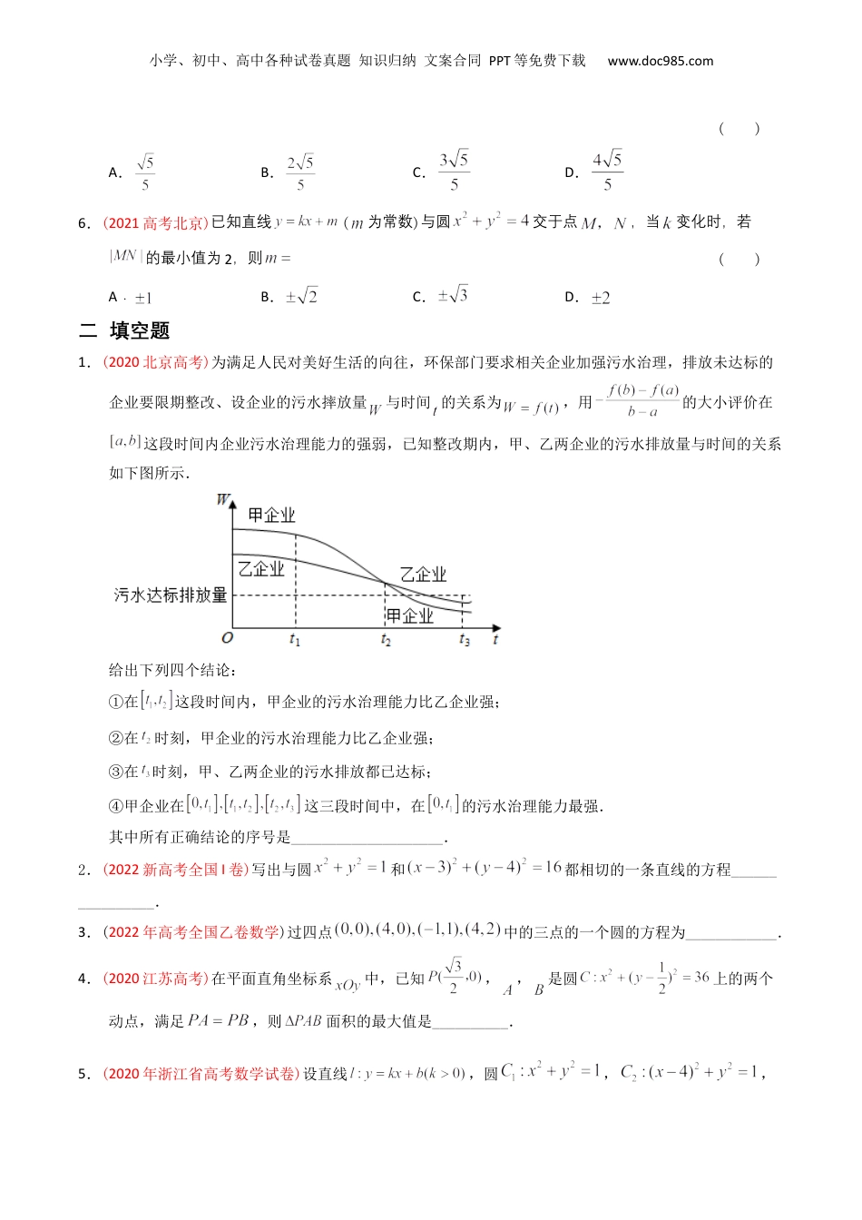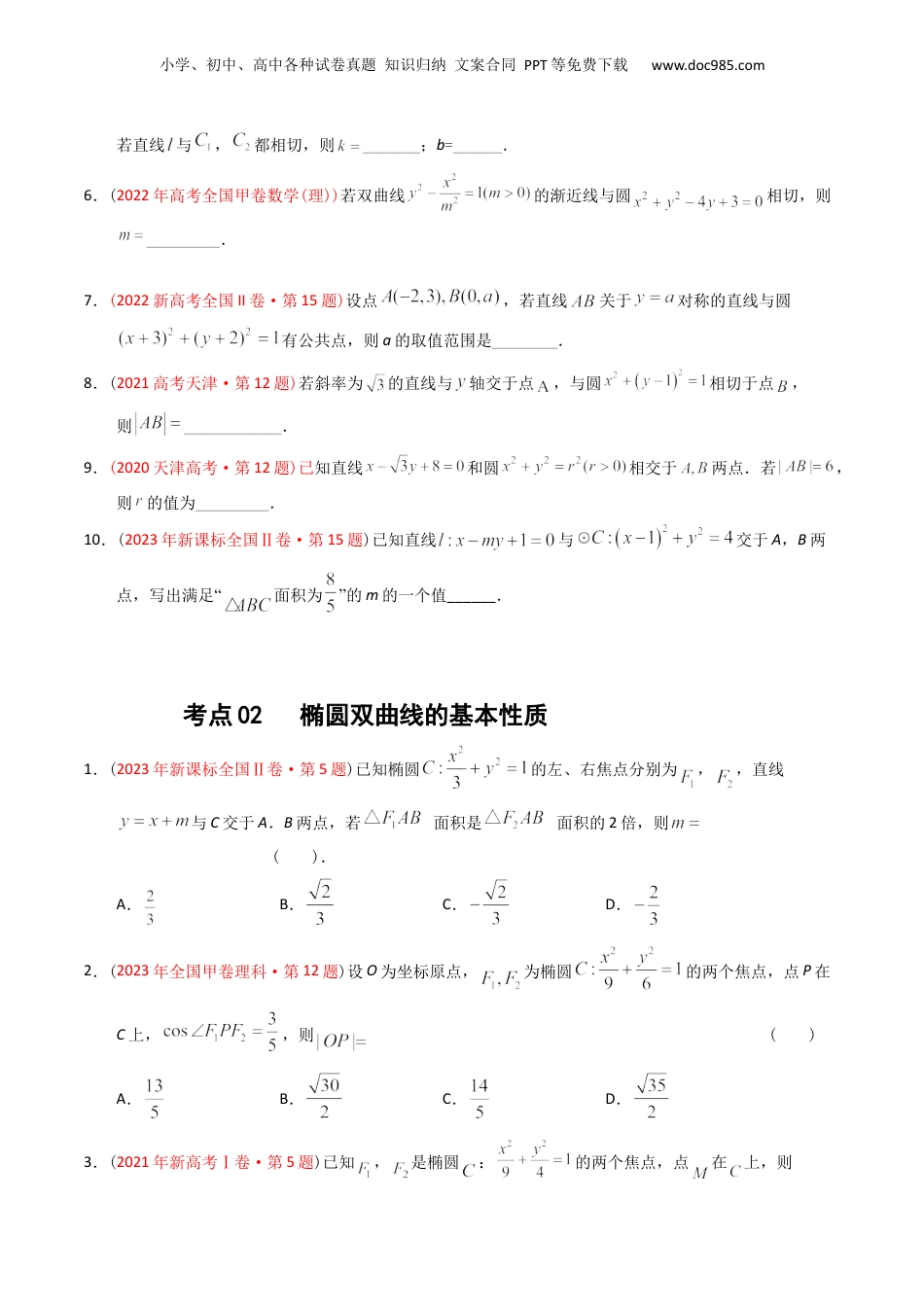 小学、初中、高中各种试卷真题知识归纳文案合同PPT等免费下载www.doc985.com五年(2019-2023)年高考真题分项汇编专题07平面解析几何(选填题)平面解析几何在高考中考查比例较大,一般是1+1+1模式或者是2+1+1模式。在选题中,解析几何一般为一道简单题目加上一道中等难度题目。常考题型为考点1:直线和圆的综合问题考点2:椭圆,双曲线基本性质考点3:椭圆双曲线的离心率考点4:抛物线性质及应用考点5:圆锥曲线的综合问题考点01直线与圆的综合问题1.(2022高考北京卷)若直线是圆的一条对称轴,则()A.B.C.1D.2.(2020北京高考)已知半径为的圆经过点,则其圆心到原点的距离的最小值为().A.B.C.D.3.(2023年新课标全国Ⅰ卷·)过点与圆相切的两条直线的夹角为,则()A.1B.C.D.4.(2020年高考课标Ⅰ卷)已知⊙M:,直线:,为上的动点,过点作⊙M的切线,切点为,当最小时,直线的方程为()A.B.C.D.5.(2020年高考课标Ⅱ卷)若过点(2,1)的圆与两坐标轴都相切,则圆心到直线的距离为小学、初中、高中各种试卷真题知识归纳文案合同PPT等免费下载www.doc985.com()A.B.C.D.6.(2021高考北京)已知直线(为常数)与圆交于点,当变化时,若的最小值为2,则()A.B.C.D.二填空题1.(2020北京高考)为满足人民对美好生活的向往,环保部门要求相关企业加强污水治理,排放未达标的企业要限期整改、设企业的污水摔放量与时间的关系为,用的大小评价在这段时间内企业污水治理能力的强弱,已知整改期内,甲、乙两企业的污水排放量与时间的关系如下图所示.给出下列四个结论:①在这段时间内,甲企业的污水治理能力比乙企业强;②在时刻,甲企业的污水治理能力比乙企业强;③在时刻,甲、乙两企业的污水排放都已达标;④甲企业在这三段时间中,在的污水治理能力最强.其中所有正确结论的序号是____________________.2.(2022新高考全国I卷)写出与圆和都相切的一条直线的方程________________.3.(2022年高考全国乙卷数学)过四点中的三点的一个圆的方程为____________.4.(2020江苏高考)在平面直角坐标系中,已知,,是圆上的两个动点,满足,则面积的最大值是__________.5.(2020年浙江省高考数学试卷)设直线,圆,,小学、初中、高中各种试卷真题知识归纳文案合同PPT等免费下载www.doc985.com若直线与,都相切,则_______;b=______.6.(2022年高考全国甲卷数学(理))若双曲线的渐近线与圆相切,则_________.7.(2022新高考全国II卷·第15题)设点,若直线关于对称的直线与圆有公共点,则a的取值范围是________.8.(2021高考天津·第12题)若斜率为的直线与轴交于点,与圆相切于点,则____________.9.(2020天津高考·第12题)已知直线和圆相交于两点.若,则的值为_________.10.(2023年新课标全国Ⅱ卷·第15题)已知直线与交于A,B两点,写出满足“面积为”的m的一个值______.考点02椭圆双曲线的基本性质1.(2023年新课标全国Ⅱ卷·第5题)已知椭圆的左、右焦点分别为,,直线与C交于A.B两点,若面积是面积的2倍,则().A.B.C.D.2.(2023年全国甲卷理科·第12题)设O为坐标原点,为椭圆的两个焦点,点P在C上,,则()A.B.C.D.3.(2021年新高考Ⅰ卷·第5题)已知,是椭圆:的两个焦点,点在上,则小学、初中、高中各种试卷真题知识归纳文案合同PPT等免费下载www.doc985.com的最大值为()A.13B.12C.9D.64(2022年高考全国甲卷数学(理)·第10题)椭圆的左顶点为A.点P,Q均在C上,且关于y轴对称.若直线的斜率之积为,则C的离心率为()A.B.C.D.5.(2019·全国Ⅰ·理·第10题)已知椭圆的焦点为,,过的直线与交于,两点.若,,则的方程为()A.B.C.D.6.(2023年全国乙卷理科·第11题)设A.B为双曲线上两点,下列四个点中,可为线段AB中点的是()A.B.C.D.7(2020年高考课标Ⅲ卷理科·第11题)设双曲线C:(a>0,b>0)的左、右焦点分别为F1,F2,离心率为.P是C上一点,且F1P⊥F2P.若△PF1F2的面积为4,则a=()A.1B.2C.4D.88.(2020年浙江省高考数学试卷·第8题)已知点O(0,0),A(–2,0),B(2,0).设点P满足|PA.–|PB.=2,且P为函数y=图像上的点,则|OP|=()A....