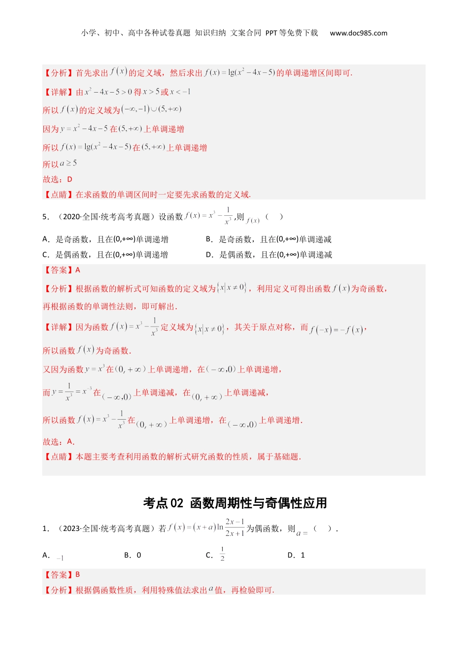 小学、初中、高中各种试卷真题知识归纳文案合同PPT等免费下载www.doc985.com五年(2019-2023)年高考真题分项汇编专题02函数概念与基本初等函数函数概念与基本初等函数常考题型一般为选择题,中等难度,属于送分题。一般的出题类型为选择,填空。对于函数周期与奇偶性以及综合应用一般难度比较大,技巧比较强。考点01函数概念与单调性1.(2023·全国·统考高考真题)设函数在区间上单调递减,则的取值范围是()A.B.C.D.【答案】D【分析】利用指数型复合函数单调性,判断列式计算作答.【详解】函数在R上单调递增,而函数在区间上单调递减,则有函数在区间上单调递减,因此,解得,所以的取值范围是.故选:D2.(2021·全国·统考高考真题)下列函数中最小值为4的是()A.B.小学、初中、高中各种试卷真题知识归纳文案合同PPT等免费下载www.doc985.comC.D.【答案】C【分析】根据二次函数的性质可判断选项不符合题意,再根据基本不等式“一正二定三相等”,即可得出不符合题意,符合题意.【详解】对于A,,当且仅当时取等号,所以其最小值为,A不符合题意;对于B,因为,,当且仅当时取等号,等号取不到,所以其最小值不为,B不符合题意;对于C,因为函数定义域为,而,,当且仅当,即时取等号,所以其最小值为,C符合题意;对于D,,函数定义域为,而且,如当,,D不符合题意.故选:C.【点睛】本题解题关键是理解基本不等式的使用条件,明确“一正二定三相等”的意义,再结合有关函数的性质即可解出.3.(2021·全国·高考真题)下列函数中是增函数的为()A.B.C.D.【答案】D【分析】根据基本初等函数的性质逐项判断后可得正确的选项.【详解】对于A,为上的减函数,不合题意,舍.对于B,为上的减函数,不合题意,舍.对于C,在为减函数,不合题意,舍.对于D,为上的增函数,符合题意,故选:D.4.(2020·海南·高考真题)已知函数在上单调递增,则的取值范围是()A.B.C.D.【答案】D小学、初中、高中各种试卷真题知识归纳文案合同PPT等免费下载www.doc985.com【分析】首先求出的定义域,然后求出的单调递增区间即可.【详解】由得或所以的定义域为因为在上单调递增所以在上单调递增所以故选:D【点睛】在求函数的单调区间时一定要先求函数的定义域.5.(2020·全国·统考高考真题)设函数,则()A.是奇函数,且在(0,+∞)单调递增B.是奇函数,且在(0,+∞)单调递减C.是偶函数,且在(0,+∞)单调递增D.是偶函数,且在(0,+∞)单调递减【答案】A【分析】根据函数的解析式可知函数的定义域为,利用定义可得出函数为奇函数,再根据函数的单调性法则,即可解出.【详解】因为函数定义域为,其关于原点对称,而,所以函数为奇函数.又因为函数在上单调递增,在上单调递增,而在上单调递减,在上单调递减,所以函数在上单调递增,在上单调递增.故选:A.【点睛】本题主要考查利用函数的解析式研究函数的性质,属于基础题.考点02函数周期性与奇偶性应用1.(2023·全国·统考高考真题)若为偶函数,则().A.B.0C.D.1【答案】B【分析】根据偶函数性质,利用特殊值法求出值,再检验即可.小学、初中、高中各种试卷真题知识归纳文案合同PPT等免费下载www.doc985.com【详解】因为为偶函数,则,解得,当时,,,解得或,则其定义域为或,关于原点对称.,故此时为偶函数.故选:B.2.(2020·全国·统考高考真题)设函数,则f(x)()A.是偶函数,且在单调递增B.是奇函数,且在单调递减C.是偶函数,且在单调递增D.是奇函数,且在单调递减【答案】D【分析】根据奇偶性的定义可判断出为奇函数,排除AC;当时,利用函数单调性的性质可判断出单调递增,排除B;当时,利用复合函数单调性可判断出单调递减,从而得到结果.【详解】由得定义域为,关于坐标原点对称,又,为定义域上的奇函数,可排除AC;当时,,在上单调递增,在上单调递减,在上单调递增,排除B;当时,,在上单调递减,在定义域内单调递增,小学、初中、高中各种试卷真题知识归纳文案合同PPT等免费下载www.doc985.com根据复合函数单调性可知:在上单调递减,D正确.故选:D.【点睛】本题考查函数奇偶性和单...