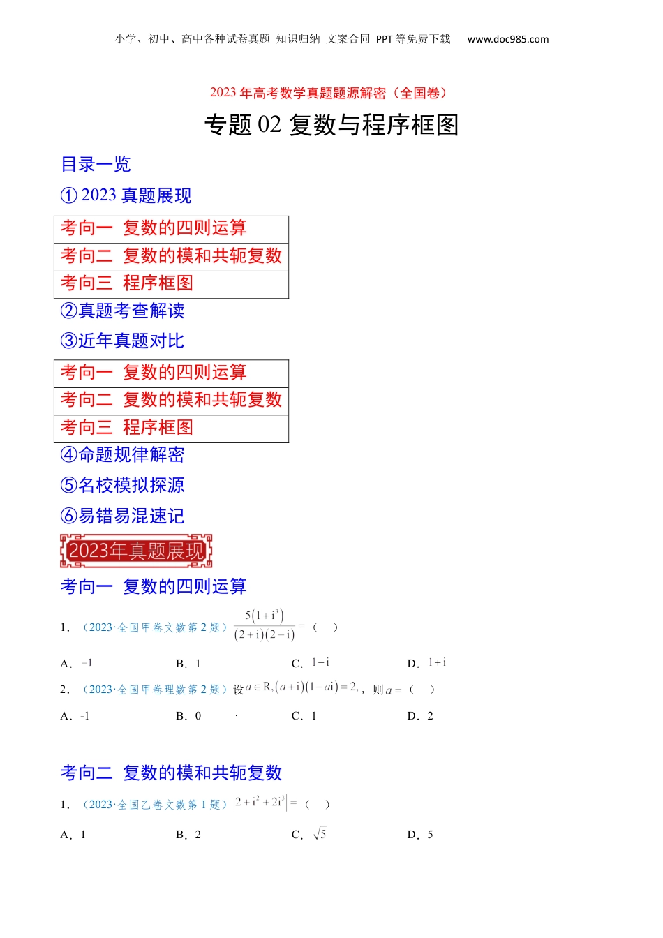 小学、初中、高中各种试卷真题知识归纳文案合同PPT等免费下载www.doc985.com2023年高考数学真题题源解密(全国卷)专题02复数与程序框图目录一览①2023真题展现考向一复数的四则运算考向二复数的模和共轭复数考向三程序框图②真题考查解读③近年真题对比考向一复数的四则运算考向二复数的模和共轭复数考向三程序框图④命题规律解密⑤名校模拟探源⑥易错易混速记考向一复数的四则运算1.(2023·全国甲卷文数第2题)()A.B.1C.D.2.(2023·全国甲卷理数第2题)设,则()A.-1B.0·C.1D.2考向二复数的模和共轭复数1.(2023·全国乙卷文数第1题)()A.1B.2C.D.5小学、初中、高中各种试卷真题知识归纳文案合同PPT等免费下载www.doc985.com2.(2023·全国乙卷理数第1题)设,则()A.B.C.D.考向三程序框图1.(2023·全国甲卷理数第3题)执行下面的程序框图,输出的()A.21B.34C.55D.89【命题意图】1.复数的四则运算(1)会进行复数代数形式的四则运算.学科-网[来源:学科网ZXXK](2)了解复数代数形式的加、减运算的几何意义.2.算法的含义、程序框图(1)了解算法的含义,了解算法的思想.(2)理解程序框图的三种基本逻辑结构:顺序、条件分支、循环.(3)理解几种基本算法语句——输入语句、输出语句、赋值语句、条件语句、循环语句的含义.【考查要点】(1)复数是以考查复数的四则运算为主,偶尔与其他知识交汇,难度较小。考查代数运算的同时,主要涉及考查的概念有:复数的代数形式、复数的模、复数的几何意义。(2)算法主要考查循环结构的程序框图,对此要把握四点:循环变量和初始条件是什么;哪些是循环体,顺序怎样;终止条件是什么;输出的是什么,考查直接输出结果的,往往属于容易题,会出现在选择题或填空题靠前的位置【得分要点】高频考点:复数的四则运算、程序框图小学、初中、高中各种试卷真题知识归纳文案合同PPT等免费下载www.doc985.com中频考点:复数的模、共轭复数、复数的代数形式低频考点:复数的几何意义考向一复数的四则运算一、单选题1.(2022·全国乙卷文数第1题)设,其中为实数,则()A.B.C.D.2.(2021·全国乙卷文数第2题)设,则()A.B.C.D.3.(2022·全国甲卷理数第3题)已知,则()A.B.C.D.考向二复数的模和共轭复数一、单选题1.(2022·全国乙卷理数第2题)已知,且,其中a,b为实数,则()A.B.C.D.2.(2022·全国甲卷文数第3题)若.则()A.B.C.D.3.(2022·全国甲卷理数第1题)若,则()A.B.C.D.4.(2021·全国乙卷理数第1题)设,则()A.B.C.D.考向三程序框图一、单选题1.(2022·全国乙卷文数第7题)执行下边的程序框图,输出的()小学、初中、高中各种试卷真题知识归纳文案合同PPT等免费下载www.doc985.comA.3B.4C.5D.6(1)复数主要考查是它的基本运算、基本概念。备考应注重复数的基本概念、基本运算以及复数的几何意义,应做到运算准确,保证不丢分。适当关注复数的几何意义,复数代数形式的三角表示,复数与三角等的结合问题。预计2024年主要还是考查复数的四则运算。(2)程序框图问题的难点是考查逆向确定算法中的判断条件、循环语句等,难度较大,解法具有开放性。一、单选题1.(2023·山东菏泽三模)已知为虚数单位,且复数满足,则()A.1B.2C.D.2.(2023·河北·校联考三模)已知复数的共轭复数为,若的实部为1,且满足,则的虚部为()A.B.C.-1D.13.(2023·河南·襄城三模)复数在复平面内对应的点位于()A.第一象限B.第二象限C.第三象限D.第四象限4.(2023·河南开封三模)在复平面内,复数对应的点的坐标为,则()A.B.C.D.5.(2023·河北衡水三模)已知复数,且,其中a,b为实数,则()小学、初中、高中各种试卷真题知识归纳文案合同PPT等免费下载www.doc985.comA.,B.,C.,D.,6.(2023·黑龙江哈尔滨三模)已知复数z满足,则()A.B.C.D.7.(2023·山东烟台三模)已知复数满足,则()A.1B.C.D.28.(2023·广东广州三模)设复数满足(是虚数单位),则()A.B.C.D.9.(2023·新疆阿勒泰三模)已知...