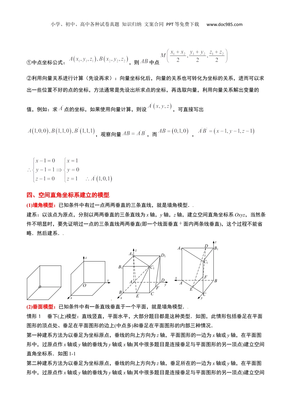小学、初中、高中各种试卷真题知识归纳文案合同PPT等免费下载www.doc985.com【一轮复习讲义】2024年高考数学高频考点题型归纳与方法总结(新高考通用)素养拓展28立体几何中的建系设点问题(精讲+精练)一、建系设点有关的基础储备与垂直相关的定理与结论(1)线面垂直①如果一条直线与一个平面上的两条相交直线垂直,则这条直线与该平面垂直②两条平行线,如果其中一条与平面垂直,那么另外一条也与这个平面垂直③两个平面垂直,则其中一个平面上垂直交线的直线与另一个平面垂直④直棱柱:侧棱与底面垂直;⑤有一条侧棱垂直于底面的椎体。⑥正三棱柱、正四棱柱:顶点在底面的投影为底面的中心。⑦侧面与底面所成角均相等或侧棱长均相等可得顶点在底面的投影为底面的中心。(2)线线垂直(相交垂直)①正方形,矩形,直角梯形②等腰三角形底边上的中线与底边垂直(三线合一)③菱形的对角线相互垂直④勾股定理逆定理:若,则二、建立直角坐标系的原则1.轴的选取往往是比较容易的,依据的是线面垂直,即轴要与坐标平面垂直,在几何体中也是很直观的,垂直底面高高向上的即是,而坐标原点即为轴与底面的交点2.轴的选取:此为坐标是否易于写出的关键,有这么几个原则值得参考:(1)尽可能的让底面上更多的点位于轴上(2)找角:轴要相互垂直,所以要利用好底面中的垂直条件(3)找对称关系:寻找底面上的点能否存在轴对称特点3.常用的空间直角坐标系满足轴成右手系,所以在标轴时要注意。一、知识点梳理小学、初中、高中各种试卷真题知识归纳文案合同PPT等免费下载www.doc985.com4.同一个几何体可以有不同的建系方法,其坐标也会对应不同。但是通过坐标所得到的结论(位置关系,角)是一致的。5.解答题中,在建立空间直角坐标系之前,要先证明所用坐标轴为两两垂直(即一个线面垂直底面两条线垂直),这个过程不能省略。三、坐标的书写1.能够直接写出坐标的点(1)坐标轴上的点,例如在正方体(长度为1)中的点,坐标特点如下:轴:轴:轴:(2)底面上的点:坐标均为,即竖坐标,由于底面在作立体图时往往失真,所以要快速正确写出坐标,强烈建议在旁边作出底面的平面图进行参考:以下图为例:则可快速写出点的坐标,位置关系清晰明了2.空间中在底面投影为特殊位置的点如果在底面的投影为,那么(即点与投影点的横纵坐标相同)这条规律出发,在写空间中的点时,可看下在底面的投影点,坐标是否好写。如果可以则直接确定了横纵坐标,而竖坐标为该点到底面的距离。例如:正方体中的点,其投影为,而所以,而其到底面的距离为,故坐标为以上两个类型已经可以囊括大多数几何体中的点,但总还有一些特殊点,那么就要用到第三个方法:3.需要计算的点IHOCAB小学、初中、高中各种试卷真题知识归纳文案合同PPT等免费下载www.doc985.com①中点坐标公式:,则中点②利用向量关系进行计算(先设再求):向量坐标化后,向量的关系也可转化为坐标的关系,进而可以求出一些位置不好的点的坐标,方法通常是先设出所求点的坐标,再选取向量,利用向量关系解出变量的值,例如:求点的坐标,如果使用向量计算,则设,可直接写出,观察向量,而,四、空间直角坐标系建立的模型(1)墙角模型:已知条件中有过一点两两垂直的三条直线,就是墙角模型.建系:以该点为原点,分别以两两垂直的三条直线为x轴,y轴,z轴,建立空间直角坐标系Oxyz,当然条件不明显时,要先证明过一点的三条直线两两垂直(即一个线面垂直面内两条线垂直),这个过程不能省略.然后建系.xyzOBADCA1B1C1D1EFxyzBACA1B1C1DFExyz(2)垂面模型:已知条件中有一条直线垂直于一个平面,就是墙角模型.情形1垂下(上)模型:直线竖直,平面水平,大部分题目都是这种类型.如图,此情形包括垂足在平面图形的顶点处、垂足在平面图形的边上(中点多)和垂足在平面图形的内部三种情况.第一种建系方法为以垂足为坐标原点,垂线的向上方向为z轴,平面图形的一边为x轴或y轴,在平面图形中,过原点作x轴或y轴的垂线为y轴或x轴(其中很多题目是连接垂足与平面图形的另一顶点)建立空间直角坐标系.如图1-1第二种建系方法为以垂足为坐标原点,垂线的向上方向...
