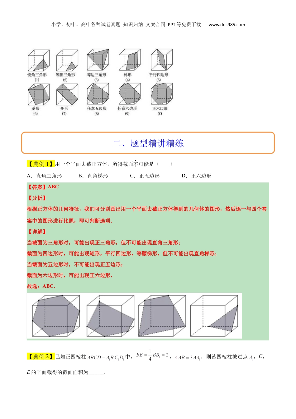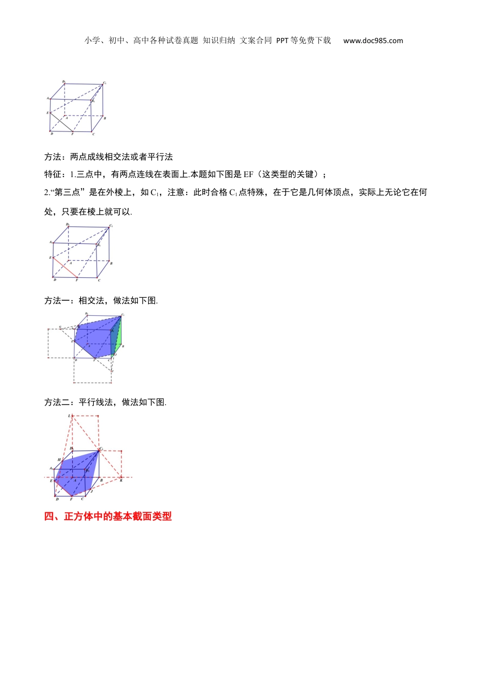 小学、初中、高中各种试卷真题知识归纳文案合同PPT等免费下载www.doc985.com【一轮复习讲义】2024年高考数学高频考点题型归纳与方法总结(新高考通用)素养拓展25立体几何中的截面问题(精讲+精练)一、截面问题的理论依据(1)确定平面的条件①不在同一平面的三点确定一个平面;②两条平行线确定一个平面(2)如果两个不重合的平面有一个公共点,那么它们相交于过此点的一条直线(3)如果一条直线上的两点在一个平面内,那么这条直线上所有的点都在这个平面内(4)如果一条直线平行于一个平面,且经过这条直线的平面与这个平面相交,那么这条直线就和交线平行(5)如果两个平面平行,第三个平面和它们相交,那么两条交线平行二、截面问题的基本思路1.定义相关要素①用一个平面去截几何体,此平面与几何体的交集,叫做这个几何体的截面.②此平面与几何体表面的交集(交线)叫做截线.③此平面与几何体的棱(或面)的交集(交点)叫做实截点.④此平面与几何体的棱(或面)的延长线的交点叫做虚截点.⑤截面中能够确定的一部分平面叫做截小面.2.作截面的基本逻辑:找截点→连截线→围截面3.作截面的具体步骤(1)找截点:方式1:延长截小面上的一条直线,与几何体的棱、面(或其延长部分)相交,交点即截点方式2:过一截点作另外两截点连线的平行线,交几何体的棱于截点(2)连截线:连接同一平面内的两个截点,成截线(3)围截面:将各截线首尾相连,围成截面三、作截面的几种方法(1)直接法:有两点在几何体的同一个面上,连接该两点即为几何体与截面的交线,找截面实际就是找交线的过程。(2)延长线法:同一个平面有两个点,可以连线并延长至与其他平面相交找到交点。(3)平行线法:过直线与直线外一点作截面,拖直线所在的面与点所在的平面平行,可以通过过点找直线的平行线找到几何体的截面的交线。模型演练:如下图E、F是几等分点,不影响作图。可以先默认为中点,等完全理解了,再改成任意等分点一、知识点梳理小学、初中、高中各种试卷真题知识归纳文案合同PPT等免费下载www.doc985.com方法:两点成线相交法或者平行法特征:1.三点中,有两点连线在表面上.本题如下图是EF(这类型的关键);2.“第三点”是在外棱上,如C1,注意:此时合格C1点特殊,在于它是几何体顶点,实际上无论它在何处,只要在棱上就可以.方法一:相交法,做法如下图.方法二:平行线法,做法如下图.四、正方体中的基本截面类型小学、初中、高中各种试卷真题知识归纳文案合同PPT等免费下载www.doc985.com【典例1】用一个平面去截正方体,所得截面不可能是()A.直角三角形B.直角梯形C.正五边形D.正六边形【答案】ABC【分析】根据正方体的几何特征,我们可分别画出用一个平面去截正方体得到的几何体的图形,然后逐一与四个答案中的图形进行比照,即可判断选项.【详解】当截面为三角形时,可能出现正三角形,但不可能出现直角三角形;截面为四边形时,可能出现矩形,平行四边形,等腰梯形,但不可能出现直角梯形;当截面为五边形时,不可能出现正五边形;截面为六边形时,可能出现正六边形,故选:ABC.【典例2】已知正四棱柱中,,,则该四棱柱被过点,C,E的平面截得的截面面积为______.二、题型精讲精练小学、初中、高中各种试卷真题知识归纳文案合同PPT等免费下载www.doc985.com【答案】【分析】在上取点,使得,连接,则四边形是平行四边形,由勾股定理可得,再结合余弦定理与面积公式即可求解【详解】由题意,正四棱柱中,,,可得,在上取点,使得,连接,则有,所以四边形是平行四边形,由勾股定理可得,所以,所以,所以四边形是平行四边形的面积为,故答案为:【典例3】如图,在正方体中,,为棱的中点,为棱的四等分点(靠近点),过点作该正方体的截面,则该截面的周长是___________.小学、初中、高中各种试卷真题知识归纳文案合同PPT等免费下载www.doc985.com【答案】【分析】首先根据面面平行的性质定理作出过点的正方体的截面,从而求截面的周长.【详解】如图,取的中点,取上靠近点的三等分点,连接,易证,则五边形为所求截面.因为,所以,则,故该截面的周长是.故答案为:.【典例4】已知三棱锥的所有棱长...