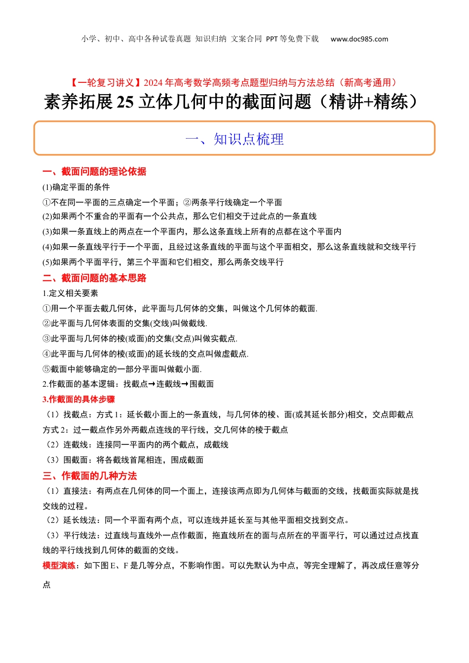 小学、初中、高中各种试卷真题知识归纳文案合同PPT等免费下载www.doc985.com【一轮复习讲义】2024年高考数学高频考点题型归纳与方法总结(新高考通用)素养拓展25立体几何中的截面问题(精讲+精练)一、截面问题的理论依据(1)确定平面的条件①不在同一平面的三点确定一个平面;②两条平行线确定一个平面(2)如果两个不重合的平面有一个公共点,那么它们相交于过此点的一条直线(3)如果一条直线上的两点在一个平面内,那么这条直线上所有的点都在这个平面内(4)如果一条直线平行于一个平面,且经过这条直线的平面与这个平面相交,那么这条直线就和交线平行(5)如果两个平面平行,第三个平面和它们相交,那么两条交线平行二、截面问题的基本思路1.定义相关要素①用一个平面去截几何体,此平面与几何体的交集,叫做这个几何体的截面.②此平面与几何体表面的交集(交线)叫做截线.③此平面与几何体的棱(或面)的交集(交点)叫做实截点.④此平面与几何体的棱(或面)的延长线的交点叫做虚截点.⑤截面中能够确定的一部分平面叫做截小面.2.作截面的基本逻辑:找截点→连截线→围截面3.作截面的具体步骤(1)找截点:方式1:延长截小面上的一条直线,与几何体的棱、面(或其延长部分)相交,交点即截点方式2:过一截点作另外两截点连线的平行线,交几何体的棱于截点(2)连截线:连接同一平面内的两个截点,成截线(3)围截面:将各截线首尾相连,围成截面三、作截面的几种方法(1)直接法:有两点在几何体的同一个面上,连接该两点即为几何体与截面的交线,找截面实际就是找交线的过程。(2)延长线法:同一个平面有两个点,可以连线并延长至与其他平面相交找到交点。(3)平行线法:过直线与直线外一点作截面,拖直线所在的面与点所在的平面平行,可以通过过点找直线的平行线找到几何体的截面的交线。模型演练:如下图E、F是几等分点,不影响作图。可以先默认为中点,等完全理解了,再改成任意等分点一、知识点梳理小学、初中、高中各种试卷真题知识归纳文案合同PPT等免费下载www.doc985.com方法:两点成线相交法或者平行法特征:1.三点中,有两点连线在表面上.本题如下图是EF(这类型的关键);2.“第三点”是在外棱上,如C1,注意:此时合格C1点特殊,在于它是几何体顶点,实际上无论它在何处,只要在棱上就可以.方法一:相交法,做法如下图.方法二:平行线法,做法如下图.四、正方体中的基本截面类型小学、初中、高中各种试卷真题知识归纳文案合同PPT等免费下载www.doc985.com【典例1】用一个平面去截正方体,所得截面不可能是()A.直角三角形B.直角梯形C.正五边形D.正六边形【答案】ABC【分析】根据正方体的几何特征,我们可分别画出用一个平面去截正方体得到的几何体的图形,然后逐一与四个答案中的图形进行比照,即可判断选项.【详解】当截面为三角形时,可能出现正三角形,但不可能出现直角三角形;截面为四边形时,可能出现矩形,平行四边形,等腰梯形,但不可能出现直角梯形;当截面为五边形时,不可能出现正五边形;截面为六边形时,可能出现正六边形,故选:ABC.【典例2】已知正四棱柱中,,,则该四棱柱被过点,C,E的平面截得的截面面积为______.二、题型精讲精练小学、初中、高中各种试卷真题知识归纳文案合同PPT等免费下载www.doc985.com【答案】【分析】在上取点,使得,连接,则四边形是平行四边形,由勾股定理可得,再结合余弦定理与面积公式即可求解【详解】由题意,正四棱柱中,,,可得,在上取点,使得,连接,则有,所以四边形是平行四边形,由勾股定理可得,所以,所以,所以四边形是平行四边形的面积为,故答案为:【典例3】如图,在正方体中,,为棱的中点,为棱的四等分点(靠近点),过点作该正方体的截面,则该截面的周长是___________.小学、初中、高中各种试卷真题知识归纳文案合同PPT等免费下载www.doc985.com【答案】【分析】首先根据面面平行的性质定理作出过点的正方体的截面,从而求截面的周长.【详解】如图,取的中点,取上靠近点的三等分点,连接,易证,则五边形为所求截面.因为,所以,则,故该截面的周长是.故答案为:.【典例4】已知三棱锥的所有棱长...