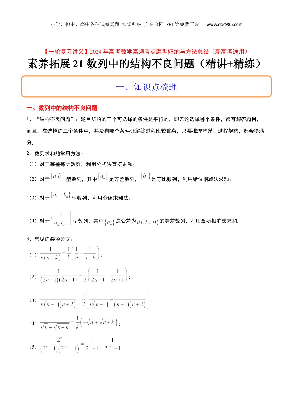 小学、初中、高中各种试卷真题知识归纳文案合同PPT等免费下载www.doc985.com【一轮复习讲义】2024年高考数学高频考点题型归纳与方法总结(新高考通用)素养拓展21数列中的结构不良问题(精讲+精练)一、数列中的结构不良问题1.“结构不良问题”:题目所给的三个可选择的条件是平行的,即无论选择哪个条件,都可解答题目,而且,在选择的三个条件中,并没有哪个条件让解答过程比较繁杂,只要推理严谨、过程规范,都会得满分.2.数列求和的常用方法:(1)对于等差等比数列,利用公式法直接求和;(2)对于型数列,其中是等差数列,是等比数列,利用错位相减法求和;(3)对于型数列,利用分组求和法;(4)对于型数列,其中是公差为的等差数列,利用裂项相消法求和.3.常见的裂项公式:(1);(2);(3);(4);(5).一、知识点梳理小学、初中、高中各种试卷真题知识归纳文案合同PPT等免费下载www.doc985.com【典例1】(2021·全国·统考高考真题)已知数列的各项均为正数,记为的前n项和,从下面①②③中选取两个作为条件,证明另外一个成立.①数列是等差数列:②数列是等差数列;③.注:若选择不同的组合分别解答,则按第一个解答计分.【详解】选①②作条件证明③:[方法一]:待定系数法+与关系式设,则,当时,;当时,;因为也是等差数列,所以,解得;所以,,故.[方法二]:待定系数法设等差数列的公差为d,等差数列的公差为,则,将代入,化简得对于恒成立.则有,解得.所以.选①③作条件证明②:二、题型精讲精练小学、初中、高中各种试卷真题知识归纳文案合同PPT等免费下载www.doc985.com因为,是等差数列,所以公差,所以,即,因为,所以是等差数列.选②③作条件证明①:[方法一]:定义法设,则,当时,;当时,;因为,所以,解得或;当时,,当时,满足等差数列的定义,此时为等差数列;当时,,不合题意,舍去.综上可知为等差数列.[方法二]【最优解】:求解通项公式因为,所以,,因为也为等差数列,所以公差,所以,故,当时,,当时,满足上式,故的通项公式为,所小学、初中、高中各种试卷真题知识归纳文案合同PPT等免费下载www.doc985.com以,,符合题意.【题型训练-刷模拟】一、解答题1.(2023春·四川成都·高三树德中学校考开学考试)已知公差为正数的等差数列的前项和为,________.请从以下二个条件中任选一个,补充在题干的横线上,并解答下列问题:①成等比数列,②.(1)求数列的通项公式;(2)若,求数列的前n项和.【答案】(1)(2)【分析】(1)先设等差数列的公差为,再根据等差数列的求和公式和等比中项的性质,根据条件①②分别列出关于首项与公差的方程,解出的值,即可计算出数列的通项公式;(2)先根据第(1)题的结果计算出数列的通项公式,再运用裂项相消法即可计算出前项和.【详解】(1)由题意,设等差数列的公差为,方案一:选择条件①,根据成等比数列得,代入得,又,小学、初中、高中各种试卷真题知识归纳文案合同PPT等免费下载www.doc985.com化简整理,可得,由于,所以,,.方案二:选择条件②由,可得,又,解得,,(2)由(1)可得,则.2.(2023春·江苏宿迁·高三江苏省泗阳中学校考阶段练习)设为等差数列的前n项和,是正项等比数列,且.在①,②,③这三个条件中任选一个,回答下列问题:(1)求数列和的通项公式;(2)如果,写出的关系式,并求的值.注:如果选择多个条件分别解答,按第一个解答计分.小学、初中、高中各种试卷真题知识归纳文案合同PPT等免费下载www.doc985.com【答案】(1)(2),【分析】(1)设等差数列的公差为,等比数列的公比为,根据所选条件得到方程,求出、,即可求出通项公式;(2)由(1)可得,即可得到、的关系,从而得到,再利用分组求和法及等比数列求和公式计算可得.【详解】(1)若选①,,设等差数列的公差为,等比数列的公比为,则,解得或(舍去),则,.若选②,,设等差数列的公差为,等比数的公比为.因为,所以,解得,所以.又因为,所以,解得,所以.若选③,,小学、初中、高中各种试卷真题知识归纳文案合同PPT等免费下载www.doc985.com设等差数列的公差为,等比数列的公比为....