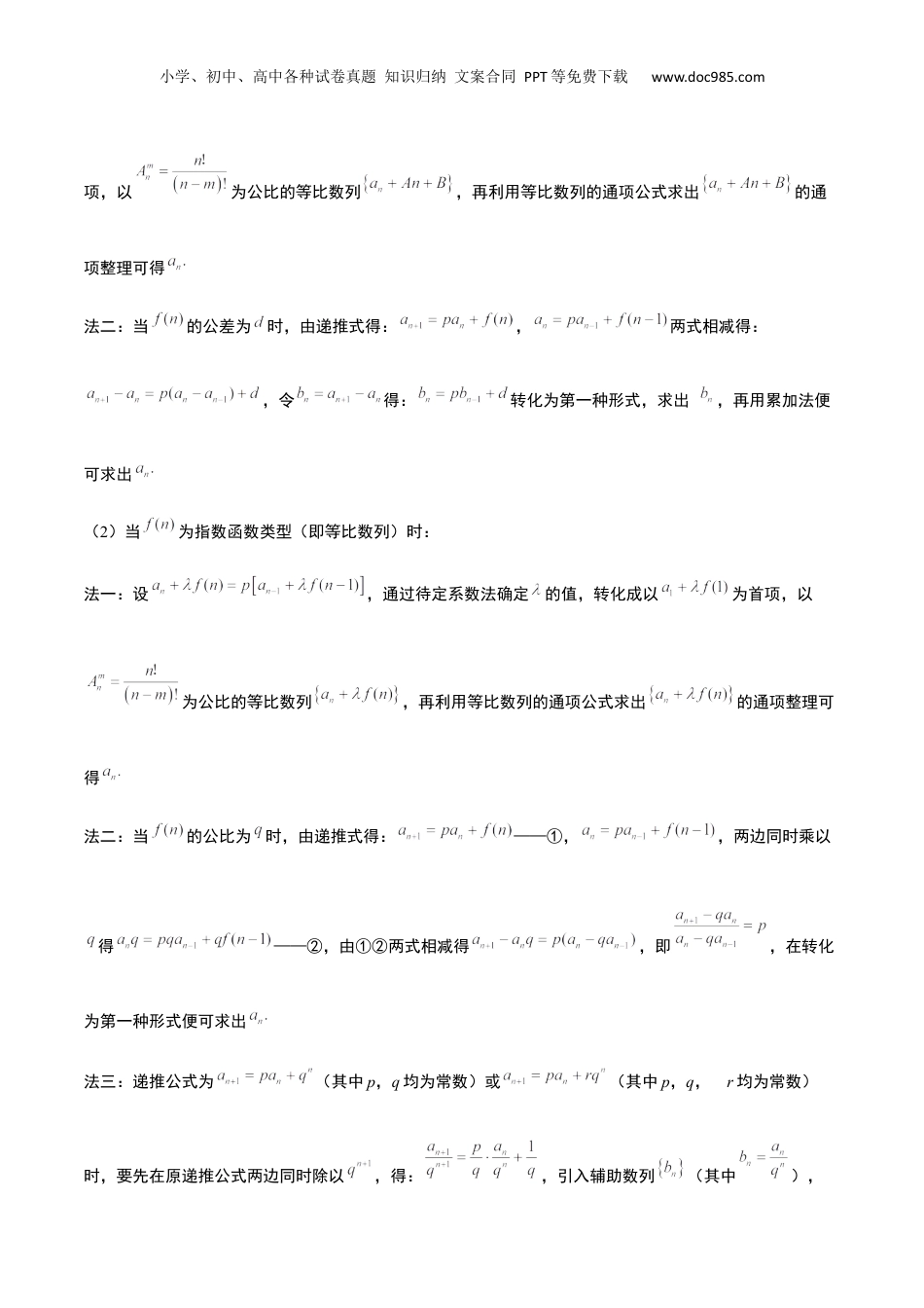 小学、初中、高中各种试卷真题知识归纳文案合同PPT等免费下载www.doc985.com【一轮复习讲义】2024年高考数学高频考点题型归纳与方法总结(新高考通用)素养拓展20累加、累乘、构造法求数列通项公式(精讲+精练)一、累加法形如型的递推数列(其中是关于的函数)可构造:将上述个式子两边分别相加,可得:①若是关于的一次函数,累加后可转化为等差数列求和;②若是关于的指数函数,累加后可转化为等比数列求和;③若是关于的二次函数,累加后可分组求和;④若是关于的分式函数,累加后可裂项求和.二、累乘法形如型的递推数列(其中是关于的函数)可构造:将上述个式子两边分别相乘,可得:三、构造法一、知识点梳理小学、初中、高中各种试卷真题知识归纳文案合同PPT等免费下载www.doc985.com1.第一种形式:形如(其中均为常数且)型的递推式(1)若时,数列{}为等差数列;(2)若时,数列{}为等比数列;(3)若且时,数列{}为线性递推数列,其通项可通过待定系数法构造等比数列来求.方法有如下两种:法一:设,展开移项整理得,与题设比较系数(待定系数法)得,即构成以为首项,以为公比的等比数列.再利用等比数列的通项公式求出的通项整理可得法二:由得两式相减并整理得即构成以为首项,以为公比的等比数列.求出的通项再转化为累加法便可求出2.第二种形式:形如型的递推式(1)当为一次函数类型(即等差数列)时:法一:设,通过待定系数法确定的值,转化成以为首小学、初中、高中各种试卷真题知识归纳文案合同PPT等免费下载www.doc985.com项,以为公比的等比数列,再利用等比数列的通项公式求出的通项整理可得法二:当的公差为时,由递推式得:,两式相减得:,令得:转化为第一种形式,求出,再用累加法便可求出(2)当为指数函数类型(即等比数列)时:法一:设,通过待定系数法确定的值,转化成以为首项,以为公比的等比数列,再利用等比数列的通项公式求出的通项整理可得法二:当的公比为时,由递推式得:——①,,两边同时乘以得——②,由①②两式相减得,即,在转化为第一种形式便可求出法三:递推公式为(其中p,q均为常数)或(其中p,q,r均为常数)时,要先在原递推公式两边同时除以,得:,引入辅助数列(其中),小学、初中、高中各种试卷真题知识归纳文案合同PPT等免费下载www.doc985.com得:再应用类型第一种形式的方法解决.(3)当为任意数列时,可用通法:在两边同时除以可得到,令,则,在转化为累加法,求出之后得.【典例1】在数列中,,.求的通项公式.【分析】利用累加法以及等差数列的求和公式可求出结果.【详解】因为,所以当时,,又适合上式,所以.【典例2】已知数列{an},a1=1,(n+1)an+1=nan,求通项公式an.【答案】an=【分析】由题得=,再利用累乘法求解.【详解】 (n+1)an+1=nan,,∴=.二、题型精讲精练小学、初中、高中各种试卷真题知识归纳文案合同PPT等免费下载www.doc985.com∴=(n≥2).以上各式相乘,得. an=(n≥2)又a1=1满足上式,∴an=(nN*)∈.【典例3】已知数列中,,且对任意,都有.求数列的通项公式;【分析】(1)构造等比数列求通项;【详解】(1)由得又,所以数列是以1为首项,2为公比的等比数列,所以,所以.【题型训练1-刷真题】一、单选题1.(2022·浙江·统考高考真题)已知数列满足,则()A.B.C.D.2.(2021·浙江·统考高考真题)已知数列满足.记数列的前n项和为,则()A.B.C.D.二、解答题小学、初中、高中各种试卷真题知识归纳文案合同PPT等免费下载www.doc985.com3.(2022·全国·统考高考真题)记为数列的前n项和,已知是公差为的等差数列.(1)求的通项公式;(2)证明:.【题型训练2-刷模拟】1.累加法一、单选题1.(2023·全国·高三专题练习)数列满足,且,则数列的通项公式为()A.B.C.D.2.(2023·全国·高三专题练习)已知数列满足,则的通项公式为()A.B.C.D.3.(2023·全国·高三专题练习)已知数列满足,,则()A.30B.31C.22D.234.(2023·全国·高三专题练习)已知数列满足,,则的通项为()小学、初中、高中各种试卷真题知识归纳文案合同PPT等免费下载www.doc...