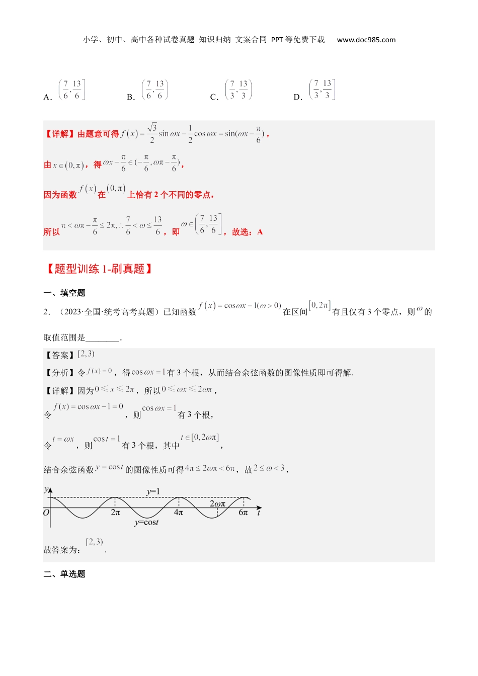 小学、初中、高中各种试卷真题知识归纳文案合同PPT等免费下载www.doc985.com【一轮复习讲义】2024年高考数学高频考点题型归纳与方法总结(新高考通用)素养拓展12ω的值和取值范围问题(精讲+精练)一、与对称性有关(1)y=Asin(ωx+φ)相邻两条对称轴之间的距离是T2;(2)y=Asin(ωx+φ)相邻两个对称中心的距离是T2;(3)y=Asin(ωx+φ)相邻两条对称轴与对称中心距离T4;二、与单调性有关三、与零点和极值点有关对于区间长度为定值的动区间,若区间上至少含有k个零点,需要确定含有k个零点的区间长度,一般和周期相关,若在在区间至多含有k个零点,需要确定包含k+1个零点的区间长度的最小值,极值点的处理方法也是类似的.【典例1】若存在实数,使得函数(>0)的图象的一个对称中心为(,0),则ω的取值范围为()二、题型精讲精练一、知识点梳理小学、初中、高中各种试卷真题知识归纳文案合同PPT等免费下载www.doc985.comA.B.C.D.【详解】由于函数的图象的一个对称中心为,所以,所以,由于,则,因为,所以可得:,故选:C【典例2】已知函数在区间上单调递减,则正实数的取值范围是()A.B.C.D.【详解】由题意知,,令,解得,又函数在区间上单调递减,所以,解得,当时,.故选:C.【典例3】已知函数在上恰有2个不同的零点,则的取值范围为()小学、初中、高中各种试卷真题知识归纳文案合同PPT等免费下载www.doc985.comA.B.C.D.【详解】由题意可得,由,得,因为函数在上恰有2个不同的零点,所以,即,故选:A【题型训练1-刷真题】一、填空题2.(2023·全国·统考高考真题)已知函数在区间有且仅有3个零点,则的取值范围是________.【答案】【分析】令,得有3个根,从而结合余弦函数的图像性质即可得解.【详解】因为,所以,令,则有3个根,令,则有3个根,其中,结合余弦函数的图像性质可得,故,故答案为:.二、单选题小学、初中、高中各种试卷真题知识归纳文案合同PPT等免费下载www.doc985.com1.(2022·全国·统考高考真题)设函数在区间恰有三个极值点、两个零点,则的取值范围是()A.B.C.D.【答案】C【分析】由的取值范围得到的取值范围,再结合正弦函数的性质得到不等式组,解得即可.【详解】解:依题意可得,因为,所以,要使函数在区间恰有三个极值点、两个零点,又,的图象如下所示:则,解得,即.故选:C.【题型训练2-刷模拟】1.与对称性有关一、单选题1.(2023春·陕西西安·高三校考阶段练习)将函数的图象向右平移个单位长度得到曲线,若关于点对称,则的最小值是()小学、初中、高中各种试卷真题知识归纳文案合同PPT等免费下载www.doc985.comA.3B.6C.9D.12【答案】B【分析】利用三角函数图象变换结论求出变换后的函数图象额解析式,再由余弦函数的对称性的性质求的最小值.【详解】函数的图象向右平移个单位长度得到的曲线的函数解析式为,由已知函数的图象关于点对称,所以,,所以,又,所以的最小值是,故选:B.2.(2023·浙江·统考二模)已知函数,若在区间是单调函数,且,则的值为().A.B.C.或D.或2【答案】B【分析】由在区间是有单调性,可得范围,从而得;由,可得函数关于对称,又,有对称中心为,讨论与是否在同一周期里面相邻的对称轴与对称中心即可.【详解】在区间是有单调性,,小学、初中、高中各种试卷真题知识归纳文案合同PPT等免费下载www.doc985.com,;,函数关于对称,离最近对称轴的距离为;又,有对称中心为;由题意可知:若与为不是同一周期里面相邻的对称轴与对称中心.则,可得,,不符合舍去,若与为同一周期里面相邻的对称轴与对称中心.那么:,可得,.综上可知故选:B3.(2023·安徽马鞍山·统考三模)记函数的最小正周期为,若,且,则()A.B.C.D.【答案】C【分析】由最小正周期可得,再由即可得,即可求得.【详解】函数的最小正周期,则,解得;小学、初中、高中各种试卷真题知识归纳文案合同PPT等免费下载www.doc985.com又,即是函数的一条对称轴,所以,解得.又,当时,.故选:C.4.(2023·重庆·统考模拟预测)已知函数,若对于任意实数x,都有,则的最小值为()A.2B.C.4D.8【...
