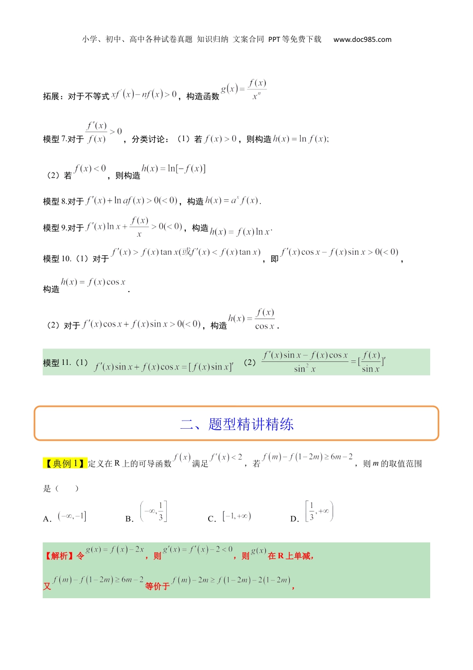小学、初中、高中各种试卷真题知识归纳文案合同PPT等免费下载www.doc985.com【一轮复习讲义】2024年高考数学高频考点题型归纳与方法总结(新高考通用)素养拓展07导数中利用构造函数解不等式(精讲+精练)一、构造函数解不等式解题思路利用函数的奇偶性与单调性求解抽象函数不等式,要设法将隐性划归为显性的不等式来求解,方法是:(1)把不等式转化为;(2)判断函数的单调性,再根据函数的单调性把不等式的函数符号“”脱掉,得到具体的不等式(组),但要注意函数奇偶性的区别.二、构造函数解不等式解题技巧求解此类题目的关键是构造新函数,研究新函数的单调性及其导函数的结构形式,下面是常见函数的变形模型1.对于,构造模型2.对于不等式,构造函数.模型3.对于不等式,构造函数拓展:对于不等式,构造函数模型4.对于不等式,构造函数模型5.对于不等式,构造函数拓展:对于不等式,构造函数模型6.对于不等式,构造函数一、知识点梳理小学、初中、高中各种试卷真题知识归纳文案合同PPT等免费下载www.doc985.com拓展:对于不等式,构造函数模型7.对于,分类讨论:(1)若,则构造(2)若,则构造模型8.对于,构造.模型9.对于,构造.模型10.(1)对于,即,构造.(2)对于,构造.模型11.(1)(2)【典例1】定义在R上的可导函数满足,若,则m的取值范围是()A.B.C.D.【解析】令,则,则在R上单减,又等价于,二、题型精讲精练小学、初中、高中各种试卷真题知识归纳文案合同PPT等免费下载www.doc985.com即,由单调性得,解得.故选:B.【典例2】已知定义在上的函数满足,,则关于的不等式的解集为()A.B.C.D.【详解】令,则,所以在单调递减,不等式可以转化为,即,所以.故选:D.【典例3】设函数是函数的导函数,,,且,则不等式的解集为()A.B.C.D.【解析】依题意,令函数,则,且,所以是上的增函数,,解得.故选:A【典例4】定义在上的函数的导函数为,若对任意实数,有,且为奇函数,则不等式的解集是()A.B.(−∞,ln2022)C.D.【解析】设,则,因为,所以,为定义在上的减函数,小学、初中、高中各种试卷真题知识归纳文案合同PPT等免费下载www.doc985.com因为为奇函数,所以,,,,即,,,故选:C.【典例5】已知是定义域为的奇函数的导函数,当时,都有,,则不等式的解集为()A.B.C.D.【详解】因为是奇函数,所以是偶函数.设,∴当时,,∴在区间上是增函数,∴在区间是减函数, .当时,不等式等价于,当时,不等式等价于,∴原不等式的解集为.故选:D.【题型训练】1.加减法模型一、单选题1.(2023秋·江西萍乡·高三统考期末)已知是定义在R上的奇函数,是其导函数.当x≥0时,小学、初中、高中各种试卷真题知识归纳文案合同PPT等免费下载www.doc985.com且,则的解集是()A.B.C.D.【答案】C【详解】设,可得因为当x≥0时,,所以在上递增,又因为是定义在R上的奇函数,所以的图像关于对称,如图,所以在R上递增,又因为,所以,则等价于,所以,即的解集是,故选:C.2.(2023·全国·高三专题练习)已知函数的导函数为,若对任意的,都有,且,则不等式的解集为()A.B.C.D.【答案】A小学、初中、高中各种试卷真题知识归纳文案合同PPT等免费下载www.doc985.com【详解】令,则,所以在上单调递增,,等价于,即,即,所以不等式的解集为.故选:A.3.(2023·漠河市高级中学)已知是定义在上的奇函数,是函数的导函数且在上,若,则实数的取值范围为()A.B.C.D.【答案】B【解析】设,则又上,,则,即函数在上单调递减,又是定义在上的奇函数,则函数为上的奇函数,故在上单调递减,又,,即可得:,解得:.故选:B.小学、初中、高中各种试卷真题知识归纳文案合同PPT等免费下载www.doc985.com4.(2023·全国高三专题练习)已知定义在上的函数满足,对恒有,则的解集为()A.B.C.D.【答案】B【解析】令,则,又因为对恒有所以恒成立,所以在R上单减.又,所以的解集为故选:B2.和模型一、单选题1.(2023·江西·瑞金市第三中学高三阶段练习(理))已知定义在R上的函数的导函数为,若对任意的实数x,不等式恒成立,且,则不...
