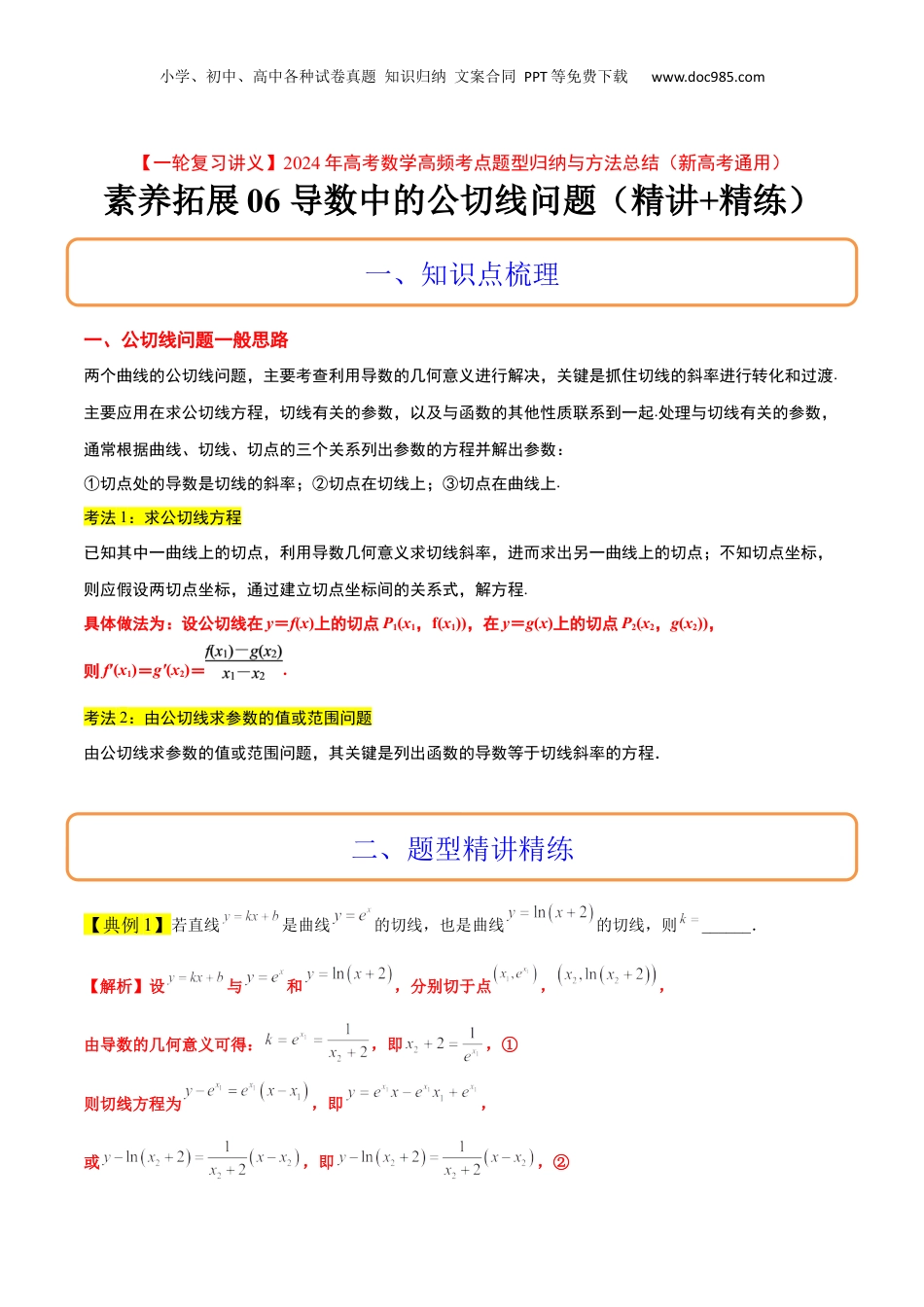 小学、初中、高中各种试卷真题知识归纳文案合同PPT等免费下载www.doc985.com【一轮复习讲义】2024年高考数学高频考点题型归纳与方法总结(新高考通用)素养拓展06导数中的公切线问题(精讲+精练)一、公切线问题一般思路两个曲线的公切线问题,主要考查利用导数的几何意义进行解决,关键是抓住切线的斜率进行转化和过渡.主要应用在求公切线方程,切线有关的参数,以及与函数的其他性质联系到一起.处理与切线有关的参数,通常根据曲线、切线、切点的三个关系列出参数的方程并解出参数:①切点处的导数是切线的斜率;②切点在切线上;③切点在曲线上.考法1:求公切线方程已知其中一曲线上的切点,利用导数几何意义求切线斜率,进而求出另一曲线上的切点;不知切点坐标,则应假设两切点坐标,通过建立切点坐标间的关系式,解方程.具体做法为:设公切线在y=f(x)上的切点P1(x1,f(x1)),在y=g(x)上的切点P2(x2,g(x2)),则f′(x1)=g′(x2)=.考法2:由公切线求参数的值或范围问题由公切线求参数的值或范围问题,其关键是列出函数的导数等于切线斜率的方程.【典例1】若直线是曲线的切线,也是曲线的切线,则______.【解析】设与和,分别切于点,,由导数的几何意义可得:,即,①则切线方程为,即,或,即,②二、题型精讲精练一、知识点梳理小学、初中、高中各种试卷真题知识归纳文案合同PPT等免费下载www.doc985.com将①代入②得,又直线是曲线的切线,也是曲线的切线,则,即,则或,即或,故答案为1或.【典例2】已知直线与函数的图像相切于点,与函数的图像相切于点,若,且,,则______.【解析】依题意,可得,整理得令,则在单调递增且,∴存在唯一实数,使,,,,,∴,故.【题型训练】1.求公切线方程一、单选题1.(2023·全国·高三专题练习)曲线与曲线的公切线方程为()A.B.小学、初中、高中各种试卷真题知识归纳文案合同PPT等免费下载www.doc985.comC.D.【答案】A【分析】画出图象,从而确定正确选项.【详解】画出以及四个选项中直线的图象如下图所示,由图可知A选项符合.故选:A2.(2023·全国·高三专题练习)对于三次函数,若曲线在点处的切线与曲线在点处点的切线重合,则()A.B.C.D.【答案】B【分析】由得,然后求得,由求得,设,由得及,再由得,解得后可得.【详解】设,,设,则,即……①又,即……②小学、初中、高中各种试卷真题知识归纳文案合同PPT等免费下载www.doc985.com由①②可得,.故选:B.3.(2023·全国·高三专题练习)已知函数,.若经过点存在一条直线l与曲线和都相切,则()A.-1B.1C.2D.3【答案】B【分析】先求得在处的切线方程,然后与联立,由求解【详解】解析: ,∴,∴,∴,∴曲线在处的切线方程为,由得,由,解得.故选:B4.(2023·全国·高三专题练习)已知函数,则和的公切线的条数为A.三条B.二条C.一条D.0条【答案】A【分析】分别设出两条曲线的切点坐标,根据斜率相等得到方程,构造函数,研究方程的根的个数,即可得到切线的条数.【详解】设公切线与和分别相切于点,,解得,代入化简得,构造函数,原函数在,极大值小学、初中、高中各种试卷真题知识归纳文案合同PPT等免费下载www.doc985.com故函数和x轴有交3个点,方程有三解,故切线有3条.故选A.【点睛】这个题目考查了利用导数求函数在某一点处的切线方程;步骤一般为:一,对函数求导,代入已知点得到在这一点处的斜率;二,求出这个点的横纵坐标;三,利用点斜式写出直线方程.考查了函数零点个数问题,即转化为函数图像和x轴的交点问题.5.(2023·全国·高三专题练习)已知函数,,若与在公共点处的切线相同,则()A.B.C.D.【答案】B【分析】设曲线与的公共点为,根据题意可得出关于、的方程组,进而可求得实数的值.【详解】设函数,的公共点设为,则,即,解得,故选:B.【点睛】本题考查利用两函数的公切线求参数,要结合公共点以及导数值相等列方程组求解,考查计算能力,属于中等题.6.(2023·全国·高三专题练习)函数在点处的切线与函数的图象也相切,则满足条件的切点的个数有A.0个B.1个C.2个D.3个【答案】C小学、初中、高...