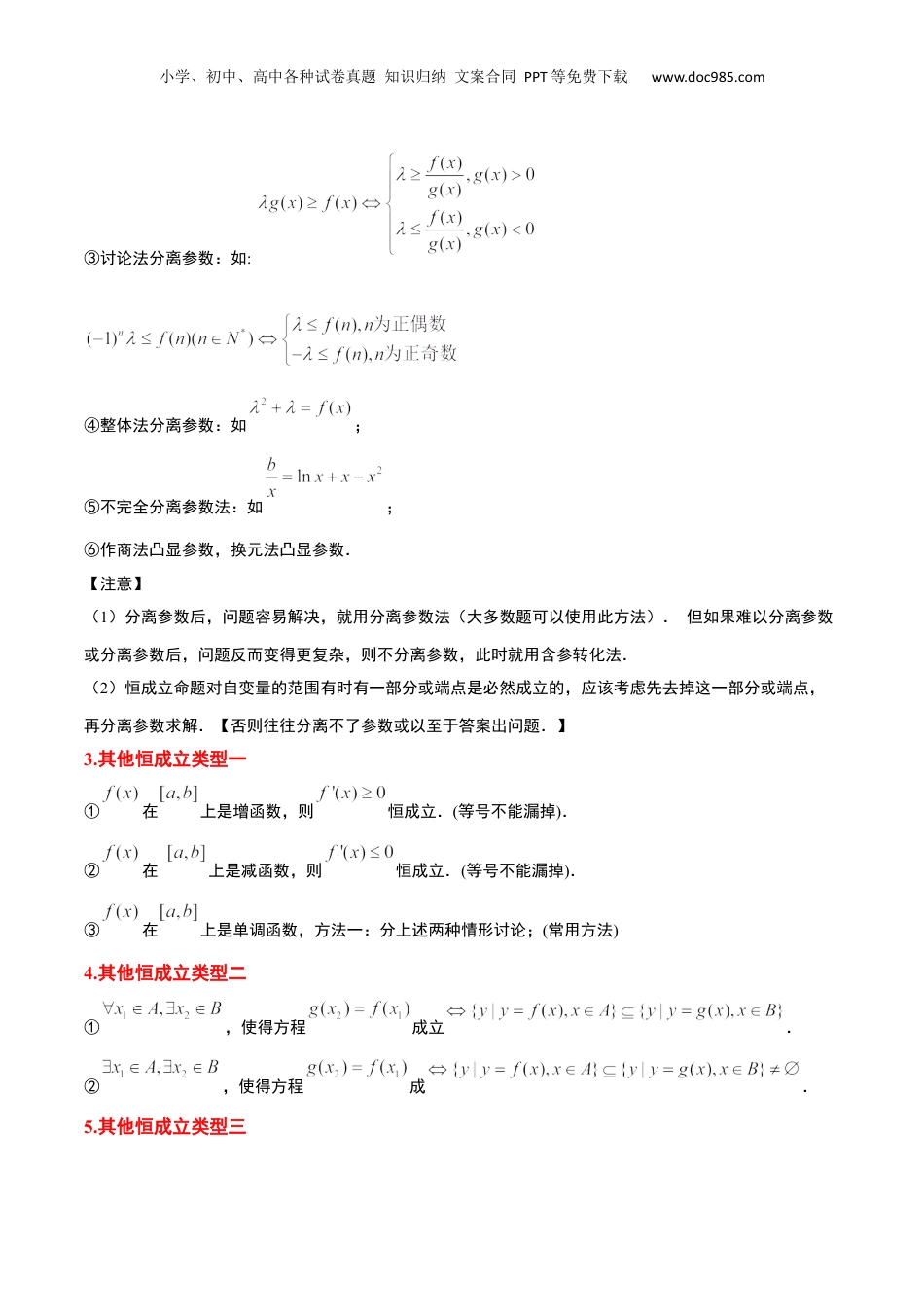 小学、初中、高中各种试卷真题知识归纳文案合同PPT等免费下载www.doc985.com【一轮复习讲义】2024年高考数学高频考点题型归纳与方法总结(新高考通用)素养拓展02不等式中的恒成立问题(精讲+精练)1.结合图象务必理解掌握下面几个重要结论!设函数的值域为或,或或中之一种,则①若恒成立(即无解),则;②若恒成立(即无解),则;③若有解(即存在使得成立),则;④若有解(即存在使得成立),则;⑤若有解(即无解),则;⑥若无解(即有解),则.【说明】(1)一般来说,优先考虑分离参数法,其次考虑含参转化法.(2)取值范围都与最值或值域(上限、下限)有关,另外要注意①②③④中前后等号的取舍!(即端点值的取舍)2.分离参数的方法①常规法分离参数:如;②倒数法分离参数:如;【当的值有可能取到,而的值一定不为0时,可用倒数法分离参数.】一、知识点梳理小学、初中、高中各种试卷真题知识归纳文案合同PPT等免费下载www.doc985.com③讨论法分离参数:如:④整体法分离参数:如;⑤不完全分离参数法:如;⑥作商法凸显参数,换元法凸显参数.【注意】(1)分离参数后,问题容易解决,就用分离参数法(大多数题可以使用此方法).但如果难以分离参数或分离参数后,问题反而变得更复杂,则不分离参数,此时就用含参转化法.(2)恒成立命题对自变量的范围有时有一部分或端点是必然成立的,应该考虑先去掉这一部分或端点,再分离参数求解.【否则往往分离不了参数或以至于答案出问题.】3.其他恒成立类型一①在上是增函数,则恒成立.(等号不能漏掉).②在上是减函数,则恒成立.(等号不能漏掉).③在上是单调函数,方法一:分上述两种情形讨论;(常用方法)4.其他恒成立类型二①,使得方程成立.②,使得方程成.5.其他恒成立类型三小学、初中、高中各种试卷真题知识归纳文案合同PPT等免费下载www.doc985.com①,;②,;③,;④,.【方法】处理时,把当常数;处理时,把当常数.思考:对的四种取值情形;或;或等又如何处理呢?【同理!】1.基本不等式恒成立问题一、单选题1.(2023·全国·高三专题练习)当时,不等式恒成立,则实数的取值范围是()A.B.C.D.【答案】D【分析】利用基本不等式可求得的最小值,由此可得的范围.【详解】当时,(当且仅当时取等号),,即的取值范围为.故选:D.二、题型精讲精练小学、初中、高中各种试卷真题知识归纳文案合同PPT等免费下载www.doc985.com2.(2023·上海·高三专题练习)已知P是曲线上的一动点,曲线C在P点处的切线的倾斜角为,若,则实数a的取值范围是()A.B.C.D.【答案】D【分析】对函数求导,利用导数的几何意义以及给定倾斜角的范围,转化为恒成立问题求解a的范围即可.【详解】因为,所以,因为曲线在M处的切线的倾斜角,所以对于任意的恒成立,即对任意恒成立,即,又,当且仅当,即时,等号成立,故,所以a的取值范围是.故选:D.3.(2023·全国·高三专题练习)已知且,若恒成立,则实数m的取值范围是()A.B.}C.D.【答案】D【分析】根据基本不等式可取的最小值,从而可求实数m的取值范围.【详解】 ,且,小学、初中、高中各种试卷真题知识归纳文案合同PPT等免费下载www.doc985.com∴,当且仅当时取等号,∴,由恒成立可得,解得:,故选:D.4.(2023·四川南充·四川省南充高级中学校考模拟预测)已知实数满足,且,若不等式恒成立,则实数的最大值为()A.9B.12C.16D.25【答案】D【分析】由得到,从而利用基本不等式“1”的妙用求出的最小值,从而得到.【详解】因为,所以,,当且仅当,即时,等号成立.因不等式恒成立,只需,因此,故实数的最大值为25.故选:D5.(2023·全国·高三专题练习)当不等式恒成立,则实数的取值范围是()小学、初中、高中各种试卷真题知识归纳文案合同PPT等免费下载www.doc985.comA.B.C.D.【答案】B【分析】利用基本不等式求出,将恒成立问题转化为,然后解不等式即可.【详解】恒成立,即,又,上述两个不等式中,等号均在时取到,,,解得且,又,实数的取值范围是.故选:B.6.(2023秋·河南郑州·高三校联考期末)已知正数满足,若恒成立,则...