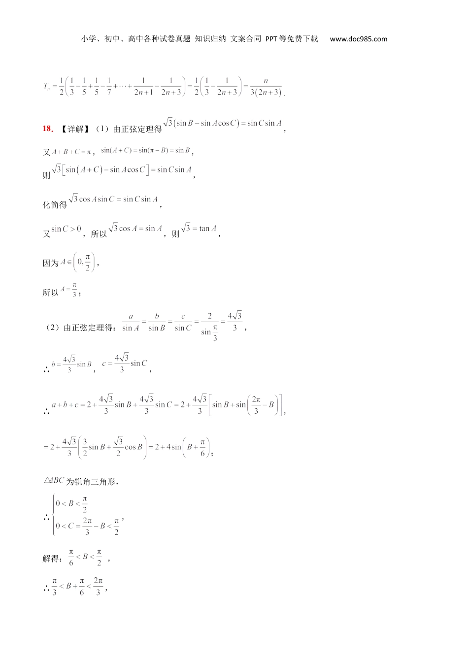 小学、初中、高中各种试卷真题知识归纳文案合同PPT等免费下载www.doc985.com2024年高考数学摸底考试卷高三数学参考答案1.B2.C3.A4.C5.A6.D7.D8.C9.ACD10.ABD11.BC12.BD13.14.15.(中任意一个皆可以)16.17.【详解】(1)由,可知两式相减得,即,∵,∴,∵当时,,∴(舍)或,则是首项为,公差的等差数列,∴的通项公式;(2)∵,∴,∴数列的前项和小学、初中、高中各种试卷真题知识归纳文案合同PPT等免费下载www.doc985.com.18.【详解】(1)由正弦定理得,又,,则,化简得,又,所以,则,因为,所以;(2)由正弦定理得:,∴,,∴,;为锐角三角形,∴,解得:,∴,小学、初中、高中各种试卷真题知识归纳文案合同PPT等免费下载www.doc985.com∴,∴,∴,即△ABC的取值范围为.19.【详解】(1)因为底面,平面,所以.因为,,所以.所以,所以.又因为,平面PBC,平面PBC,所以平面PBC.又平面EAC,所以平面平面PBC.(2)解法一:以点C为原点,CB,CA,CP所在直线分别为x轴,y轴,z轴,建立如图所示的空间直角坐标系,则,,,.设点E的坐标为,因为,所以,小学、初中、高中各种试卷真题知识归纳文案合同PPT等免费下载www.doc985.com即,,,所以.所以,.设平面ACE的一个法向量为,则.所以,取,则,.所以平面ACE的一个法向量为.又因为平面PAC,所以平面PAC的一个法向量为.设平面PAC与平面ACE的夹角为,则.所以,平面PAC与平面ACE夹角的余弦值为.解法二:取AB的中点G,连接CG,以点C为原点,CG,CD,CP所在直线分别为x轴,y轴,z轴,建立如图所示的空间直角坐标系,则,,,.小学、初中、高中各种试卷真题知识归纳文案合同PPT等免费下载www.doc985.com设点E的坐标为,因为,所以,即,,,所以.所以,.设平面ACE的一个法向量为,则.所以,取,则,.所以,平面ACE的一个法向量为.又因为平面PAC,所以平面PAC的一个法向量为.设平面PAC与平面ACE的夹角为,则.所以,平面PAC与平面ACE夹角的余弦值为20.【详解】(1)记“小明至少正确完成其中3道题”为事件A,则小学、初中、高中各种试卷真题知识归纳文案合同PPT等免费下载www.doc985.com.(2)X的可能取值为2,3,4,,,X的分布列为;X234P数学期望.(3)由(1)知,小明进入决赛的概率为;记“小宇至少正确完成其中3道题”为事件B,则;因为,故小宇进决赛的可能性更大,所以应选择小宇去参加比赛.21.【详解】(1)定义域为,,由题意知,解得,;(2),小学、初中、高中各种试卷真题知识归纳文案合同PPT等免费下载www.doc985.com则,令,其中,则,所以函数在上单调递增,因为,,所以存在唯一,使得,即,可得,当时,,此时函数单调递增,当时,,此时函数单调递减.所以当时,,因为,,所以,当且仅当,即时,取等号,又因,所以,即,因为,,所以当时,,因为当时,恒成立,小学、初中、高中各种试卷真题知识归纳文案合同PPT等免费下载www.doc985.com所有.【点睛】关键点点睛:本题第二问的关键点在于把恒成立问题通过分离参数转化为新函数的最值问题,转化后利用导数判断出其定义域上的单调性求出值域或最值问题就解决了.22.【详解】(1)双曲线:的渐近线方程为,不妨设,因为三角形的面积为,所以,所以,又,所以.(2)双曲线的方程为:,所以右焦点的坐标为,依题意,设直线与轴交于点,直线的方程为,设,,则,联立,得,且,化简得且,所以,,因为直线的斜率存在,所以直线的斜率也存在,因为,,三点共线,所以,即,即,小学、初中、高中各种试卷真题知识归纳文案合同PPT等免费下载www.doc985.com所以,因为,所以,所以,所以,化简得,所以经过轴上的定点.