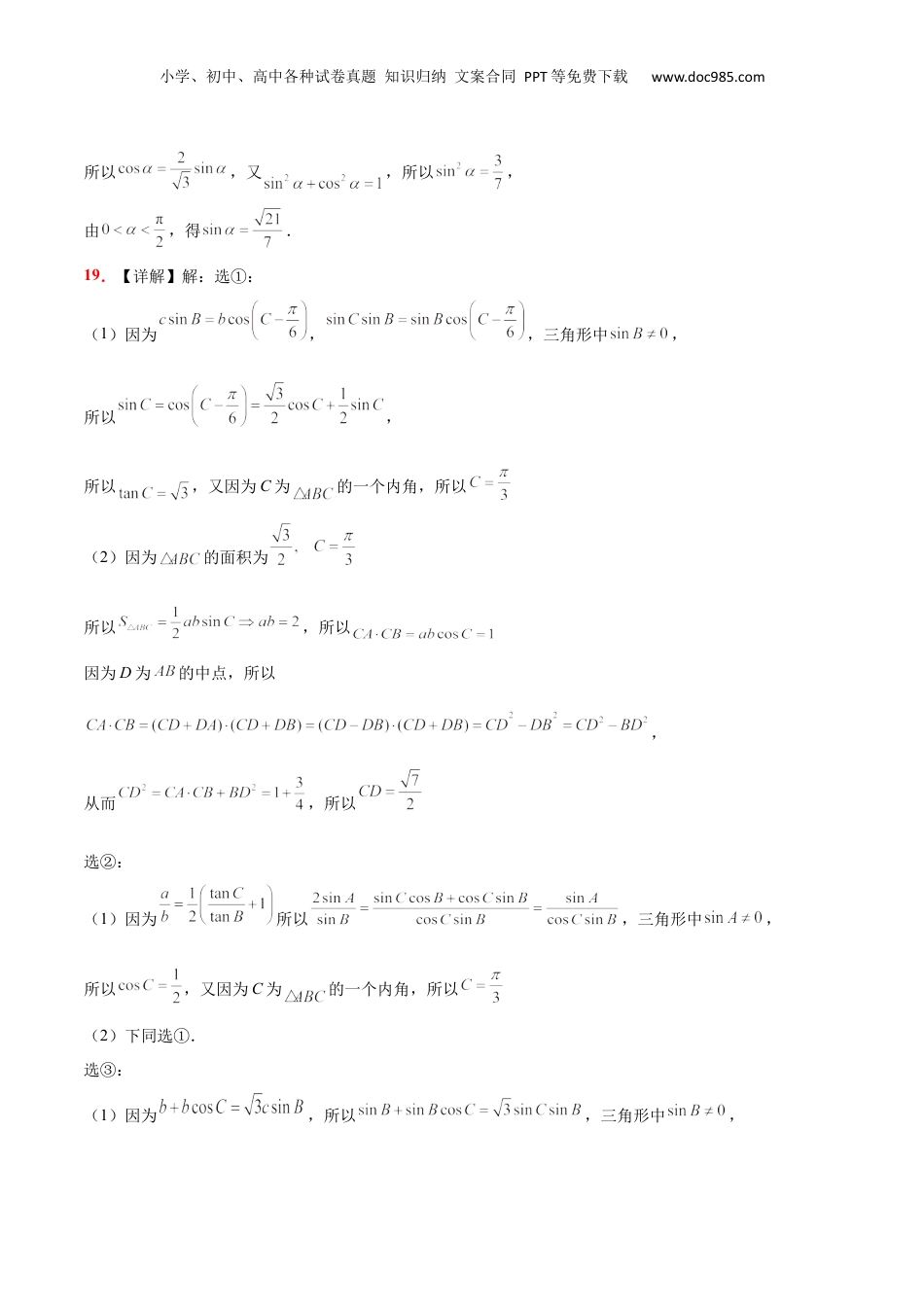 小学、初中、高中各种试卷真题知识归纳文案合同PPT等免费下载www.doc985.com第六章平面向量、复数章末检测参考答案1.C2.D3.A4.B5.C6.C7.B8.B9.AC10.ACD11.ABC12.CD13.14.15.16.117.【详解】试题分析:(1)由结合正弦定理可得,可得.(2)由,和(1)中所得可求,又由余弦定理,再用正弦定理求得外接圆的半径.试题解析:(1)∵,∴,∴,∴,∴,∴.小学、初中、高中各种试卷真题知识归纳文案合同PPT等免费下载www.doc985.com(2)∵,∴,∴,又为锐角,∴,∴,∴,∴外接圆的半径.18.【详解】(1)因为,所以在中,,,,所以;在中,,,,由余弦定理,得,所以;(2)由,得,在中,,,,所以,在中,,,,,由正弦定理得,小学、初中、高中各种试卷真题知识归纳文案合同PPT等免费下载www.doc985.com所以,又,所以,由,得.19.【详解】解:选①:(1)因为,,三角形中,所以,所以,又因为C为的一个内角,所以(2)因为的面积为所以,所以因为D为的中点,所以,从而,所以选②:(1)因为所以,三角形中,所以,又因为C为的一个内角,所以(2)下同选①.选③:(1)因为,所以,三角形中,小学、初中、高中各种试卷真题知识归纳文案合同PPT等免费下载www.doc985.com所以所以,又因为C为的一个内角,所以(2)下同选①.20.【详解】(1)依题意,否则,则,矛盾,由得,即得故,整理得,从而又因为可得,从而.(2)由,由(1)可得故为锐角,,故,从而当且仅当时取等号,的最小值为.21.【详解】(1)因为,所以,因为,所以,所以由正弦定理得,因为,所以,小学、初中、高中各种试卷真题知识归纳文案合同PPT等免费下载www.doc985.com所以,所以,所以,所以,所以,因为,所以,(2)因为,的角平分线交于点,所以,因为,所以,所以,所以,因为为的中点,且,所以,所以,所以,所以,所以,所以,解得或(舍去),所以所以由余弦定理得,所以22.【详解】解:(1)在中,,,,解得,小学、初中、高中各种试卷真题知识归纳文案合同PPT等免费下载www.doc985.com在中,由余弦定理得:,;(2)由,则,,在中,,,由正弦定理得,,,记该计划所费用为,则,,令,则,由,解得,当时,,单调递减,当,时,,单调递增,时,该计划所需费用最小.小学、初中、高中各种试卷真题知识归纳文案合同PPT等免费下载www.doc985.com