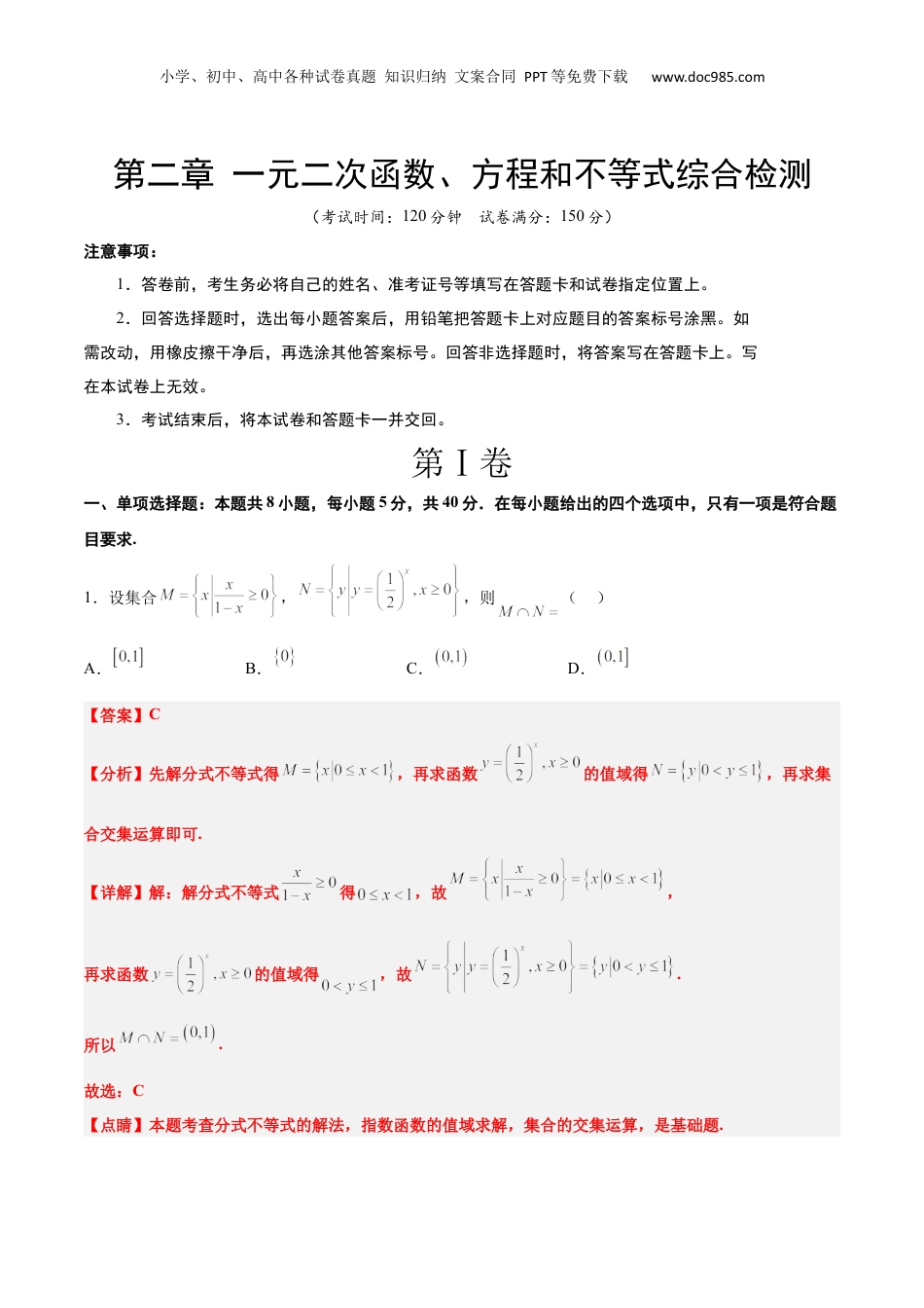 小学、初中、高中各种试卷真题知识归纳文案合同PPT等免费下载www.doc985.com第二章一元二次函数、方程和不等式综合检测(考试时间:120分钟试卷满分:150分)注意事项:1.答卷前,考生务必将自己的姓名、准考证号等填写在答题卡和试卷指定位置上。2.回答选择题时,选出每小题答案后,用铅笔把答题卡上对应题目的答案标号涂黑。如需改动,用橡皮擦干净后,再选涂其他答案标号。回答非选择题时,将答案写在答题卡上。写在本试卷上无效。3.考试结束后,将本试卷和答题卡一并交回。第Ⅰ卷一、单项选择题:本题共8小题,每小题5分,共40分.在每小题给出的四个选项中,只有一项是符合题目要求.1.设集合,,则()A.B.C.D.【答案】C【分析】先解分式不等式得,再求函数的值域得,再求集合交集运算即可.【详解】解:解分式不等式得,故,再求函数的值域得,故.所以.故选:C【点睛】本题考查分式不等式的解法,指数函数的值域求解,集合的交集运算,是基础题.小学、初中、高中各种试卷真题知识归纳文案合同PPT等免费下载www.doc985.com2.设,则“”是“”的()A.充分不必要条件B.必要不充分条件C.充要条件D.既不充分也不必要条件【答案】B【分析】解不等式、,利用集合的包含关系判断可得出结论.【详解】由可得,由可得,解得,因此“”是“”的必要不充分条件.故选:B.3.若关于的不等式有解,则实数的取值范围是()A.B.C.D.【答案】C【分析】直接利用判别式即可研究不等式的解的情况.【详解】若关于的不等式有解,则,解得.故选:C.4.已知,若恒成立,则的最大值为()A.4B.5C.24D.25【答案】C【分析】由,利用基本不等式整理得,根据恒成立问题可得,运算求解即可得答案.【详解】 ,所以,小学、初中、高中各种试卷真题知识归纳文案合同PPT等免费下载www.doc985.com∴,当且仅当,即时等号成立,即,由题意可得:,又,解得,故的最大值为24.故选:C.5.设圆柱的体积为,当其表面积最小时,圆柱的母线长为()A.B.C.D.【答案】D【分析】根据圆柱体积公式,把圆柱底面半径为用圆柱体积和母线长表示出来,由公式计算圆柱表面积,利用基本不等式求表面积的最小值,由等号成立的条件求此时圆柱的母线长.【详解】设圆柱底面半径为,母线长为,有,则,圆柱表面积,当且仅当,即时等号成立.所以圆柱表面积最小时,圆柱的母线长为.故选:D小学、初中、高中各种试卷真题知识归纳文案合同PPT等免费下载www.doc985.com6.已知,,,则、、的大小关系为()A.B.C.D.【答案】C【分析】利用作差法结合基本不等式可得出、的大小关系,利用中间值结合指数函数、对数函数的单调性可得出、的大小关系,综合可得出、、的大小关系.【详解】因为,所以,,则,因为,所以,,则,所以因为,即,因此,.故选:C.7.在中,角A,,的对边分别为,,,且,若的面积,则的最小值为()A.B.C.D.【答案】A【分析】利用正弦定理边化角,结合两角和的正弦公式,化简计算,可求得角C,根据面积公式及题干条件,计算可得,利用余弦定理及基本不等式,即可得答案.【详解】因为,由正弦定理边化角可得,又,所以,小学、初中、高中各种试卷真题知识归纳文案合同PPT等免费下载www.doc985.com所以,因为,,所以,又,所以.又的面积所以,由余弦定理得,所以,当且仅当时取等号,所以,则的最小值为.故选:A8.已知抛物线,过坐标原点O作两条相互垂直的直线分别与抛物线C相交于两点(M,N均与点O不重合).若直线MN恒过点,则的最小值为()A.B.C.D.【答案】A【分析】设,设直线MN方程为,联立抛物线C的方程得韦达定理,再根据结合平面向量和韦达定理得到,最后利用基本不等式求解.【详解】设,设直线MN方程为,小学、初中、高中各种试卷真题知识归纳文案合同PPT等免费下载www.doc985.com联立抛物线C的方程得,所以.又,所以,所以,所以,所以,所以直线MN的方程为,所以直线MN过定点,故,即,所以.由抛物线的方程可得,所以,当且仅当时取等号.故选:A二、多项选择题:本题共4小题,每小题5分,共20分.在每小题给出的选项中,有多项符合题目要求.全部选对的得5分,部分选对的...