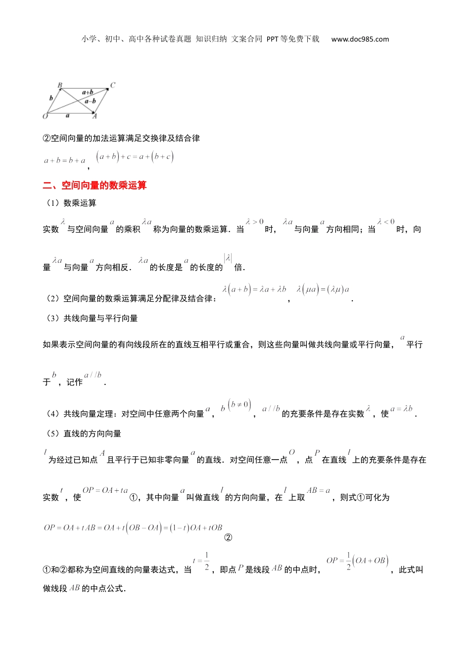小学、初中、高中各种试卷真题知识归纳文案合同PPT等免费下载www.doc985.com【一轮复习讲义】2024年高考数学高频考点题型归纳与方法总结(新高考通用)第35讲空间向量的运算及其坐标表示(精讲)题型目录一览①空间向量的线性运算②空间共线、共面向量定理的应用③空间向量的数量积运算一、空间向量及其加减运算(1)空间向量在空间,我们把具有大小和方向的量叫做空间向量,向量的大小叫做向量的长度或模.空间向量也可用有向线段表示,有向线段的长度表示向量的模,若向量的起点是,终点是,则向量也可以记作,其模记为或.(2)零向量与单位向量规定长度为0的向量叫做零向量,记作.当有向线段的起点与终点重合时,.模为1的向量称为单位向量.(3)相等向量与相反向量方向相同且模相等的向量称为相等向量.在空间,同向且等长的有向线段表示同一向量或相等向量.空间任意两个向量都可以平移到同一个平面,成为同一平面内的两个向量.与向量长度相等而方向相反的向量,称为的相反向量,记为.(4)空间向量的加法和减法运算①,.如图所示.一、知识点梳理小学、初中、高中各种试卷真题知识归纳文案合同PPT等免费下载www.doc985.com②空间向量的加法运算满足交换律及结合律,二、空间向量的数乘运算(1)数乘运算实数与空间向量的乘积称为向量的数乘运算.当时,与向量方向相同;当时,向量与向量方向相反.的长度是的长度的倍.(2)空间向量的数乘运算满足分配律及结合律:,.(3)共线向量与平行向量如果表示空间向量的有向线段所在的直线互相平行或重合,则这些向量叫做共线向量或平行向量,平行于,记作.(4)共线向量定理:对空间中任意两个向量,,的充要条件是存在实数,使.(5)直线的方向向量为经过已知点且平行于已知非零向量的直线.对空间任意一点,点在直线上的充要条件是存在实数,使①,其中向量叫做直线的方向向量,在上取,则式①可化为②①和②都称为空间直线的向量表达式,当,即点是线段的中点时,,此式叫做线段的中点公式.小学、初中、高中各种试卷真题知识归纳文案合同PPT等免费下载www.doc985.com(6)共面向量如图8-154所示,已知平面与向量,作,如果直线平行于平面或在平面内,则说明向量平行于平面.平行于同一平面的向量,叫做共面向量.(7)共面向量定理如果两个向量,不共线,那么向量与向量,共面的充要条件是存在唯一的有序实数对,使.推论:①空间一点位于平面内的充要条件是存在有序实数对,使;或对空间任意一点,有,该式称为空间平面的向量表达式.②已知空间任意一点和不共线的三点,,,满足向量关系式(其中)的点与点,,共面;反之也成立.三、空间向量的数量积运算(1)两向量夹角已知两个非零向量,,在空间任取一点,作,,则叫做向量,的夹角,记作,通常规定,如果,那么向量,互相垂直,记作.(2)数量积定义小学、初中、高中各种试卷真题知识归纳文案合同PPT等免费下载www.doc985.com已知两个非零向量,,则叫做,的数量积,记作,即.零向量与任何向量的数量积为0,特别地,.(3)空间向量的数量积满足的运算律:,(交换律);(分配律).知识点四:空间向量的坐标运算及应用(1)设,,则;;;;;.(2)设,,则.这就是说,一个向量在直角坐标系中的坐标等于表示该向量的有向线段的终点的坐标减起点的坐标.(3)两个向量的夹角及两点间的距离公式.①已知,,则;;;小学、初中、高中各种试卷真题知识归纳文案合同PPT等免费下载www.doc985.com;②已知,,则,或者.其中表示与两点间的距离,这就是空间两点的距离公式.(4)向量在向量上的投影为.题型一空间向量的线性运算策略方法用基向量表示指定向量的方法(1)合已知向量和所求向量察形.结观图(2)已知向量和所求向量化到三角形或平行四形中.将转边(3)利用三角形法或平行四形法把所求向量用已知基向量表示出.则边则来【典例1】在空间四边形ABCD中,G为的重心,E,F,H分别为边CD,AD和BC的中点,化简下列各表达式.(1);(2).【答案】(1)(2)【分析】(1)根据空间向量的运算法则运算即可;(2)根据空间向量的运算法则运算即可求解;【详解】(1)根...