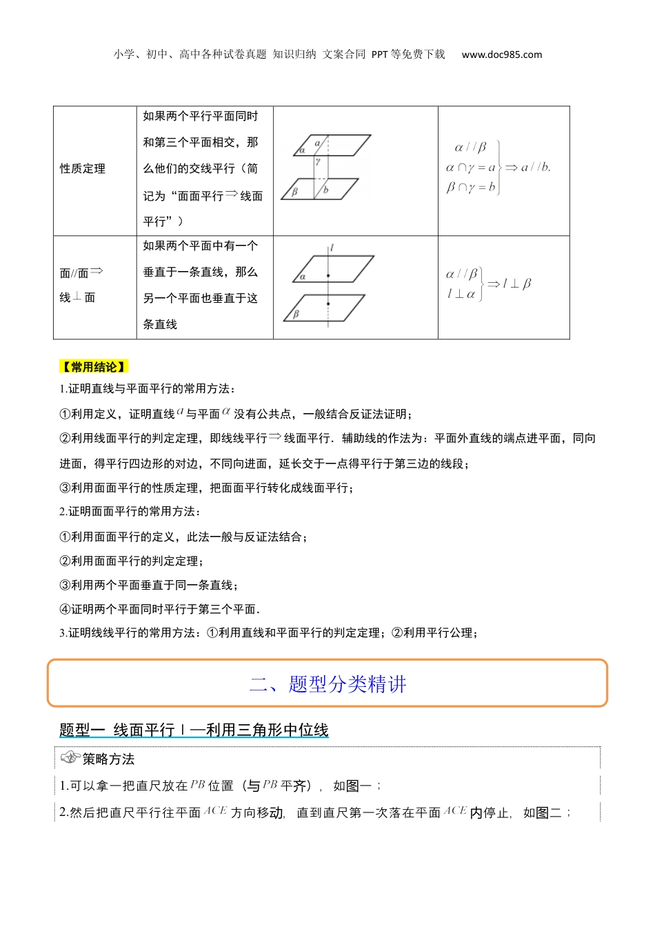 小学、初中、高中各种试卷真题知识归纳文案合同PPT等免费下载www.doc985.com【一轮复习讲义】2024年高考数学高频考点题型归纳与方法总结(新高考通用)第33讲空间直线、平面的平行(精讲)题型目录一览①线面平行Ⅰ—利用三角形中位线②线面平行Ⅱ—利用平行四边形③线面平行Ⅲ—利用线面平行的性质定理④线面平行Ⅳ—利用面面平行⑤面面平行的判定定理一、直线和平面平行1.定义直线与平面没有公共点,则称此直线与平面平行,记作∥2.判定方法(文字语言、图形语言、符号语言)文字语言图形语言符号语言线∥线线∥面如果平面外的一条直线和这个平面内的一条直线平行,那么这条直线和这个平面平行(简记为“线线平行线面平行面∥面线∥面如果两个平面平行,那么在一个平面内的所有直线都平行于另一个平面3.性质定理(文字语言、图形语言、符号语言)文字语言图形语言符号语言一、知识点梳理小学、初中、高中各种试卷真题知识归纳文案合同PPT等免费下载www.doc985.com线∥面线∥线如果一条直线和一个平面平行,经过这条直线的平面和这个平面相交,那么这条直线就和交线平行二、两个平面平行1.定义没有公共点的两个平面叫作平行平面,用符号表示为:对于平面和,若,则∥2.判定方法(文字语言、图形语言、符号语言)文字语言图形语言符号语言判定定理线∥面面∥面如果一个平面内有两条相交的直线都平行于另一个平面,那么这两个平面平行(简记为“线面平行面面平行线面面∥面如果两个平面同垂直于一条直线,那么这两个平面平行∥3.性质定理(文字语言、图形语言、符号语言)文字语言图形语言符号语言面//面线//面如果两个平面平行,那么在一个平面中的所有直线都平行于另外一个平面小学、初中、高中各种试卷真题知识归纳文案合同PPT等免费下载www.doc985.com性质定理如果两个平行平面同时和第三个平面相交,那么他们的交线平行(简记为“面面平行线面平行”)面//面线面如果两个平面中有一个垂直于一条直线,那么另一个平面也垂直于这条直线【常用结论】1.证明直线与平面平行的常用方法:①利用定义,证明直线与平面没有公共点,一般结合反证法证明;②利用线面平行的判定定理,即线线平行线面平行.辅助线的作法为:平面外直线的端点进平面,同向进面,得平行四边形的对边,不同向进面,延长交于一点得平行于第三边的线段;③利用面面平行的性质定理,把面面平行转化成线面平行;2.证明面面平行的常用方法:①利用面面平行的定义,此法一般与反证法结合;②利用面面平行的判定定理;③利用两个平面垂直于同一条直线;④证明两个平面同时平行于第三个平面.3.证明线线平行的常用方法:①利用直线和平面平行的判定定理;②利用平行公理;题型一线面平行Ⅰ—利用三角形中位线策略方法1.可以拿一把直尺放在位置(与平),如一;齐图2.然后把直尺平行往平面方向移,直到直尺第一次落在平面动停止,如二;内图二、题型分类精讲小学、初中、高中各种试卷真题知识归纳文案合同PPT等免费下载www.doc985.com3.此好点时刚经过(里熟后可以直接凭感直接找到点这练数),此直尺所在的位置就时是我要找的平行,直尺们线与相交于点,接连,如三;图4.此时度有有短,接长长连延好交于一点并长刚,好成刚构型模型(为中点,则也为中点,若等分点,为则也为等分点),对应,如图四.1234012340BCADPPDACBEEF图一图二图三图四【典例1】如图,垂直于梯形所在平面,,为的中点,,,四边形为矩形.求证:平面;【答案】证明见解析【分析】可先由中位线证明两线平行,再证明线面平行.【详解】令交于,连接,PDACBEFFBCADPE小学、初中、高中各种试卷真题知识归纳文案合同PPT等免费下载www.doc985.com四边形为矩形,为中点,又为的中点,,又平面,平面.平面【题型训练】一、解答题1.(2023·全国·高三专题练习)在如图所示的三棱锥中,已知为的中点,为的中点,为的中点.证明:平面.【答案】证明见解析【分析】利用线面平行判定定理即可证得平面.【详解】因为是的中位线,所以.因为平面平面,所以平面.2.(2023·全国·高三专题练习)如图,在四棱锥中,底面为矩形,为中点,证明:平面小学、初中、高...
