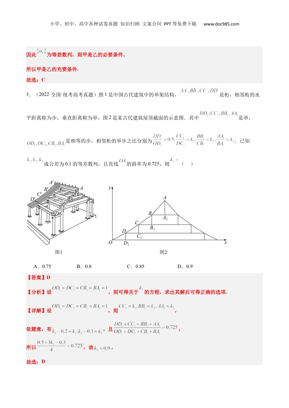 小学、初中、高中各种试卷真题知识归纳文案合同PPT等免费下载www.doc985.com【一轮复习讲义】2024年高考数学高频考点题型归纳与方法总结(新高考通用)第28练等差数列(精练)一、单选题1.(2023·全国·统考高考真题)记为等差数列的前项和.若,则()A.25B.22C.20D.15【答案】C【分析】方法一:根据题意直接求出等差数列的公差和首项,再根据前项和公式即可解出;方法二:根据等差数列的性质求出等差数列的公差,再根据前项和公式的性质即可解出.【详解】方法一:设等差数列的公差为,首项为,依题意可得,,即,又,解得:,所以.故选:C.方法二:,,所以,,从而,于是,所以.故选:C.2.(2023·全国·统考高考真题)记为数列的前项和,设甲:为等差数列;乙:为等差数列,则()刷真题明导向小学、初中、高中各种试卷真题知识归纳文案合同PPT等免费下载www.doc985.comA.甲是乙的充分条件但不是必要条件B.甲是乙的必要条件但不是充分条件C.甲是乙的充要条件D.甲既不是乙的充分条件也不是乙的必要条件【答案】C【分析】利用充分条件、必要条件的定义及等差数列的定义,再结合数列前n项和与第n项的关系推理判断作答.,【详解】方法1,甲:为等差数列,设其首项为,公差为,则,因此为等差数列,则甲是乙的充分条件;反之,乙:为等差数列,即为常数,设为,即,则,有,两式相减得:,即,对也成立,因此为等差数列,则甲是乙的必要条件,所以甲是乙的充要条件,C正确.方法2,甲:为等差数列,设数列的首项,公差为,即,则,因此为等差数列,即甲是乙的充分条件;反之,乙:为等差数列,即,即,,当时,上两式相减得:,当时,上式成立,于是,又为常数,小学、初中、高中各种试卷真题知识归纳文案合同PPT等免费下载www.doc985.com因此为等差数列,则甲是乙的必要条件,所以甲是乙的充要条件.故选:C3.(2022·全国·统考高考真题)图1是中国古代建筑中的举架结构,是桁,相邻桁的水平距离称为步,垂直距离称为举,图2是某古代建筑屋顶截面的示意图.其中是举,是相等的步,相邻桁的举步之比分别为.已知成公差为0.1的等差数列,且直线的斜率为0.725,则()A.0.75B.0.8C.0.85D.0.9【答案】D【分析】设,则可得关于的方程,求出其解后可得正确的选项.【详解】设,则,依题意,有,且,所以,故,故选:D小学、初中、高中各种试卷真题知识归纳文案合同PPT等免费下载www.doc985.com4.(2021·北京·统考高考真题)《中国共产党党旗党徽制作和使用的若干规定》指出,中国共产党党旗为旗面缀有金黄色党徽图案的红旗,通用规格有五种.这五种规格党旗的长(单位:cm)成等差数列,对应的宽为(单位:cm),且长与宽之比都相等,已知,,,则A.64B.96C.128D.160【答案】C【分析】设等差数列公差为,求得,得到,结合党旗长与宽之比都相等和,列出方程,即可求解.【详解】由题意,五种规格党旗的长(单位:cm)成等差数列,设公差为,因为,,可得,可得,又由长与宽之比都相等,且,可得,所以.故选:C.5.(2023·全国·统考高考真题)已知等差数列的公差为,集合,若,则()A.-1B.C.0D.【答案】B【分析】根据给定的等差数列,写出通项公式,再结合余弦型函数的周期及集合只有两个元素分析、推理作答.【详解】依题意,等差数列中,,显然函数的周期为3,而,即最多3个不同取值,又小学、初中、高中各种试卷真题知识归纳文案合同PPT等免费下载www.doc985.com,则在中,或,于是有,即有,解得,所以,.故选:B6.(2021·北京·统考高考真题)已知是各项均为整数的递增数列,且,若,则的最大值为()A.9B.10C.11D.12【答案】C【分析】使数列首项、递增幅度均最小,结合等差数列的通项及求和公式求得可能的最大值,然后构造数列满足条件,即得到的最大值.【详解】若要使n尽可能的大,则,递增幅度要尽可能小,不妨设数列是首项为3,公差为1的等差数列,其前n项和为,则,,所以.对于,,取数列各项为(,,则,所以n的最大值为11.故选:C.二、填空题小学、初中、高中各种试卷真题知识归纳文案合同PPT等免费下载www.doc985.com7.(2022·全国·统考高考真题...