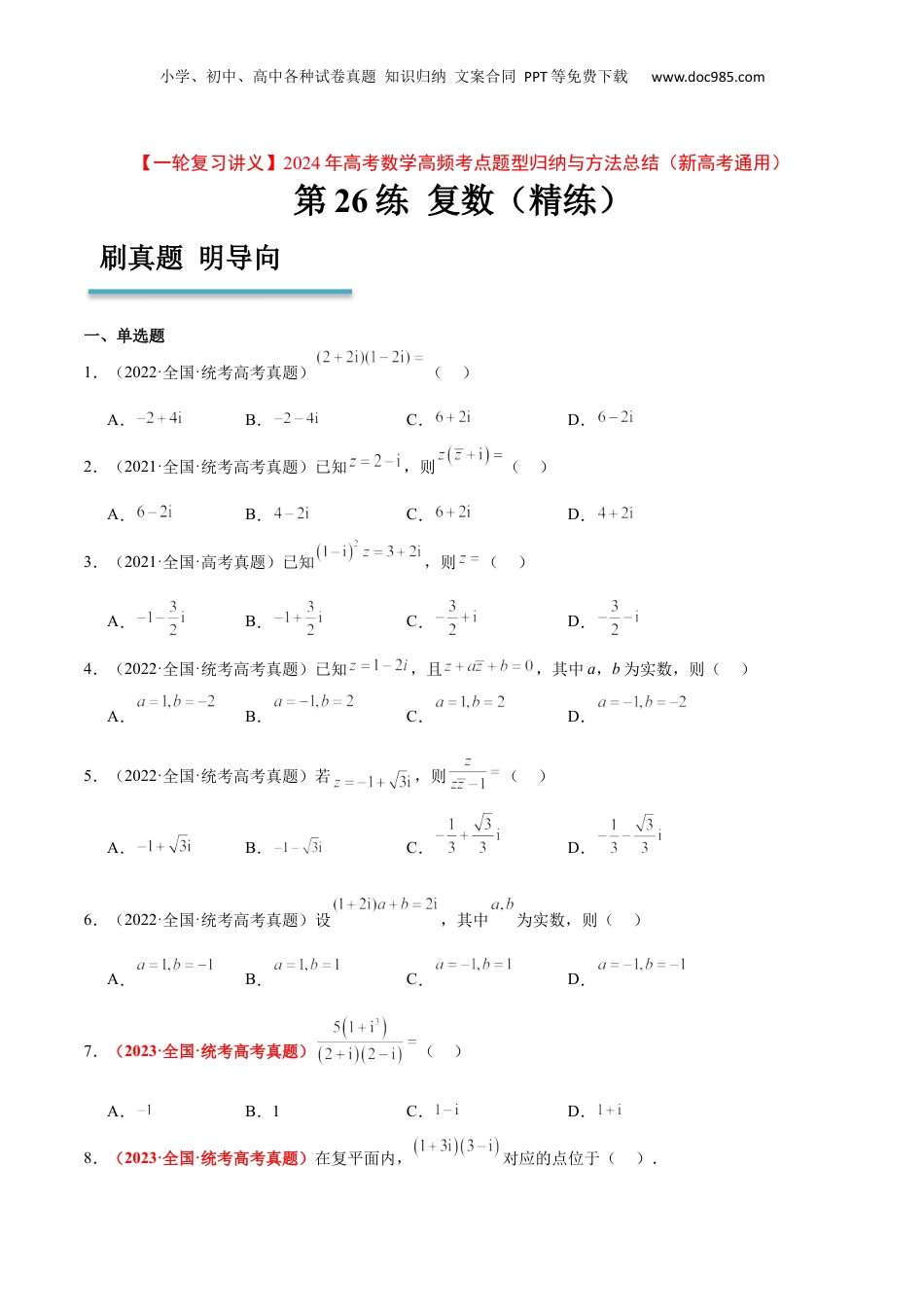 小学、初中、高中各种试卷真题知识归纳文案合同PPT等免费下载www.doc985.com【一轮复习讲义】2024年高考数学高频考点题型归纳与方法总结(新高考通用)第26练复数(精练)一、单选题1.(2022·全国·统考高考真题)()A.B.C.D.2.(2021·全国·统考高考真题)已知,则()A.B.C.D.3.(2021·全国·高考真题)已知,则()A.B.C.D.4.(2022·全国·统考高考真题)已知,且,其中a,b为实数,则()A.B.C.D.5.(2022·全国·统考高考真题)若,则()A.B.C.D.6.(2022·全国·统考高考真题)设,其中为实数,则()A.B.C.D.7.(2023·全国·统考高考真题)()A.B.1C.D.8.(2023·全国·统考高考真题)在复平面内,对应的点位于().刷真题明导向小学、初中、高中各种试卷真题知识归纳文案合同PPT等免费下载www.doc985.comA.第一象限B.第二象限C.第三象限D.第四象限9.(2023·全国·统考高考真题)设,则()A.-1B.0·C.1D.210.(2023·全国·统考高考真题)()A.1B.2C.D.511.(2023·全国·统考高考真题)已知,则()A.B.C.0D.112.(2023·全国·统考高考真题)设,则()A.B.C.D.13.(2021·全国·统考高考真题)设,则()A.B.C.D.14.(2021·全国·统考高考真题)设,则()A.B.C.D.15.(2022·全国·统考高考真题)若,则()A.B.C.1D.216.(2022·全国·统考高考真题)若.则()A.B.C.D.【A组在基础中考查功底】一、单选题1.(2023·宁夏银川·银川一中校考三模)已知,复数是实数,则()小学、初中、高中各种试卷真题知识归纳文案合同PPT等免费下载www.doc985.comA.B.C.D.2.(2023·山东聊城·统考三模)()A.B.C.D.3.(2023·海南·统考模拟预测)已知复数,则().A.iB.C.D.4.(2023·辽宁葫芦岛·统考二模)若,则()A.B.C.D.5.(2023·陕西咸阳·武功县普集高级中学校考模拟预测)已知是虚数单位,复数满足,则复数的共轭复数虚部为()A.B.C.D.6.(2023·浙江·校联考二模)已知复数满足(为虚数单位),则()A.B.C.D.7.(2023·北京·统考模拟预测)若复数满足,则()A.B.C.D.8.(2023·湖南岳阳·统考三模)设复数满足,则复数的虚部是()A.B.C.D.9.(2023·新疆阿勒泰·统考三模)已知是虚数单位,若与互为共轭复数,则()A.B.C.D.小学、初中、高中各种试卷真题知识归纳文案合同PPT等免费下载www.doc985.com10.(2023·江苏·校联考模拟预测)若复数,则()A.3B.4C.D.11.(2023·江西南昌·校联考模拟预测)已知复数满足,则()A.1B.C.D.12.(2023·湖南·校联考二模)设复数(为虚数单位),则()A.B.C.D.13.(2023·河南安阳·统考三模)已知的实部与虚部互为相反数,则实数()A.B.C.D.14.(2023·山西晋中·统考三模)欧拉公式是由瑞士著名数学家欧拉发现的,该公式被誉为数学中的天桥.若复数,,则()A.-iB.iC.D.15.(2023·黑龙江哈尔滨·哈九中校考模拟预测)已知复数z满足,则复数z的虚部为()A.1B.-1C.iD.-i16.(2023·广西桂林·校考模拟预测)已知复数为纯虚数,则()A.0B.1C.D.217.(2023·重庆·统考模拟预测)已知i是虚数单位,复数在复平面内所对应的点位于()小学、初中、高中各种试卷真题知识归纳文案合同PPT等免费下载www.doc985.comA.第一象限B.第二象限C.第三象限D.第四象限18.(2023·广西玉林·统考模拟预测)设复数,则()A.B.C.D.19.(2023·全国·模拟预测)已知复数(为虚数单位),则在复平面内对应的点位于第()象限.A.四B.三C.二D.一20.(2023·全国·模拟预测)已知复数满足(为虚数单位),是的共轭复数,则()A.5B.C.10D.21.(2023·重庆·统考模拟预测)已知复数(是虚数单位),则()A.B.C.D.22.(2022·全国·高三专题练习)欧拉公式(为虚数单位,)是由瑞士著名数学家欧拉发现的,它将指数函数的定义域扩大到复数集,建立了三角函数和指数函数之间的关系,它被誉为“数学中的天桥”,根据此公式可知,...