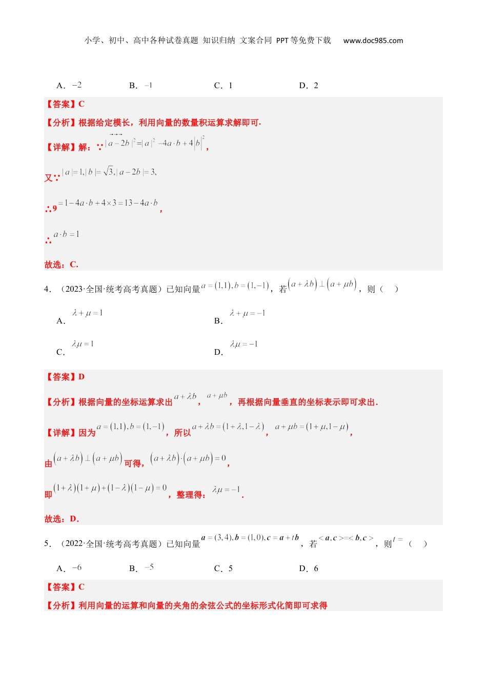 小学、初中、高中各种试卷真题知识归纳文案合同PPT等免费下载www.doc985.com【一轮复习讲义】2024年高考数学高频考点题型归纳与方法总结(新高考通用)第24练平面向量的数量积及其应用(精练)一、单选题1.(2022·全国·统考高考真题)已知向量,则()A.2B.3C.4D.5【答案】D【分析】先求得,然后求得.【详解】因为,所以.故选:D2.(2023·全国·统考高考真题)已知向量,则()A.B.C.D.【答案】B【分析】利用平面向量模与数量积的坐标表示分别求得,从而利用平面向量余弦的运算公式即可得解.【详解】因为,所以,则,,所以.故选:B.3.(2022·全国·统考高考真题)已知向量满足,则()刷真题明导向小学、初中、高中各种试卷真题知识归纳文案合同PPT等免费下载www.doc985.comA.B.C.1D.2【答案】C【分析】根据给定模长,利用向量的数量积运算求解即可.【详解】解: ,又 ∴9,∴故选:C.4.(2023·全国·统考高考真题)已知向量,若,则()A.B.C.D.【答案】D【分析】根据向量的坐标运算求出,,再根据向量垂直的坐标表示即可求出.【详解】因为,所以,,由可得,,即,整理得:.故选:D.5.(2022·全国·统考高考真题)已知向量,若,则()A.B.C.5D.6【答案】C【分析】利用向量的运算和向量的夹角的余弦公式的坐标形式化简即可求得小学、初中、高中各种试卷真题知识归纳文案合同PPT等免费下载www.doc985.com【详解】解:,,即,解得,故选:C6.(2023·北京·统考高考真题)已知向量满足,则()A.B.C.0D.1【答案】B【分析】利用平面向量数量积的运算律,数量积的坐标表示求解作答.【详解】向量满足,所以.故选:B7.(2021·浙江·统考高考真题)已知非零向量,则“”是“”的()A.充分不必要条件B.必要不充分条件C.充分必要条件D.既不充分又不必要条件【答案】B【分析】考虑两者之间的推出关系后可得两者之间的条件关系.【详解】如图所示,,当时,与垂直,,所以成立,此时,∴不是的充分条件,当时,,∴,∴成立,∴是的必要条件,综上,“”是“”的必要不充分条件小学、初中、高中各种试卷真题知识归纳文案合同PPT等免费下载www.doc985.com故选:B.8.(2023·全国·统考高考真题)已知向量满足,且,则()A.B.C.D.【答案】D【分析】作出图形,根据几何意义求解.【详解】因为,所以,即,即,所以.如图,设,由题知,是等腰直角三角形,AB边上的高,小学、初中、高中各种试卷真题知识归纳文案合同PPT等免费下载www.doc985.com所以,,.故选:D.9.(2022·北京·统考高考真题)在中,.P为所在平面内的动点,且,则的取值范围是()A.B.C.D.【答案】D【分析】依题意建立平面直角坐标系,设,表示出,,根据数量积的坐标表示、辅助角公式及正弦函数的性质计算可得;【详解】解:依题意如图建立平面直角坐标系,则,,,小学、初中、高中各种试卷真题知识归纳文案合同PPT等免费下载www.doc985.com因为,所以在以为圆心,为半径的圆上运动,设,,所以,,所以,其中,,因为,所以,即;故选:D二、填空题10.(2022·全国·统考高考真题)已知向量.若,则______________.【答案】小学、初中、高中各种试卷真题知识归纳文案合同PPT等免费下载www.doc985.com【分析】直接由向量垂直的坐标表示求解即可.【详解】由题意知:,解得.故答案为:.11.(2021·全国·统考高考真题)已知向量,若,则__________.【答案】【分析】根据平面向量数量积的坐标表示以及向量的线性运算列出方程,即可解出.【详解】因为,所以由可得,,解得.故答案为:.【点睛】本题解题关键是熟记平面向量数量积的坐标表示,设,,注意与平面向量平行的坐标表示区分.12.(2021·全国·统考高考真题)已知向量.若,则________.【答案】.【分析】利用向量的坐标运算法则求得向量的坐标,利用向量的数量积为零求得的值【详解】,,解得,故答案为:.【点睛】本题考查平面向量的坐标运算,平面向量垂直的条件,属基础题,利用平面向量垂直的充分必要条件是其数量积.小学、初中、高中各种试卷真题知识归纳文案合同PPT等免费下载www.doc985.com13.(2021·全国·高...