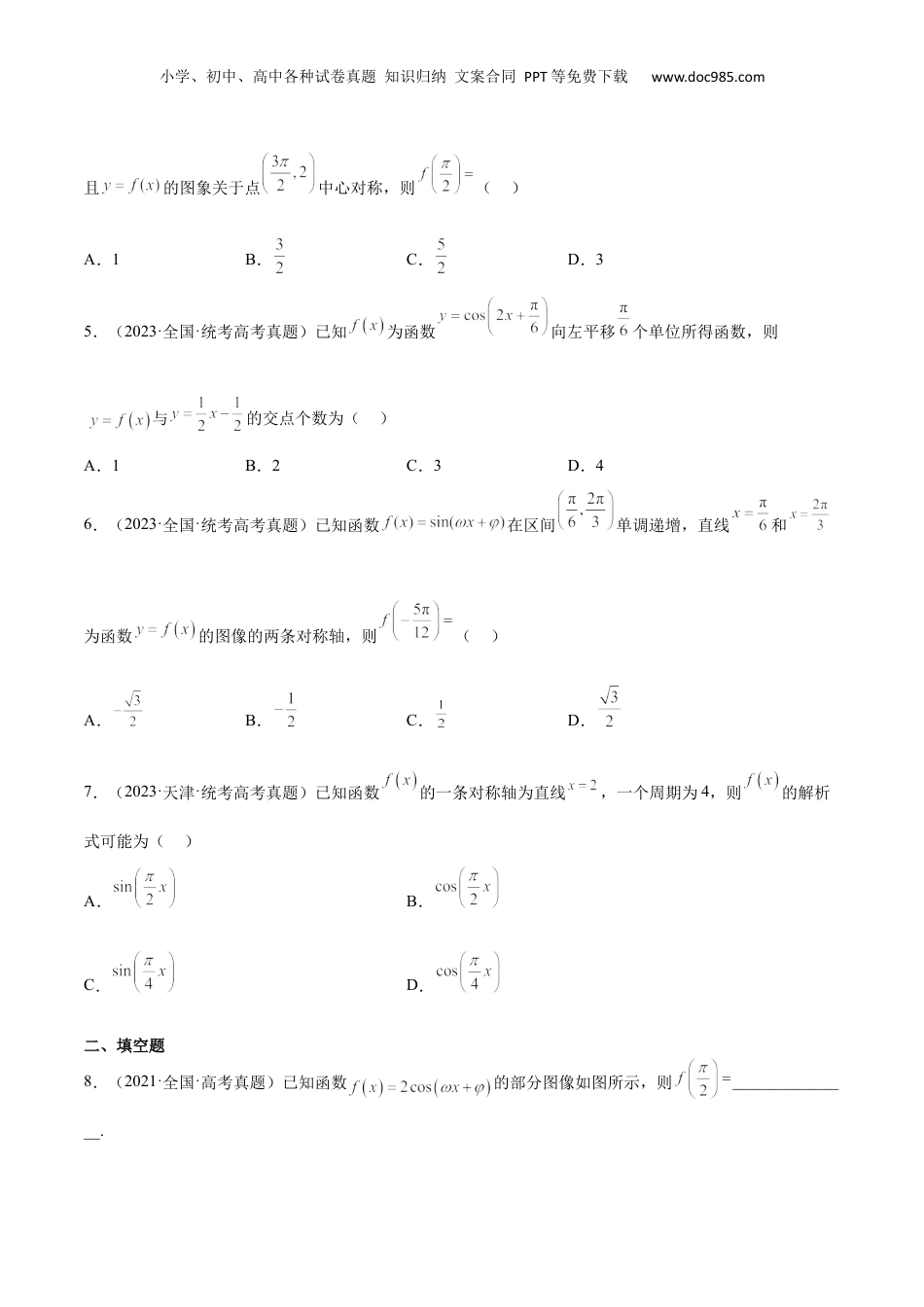 小学、初中、高中各种试卷真题知识归纳文案合同PPT等免费下载www.doc985.com【一轮复习讲义】2024年高考数学高频考点题型归纳与方法总结(新高考通用)第21练函数y=Asin(ωx+φ)的图象性质及其应用(精练)一、单选题1.(2022·浙江·统考高考真题)为了得到函数的图象,只要把函数图象上所有的点()A.向左平移个单位长度B.向右平移个单位长度C.向左平移个单位长度D.向右平移个单位长度2.(2021·全国·统考高考真题)把函数图像上所有点的横坐标缩短到原来的倍,纵坐标不变,再把所得曲线向右平移个单位长度,得到函数的图像,则()A.B.C.D.3.(2022·全国·统考高考真题)将函数的图像向左平移个单位长度后得到曲线C,若C关于y轴对称,则的最小值是()A.B.C.D.4.(2022·全国·统考高考真题)记函数的最小正周期为T.若,刷真题明导向小学、初中、高中各种试卷真题知识归纳文案合同PPT等免费下载www.doc985.com且的图象关于点中心对称,则()A.1B.C.D.35.(2023·全国·统考高考真题)已知为函数向左平移个单位所得函数,则与的交点个数为()A.1B.2C.3D.46.(2023·全国·统考高考真题)已知函数在区间单调递增,直线和为函数的图像的两条对称轴,则()A.B.C.D.7.(2023·天津·统考高考真题)已知函数的一条对称轴为直线,一个周期为4,则的解析式可能为()A.B.C.D.二、填空题8.(2021·全国·高考真题)已知函数的部分图像如图所示,则_______________.小学、初中、高中各种试卷真题知识归纳文案合同PPT等免费下载www.doc985.com9.(2023·全国·统考高考真题)已知函数,如图A,B是直线与曲线的两个交点,若,则______.三、解答题10.(2021·浙江·统考高考真题)设函数.(1)求函数的最小正周期;(2)求函数在上的最大值.【A组在基础中考查功底】一、单选题1.(2023·安徽蚌埠·统考三模)已知函数,则要得到函数的图象,只需将函数的图象()小学、初中、高中各种试卷真题知识归纳文案合同PPT等免费下载www.doc985.comA.向左平移个单位B.向右平移个单位C.向左平移个单位D.向右平移个单位2.(2023·河南郑州·模拟预测)把函数图象上所有点的纵坐标不变,横坐标伸长到原来的2倍,再把所得曲线向右平移个单位长度,得到函数的图象,则()A.B.C.D.3.(2023·福建南平·统考模拟预测)已知函数的图象的相邻两条对称轴间的距离为,则()A.的周期为B.在上单调递增C.的图象关于点对称D.的图象关于直线对称4.(2023·全国·模拟预测)将函数的图象上各点向右平移个单位长度得函数的图象,则的单调递增区间为()小学、初中、高中各种试卷真题知识归纳文案合同PPT等免费下载www.doc985.comA.B.C.D.5.(2023·四川南充·统考三模)已知点是函数的一个对称中心,则为了得到函数的图像,可以将图像()A.向右平移个单位,再向上移动1个单位B.向左平移个单位,再向上移动1个单位C.向右平移个单位,再向下移动1个单位D.向右平移个单位,再向下移动1个单位6.(2023·河北石家庄·统考三模)已知函数的部分图象如图所示,则图象的一个对称中心是()A.B.C.D.小学、初中、高中各种试卷真题知识归纳文案合同PPT等免费下载www.doc985.com7.(2023·四川·四川省金堂中学校校联考三模)已知直线是函数图象的任意两条对称轴,且的最小值为,则的单调递增区间是()A.B.C.D.8.(2023·浙江绍兴·统考模拟预测)若函数的周期为,其图象由函数的图象向左平移个单位得到,则的一个单调递增区间是()A.B.C.D.9.(2023·四川遂宁·统考三模)已知函数,,,且的最小值为,则的值为()A.B.C.1D.210.(2023·山东烟台·统考二模)已知函数在上单调递增,则的取值范围为().A.B.小学、初中、高中各种试卷真题知识归纳文案合同PPT等免费下载www.doc985.comC.D.11.(2023·河北沧州·统考模拟预测)已知函数的图象关于对称,当的最小正周期取得最大值时,距离原点最近的对称中心为()A.B.C.D.12.(2023·河南鹤壁·鹤壁高中校考模拟预测)已知函数,则下列说法正确的为()A.的最小正周...