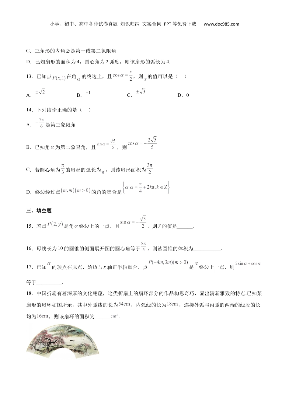 小学、初中、高中各种试卷真题知识归纳文案合同PPT等免费下载www.doc985.com【一轮复习讲义】2024年高考数学高频考点题型归纳与方法总结(新高考通用)第17练任意角和弧度制及三角函数的概念(精练)【A组在基础中考查功底】一、单选题1.若扇形的弧长是8,面积是16,则这个扇形的圆心角的弧度数是()A.2B.3C.4D.52.用弧度制表示终边在轴上的角的集合,正确的是()A.Z}B.Z}C.Z}D.Z}3.已知扇形的周长为4,扇形圆心角的弧度数为2,则扇形的弧长为()A.2B.4C.6D.84.集合中角表示的范围用阴影表示是图中的()A.B.C.D.5.已知是第一象限角,那么()小学、初中、高中各种试卷真题知识归纳文案合同PPT等免费下载www.doc985.comA.是第一、二象限角B.是第一、三象限角C.是第三、四象限角D.是第二、四象限角6.已知第二象限角的终边与单位圆交于,则()A.B.C.D.7.若,则角的终边在()A.第一、二象限B.第二、三象限C.第三、四象限D.第一、四象限8.已知角的终边上一点的坐标,其中a是非零实数,则下列三角函数值恒为正的是()A.B.C.D.9.已知角α的终边上一点,且,则m等于()A.B.3C.-3D.10.若是第四象限角,则点在()A.第二或第四象限B.第一或第三象限C.第三或第四象限D.第一或第二象限二、多选题11.下列说法正确的是()A.B.第一象限的角是锐角C.1弧度的角比1°的角大D.锐角是第一象限的角12.下列说法正确的是()A.终边在y轴上的角的集合为B.若是第二象限角,则是第一或第三象限角小学、初中、高中各种试卷真题知识归纳文案合同PPT等免费下载www.doc985.comC.三角形的内角必是第一或第二象限角D.已知扇形的面积为4,圆心角为2弧度,则该扇形的弧长为4.13.已知点在角的终边上,且,则的值可以是()A.B.C.D.014.下列结论正确的是()A.是第三象限角B.已知角为第二象限角,且,则C.若圆心角为的扇形的弧长为,则该扇形面积为D.终边经过点的角的集合是三、填空题15.若点是角终边上的一点,且,则的值是______.16.母线长为10的圆锥的侧面展开图的圆心角等于,则该圆锥的体积为___________.17.已知的顶点在原点,始边与x轴正半轴重合,点是终边上一点,则等于__________.18.中国折扇有着深厚的文化底蕴,这类折扇上的扇环部分的作品构思奇巧,显出清新雅致的特点.已知某扇形的扇环如图所示,其中外弧线的长为,内弧线的长为,连接外弧与内弧的两端的线段的长均为,则该扇环的面积为______.小学、初中、高中各种试卷真题知识归纳文案合同PPT等免费下载www.doc985.com四、解答题19.已知一扇形的圆心角为,半径为R,弧长为l.(1)若,,求扇形的弧长l;(2)若扇形面积为16,求扇形周长的最小值,及此时扇形的圆心角.20.油纸伞是世界上最早的雨伞,是中国古人智慧的结晶.它以手工削制的竹条做伞架,以涂刷天然防水桐油的皮棉纸做伞面.伞面可近似看成圆锥形.若某种油纸伞的伞面下边沿所在圆的半径为,顶点到下边沿上任一点的长度为.(1)若将该伞的伞面沿一条母线剪开,展开后所得扇形的圆心角为多少弧度?(2)若伞面的内外表面需要各刷1次桐油,每平方米需要刷桐油,则刷一个这样的油纸伞需要多少千克桐油?(参考数据:)【B组在综合中考查能力】一、单选题1.如果角的终边在直线上,则()A.B.C.D.2.若,,则的终边在()A.第一、三象限B.第二、四象限C.第一、三象限或在x轴的非负半轴上D.第二、四象限或在x轴上3.中国传统扇文化有着极其深厚的底蕴.一般情况下,折扇可看作是从一个圆面中剪下的扇形制作而成,小学、初中、高中各种试卷真题知识归纳文案合同PPT等免费下载www.doc985.com如图,设扇形的面积为,其圆心角为,圆面中剩余部分的面积为,当与的比值为时,扇面为“美观扇面”,则下列结论错误的是()(参考数据:)A.B.若,扇形的半径,则C.若扇面为“美观扇面”,则D.若扇面为“美观扇面”,扇形的半径,则此时的扇形面积为4.如图,已知圆锥的母线长为2,底面半径为,一只蚂蚁从A点出发,沿圆锥侧面爬行一周返回A点,则蚂蚁爬行的最短距离为()A.1B.C.D.45.我国古代数学家赵爽在...