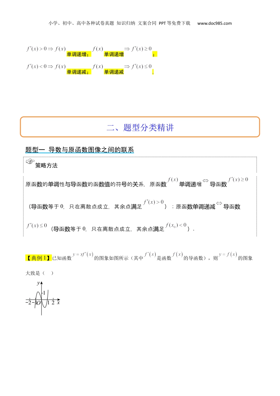 小学、初中、高中各种试卷真题知识归纳文案合同PPT等免费下载www.doc985.com【一轮复习讲义】2024年高考数学高频考点题型归纳与方法总结(新高考通用)第15讲导数与函数的单调性(精讲)题型目录一览①导数与原函数图像之间的联系②不含参数的函数单调性③含参数的函数单调性(1)一次函数型(2)二次函数型Ⅰ(可因式分解)(3)二次函数型Ⅱ(不可因式分解)(4)指数函数型④函数单调性中的参数值(范围)问题一、单调性基础问题1.函数的单调性函数单调性的判定方法:设函数在某个区间内可导,如果,则为增函数;如果,则为减函数.2.已知函数的单调性问题①若在某个区间上单调递增,则在该区间上有恒成立(但不恒等于0);反之,要满足,才能得出在某个区间上单调递增;②若在某个区间上单调递减,则在该区间上有恒成立(但不恒等于0);反之,要满足,才能得出在某个区间上单调递减.二、讨论单调区间问题类型一:不含参数单调性讨论(1)求导化简定义域(化简应先通分,尽可能因式分解;定义域需要注意是否是连续的区间);(2)变号保留定号去(变号部分:导函数中未知正负,需要单独讨论的部分.定号部分:已知恒正或恒负,无需单独讨论的部分);一、知识点梳理小学、初中、高中各种试卷真题知识归纳文案合同PPT等免费下载www.doc985.com(3)求根做图得结论(如能直接求出导函数等于0的根,并能做出导函数与x轴位置关系图,则导函数正负区间段已知,可直接得出结论);(4)未得结论断正负(若不能通过第三步直接得出结论,则先观察导函数整体的正负);(5)正负未知看零点(若导函数正负难判断,则观察导函数零点);(6)一阶复杂求二阶(找到零点后仍难确定正负区间段,或一阶导函数无法观察出零点,则求二阶导);求二阶导往往需要构造新函数,令一阶导函数或一阶导函数中变号部分为新函数,对新函数再求导.(7)借助二阶定区间(通过二阶导正负判断一阶导函数的单调性,进而判断一阶导函数正负区间段);类型二:含参数单调性讨论(1)求导化简定义域(化简应先通分,然后能因式分解要进行因式分解,定义域需要注意是否是一个连续的区间);(2)变号保留定号去(变号部分:导函数中未知正负,需要单独讨论的部分.定号部分:已知恒正或恒负,无需单独讨论的部分);(3)恒正恒负先讨论(变号部分因为参数的取值恒正恒负);然后再求有效根;(4)根的分布来定参(此处需要从两方面考虑:根是否在定义域内和多根之间的大小关系);(5)导数图像定区间;【常用结论】①使的离散点不影响函数的单调性,即当在某个区间内离散点处为零,在其余点处均为正(或负)时,在这个区间上仍旧是单调递增(或递减)的.例如,在上,,当时,;当时,,而显然在上是单调递增函数.②若函数在区间上单调递增,则(不恒为0),反之不成立.因为,即或,当时,函数在区间上单调递增.当时,在这个区间为常值函数;同理,若函数在区间上单调递减,则(不恒为0),反之不成立.这说明在一个区间上函数的导数大于零,是这个函数在该区间上单调递增的充分不必要条件.于是有如下结论:小学、初中、高中各种试卷真题知识归纳文案合同PPT等免费下载www.doc985.com单调递增;单调递增;单调递减;单调递减.题型一导数与原函数图像之间的联系策略方法原函的性函的函的符的系,原函数单调与导数数值号关数增单调递函导数(函等于导数0,只在离散点成立,其余点足满);原函数单调递减函导数(函等于导数0,只在离散点成立,其余点足满).【典例1】已知函数的图象如图所示(其中是函数的导函数),则的图象大致是()二、题型分类精讲小学、初中、高中各种试卷真题知识归纳文案合同PPT等免费下载www.doc985.comA.B.C.D.【答案】C【分析】由的图象得到的取值情况,即可得到的单调性,即可判断.【详解】由的图象可知当时,则,当时,则,当时,则,当时,则,所以在上单调递增,在上单调递减,在上单调递减,在上单调递增,故符合题意的只有C.故选:C.【题型训练】一、单选题1.(2023·浙江绍兴·统考模拟预测)如图是函数的导函数的图象,若,则的图象大致为()小学、初中、高中各种试卷真题知识归纳文案合同PPT...