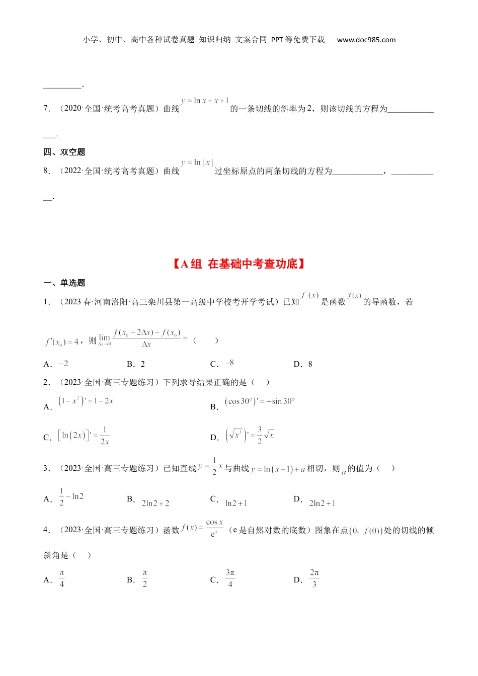 小学、初中、高中各种试卷真题知识归纳文案合同PPT等免费下载www.doc985.com【一轮复习讲义】2024年高考数学高频考点题型归纳与方法总结(新高考通用)第14练导数的概念及其意义、导数的运算(精练)一、单选题1.(2021·全国·统考高考真题)若过点可以作曲线的两条切线,则()A.B.C.D.二、解答题2.(2021·北京·统考高考真题)已知函数.(1)若,求曲线在点处的切线方程;3.(2022·全国·统考高考真题)已知函数(1)当时,求曲线在点处的切线方程;4.(2022·天津·统考高考真题)已知,函数(1)求函数在处的切线方程;三、填空题5.(2021·全国·统考高考真题)曲线在点处的切线方程为__________.6.(2022·全国·统考高考真题)若曲线有两条过坐标原点的切线,则a的取值范围是_______刷真题明导向小学、初中、高中各种试卷真题知识归纳文案合同PPT等免费下载www.doc985.com_________.7.(2020·全国·统考高考真题)曲线的一条切线的斜率为2,则该切线的方程为______________.四、双空题8.(2022·全国·统考高考真题)曲线过坐标原点的两条切线的方程为____________,____________.【A组在基础中考查功底】一、单选题1.(2023春·河南洛阳·高三栾川县第一高级中学校考开学考试)已知是函数的导函数,若,则()A.B.2C.D.82.(2023·全国·高三专题练习)下列求导结果正确的是()A.B.C.D.3.(2023·全国·高三专题练习)已知直线与曲线相切,则的值为()A.B.C.D.4.(2023·全国·高三专题练习)函数(e是自然对数的底数)图象在点处的切线的倾斜角是()A.B.C.D.小学、初中、高中各种试卷真题知识归纳文案合同PPT等免费下载www.doc985.com5.(2023·全国·高三专题练习)函数的图象在点处的切线方程是()A.B.C.D.6.(2023秋·广东深圳·高三统考期末)已知为偶函数,当时,,则曲线在点处的切线方程是()A.B.C.D.7.(2023·四川达州·统考一模)已知函数,则()A.B.1C.D.58.(2023·全国·高三专题练习)函数在处的切线方程为()A.B.C.D.9.(2023·全国·高三专题练习)过原点引的切线,若切线斜率为,则()A.B.C.D.10.(2023·全国·高三专题练习)已知曲线在点处的切线方程为,则()A.B.C.D.11.(2023·山西·校联考模拟预测)已知点P是曲线上任意的一点,则点P到直线小学、初中、高中各种试卷真题知识归纳文案合同PPT等免费下载www.doc985.com的距离的最小值是()A.B.C.D.12.(2023·全国·高三专题练习)已知函数在处的切线为l,第一象限内的点在切线l上,则的最小值为()A.B.C.D.二、多选题13.(2023·江苏淮安·江苏省盱眙中学校考模拟预测)已知函数,则()A.的极大值为B.的极大值为C.曲线在处的切线方程为D.曲线在处的切线方程为14.(2023·全国·高三专题练习)已知函数,则下列结论正确的是()A.曲线的切线斜率可以是1B.曲线的切线斜率可以是C.过点且与曲线相切的直线有且只有1条D.过点且与曲线相切的直线有且只有2条15.(2023·全国·高三专题练习)(多选)设点P是曲线上的任意一点,P点处的切线的倾斜角为,则角的取值范围包含()小学、初中、高中各种试卷真题知识归纳文案合同PPT等免费下载www.doc985.comA.B.C.D.16.(2023·全国·高三专题练习)(多选)曲线在点处的切线与其平行直线的距离为,则直线的方程可能为()A.B.C.D.三、填空题17.(2023·广西玉林·统考三模)函数在处的切线与直线平行,则a=______.18.(2023春·黑龙江·高三校联考开学考试)请写出与曲线在处具有相同切线的另一个函数:______.19.(2023·吉林长春·吉林省实验校考模拟预测)若曲线在点处的切线方程是,则______.20.(2023·全国·高三专题练习)过点且与曲线相切的直线方程为______.21.(2023·全国·高三专题练习)若曲线有两条过坐标原点的切线,则实a的取值范围为______.22.(2023秋·广东·高三统考期末)已知函数在点处的切线经过点,则的最小值为___________.【B组在综合中考查能力】一、单选题1.(2023·江西赣州·统考二模)已知曲线在处的...
