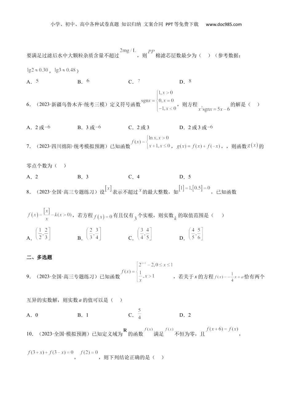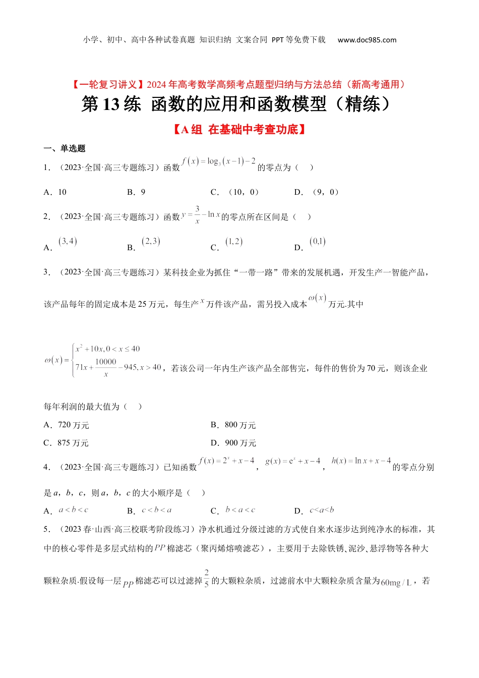 小学、初中、高中各种试卷真题知识归纳文案合同PPT等免费下载www.doc985.com【一轮复习讲义】2024年高考数学高频考点题型归纳与方法总结(新高考通用)第13练函数的应用和函数模型(精练)【A组在基础中考查功底】一、单选题1.(2023·全国·高三专题练习)函数的零点为()A.10B.9C.(10,0)D.(9,0)2.(2023·全国·高三专题练习)函数的零点所在区间是()A.B.C.D.3.(2023·全国·高三专题练习)某科技企业为抓住“一带一路”带来的发展机遇,开发生产一智能产品,该产品每年的固定成本是25万元,每生产万件该产品,需另投入成本万元.其中,若该公司一年内生产该产品全部售完,每件的售价为70元,则该企业每年利润的最大值为()A.720万元B.800万元C.875万元D.900万元4.(2023·全国·高三专题练习)已知函数,,的零点分别是a,b,c,则a,b,c的大小顺序是()A.B.C.D.5.(2023春·山西·高三校联考阶段练习)净水机通过分级过滤的方式使自来水逐步达到纯净水的标准,其中的核心零件是多层式结构的棉滤芯(聚丙烯熔喷滤芯),主要用于去除铁锈、泥沙、悬浮物等各种大颗粒杂质.假设每一层棉滤芯可以过滤掉的大颗粒杂质,过滤前水中大颗粒杂质含量为,若小学、初中、高中各种试卷真题知识归纳文案合同PPT等免费下载www.doc985.com要满足过滤后水中大颗粒杂质含量不超过,则棉滤芯层数最少为()(参考数据:,)A.B.C.D.6.(2023·新疆乌鲁木齐·统考三模)定义符号函数,则方程的解是()A.2或B.3或C.2或3D.2或3或7.(2023·四川绵阳·统考模拟预测)已知函数,,,则函数的零点个数为()A.2B.3C.4D.58.(2023·全国·高三专题练习)设表示不超过的最大整数,如,已知函数,若方程有且仅有个实根,则实数的取值范围是()A.B.C.D.二、多选题9.(2023·全国·高三专题练习)已知函数,若关于x的方程恰有两个互异的实数解,则实数a的值可以是()A.0B.1C.D.210.(2023·全国·模拟预测)已知定义域为的函数满足不恒为零,且,,,则下列结论正确的是()小学、初中、高中各种试卷真题知识归纳文案合同PPT等免费下载www.doc985.comA.B.是奇函数C.的图像关于直线对称D.在[0,10]上有6个零点三、填空题11.(2023春·北京大兴·高三校考开学考试)已知函数,则函数的零点个数为___________.12.(2023秋·广东潮州·高三统考期末)定义在上的奇函数满足,且当时,,则函数的所有零点之和为______.13.(2023春·江苏南京·高三江苏省南京市第十二中学校考阶段练习)已知函数,若方程f(x)=m(mR∈)恰有三个不同的实数解a,b,c(a<b<c),则(a+b)c的取值范围是_____________.14.(2023·全国·高三专题练习)已知函数的两个零点一个大于2,一个小于2,且,则的取值范围为______四、解答题15.(2023春·云南昆明·高三云南省昆明市第十二中学校考阶段练习)已知函数是偶函数.当时,.(1)求函数在上的解析式;(2)若函数在区间上单调,求实数a的取值范围;(3)已知,试讨论的零点个数,并求对应的m的取值范围.16.(2023·全国·高三专题练习)某企业生产一种电子设备,通过市场分析,每台设备的成本与产量满足小学、初中、高中各种试卷真题知识归纳文案合同PPT等免费下载www.doc985.com一定的关系式.设年产量为(,)(单位:台),若年产量不超过70台,则每台设备的成本为(单位:万元);若年产量超过70台不超过200台,则每台设备的成本为(单位:万元),每台设备售价为100万元,假设该企业生产的电子设备能全部售完.(1)写出年利润(万元)关于年产量(台)的关系式;(2)当年产量为多少台时,年利润最大,最大值为多少万元?【B组在综合中考查能力】一、单选题1.(2023春·广东·高三校联考阶段练习)“打水漂”是一种游戏,通过一定方式投掷石片,使石片在水面上实现多次弹跳,弹跳次数越多越好.小赵同学在玩“打水漂”游戏时,将一石片按一定方式投掷出去,石片第一次接触水面时的速度为,然后石片在水面上继续进行多次弹跳.不考虑其他因素,假设石片每一次接触水面时的速度均为上一次的,若石片接触水面时的速度低于,...