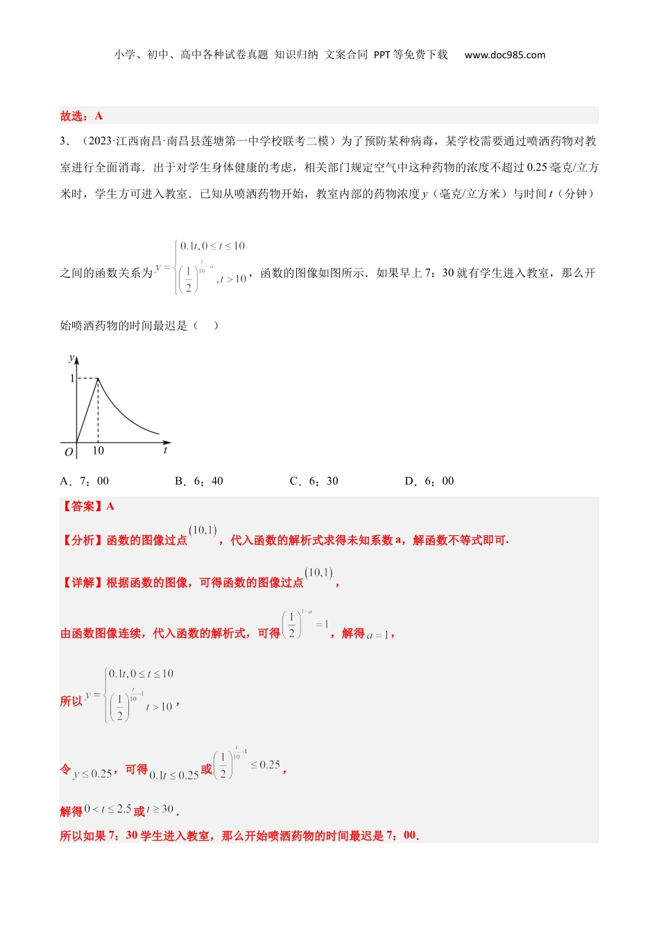 小学、初中、高中各种试卷真题知识归纳文案合同PPT等免费下载www.doc985.com【一轮复习讲义】2024年高考数学高频考点题型归纳与方法总结(新高考通用)第10练指数与指数函数(精练)【A组在基础中考查功底】一、单选题1.(2023·全国·学军中学校联考二模)已知集合或x≤−2},则()A.或B.或x≤−2}C.或D.【答案】B【分析】解法一:根据题意求集合M,进而根据交集运算求解;解法二:取特值检验排除.【详解】解法一:由题可得或或x≤−2},所以或x≤−2}.故选:B.解法二:由题可得,所以,故排除A、D;又且,所以,故排除C.故选:B.2.(2023·北京朝阳·高三专题练习)“”是“”的()A.充分而不必要条件B.必要而不充分条件C.充分必要条件D.既不充分也不必要条件【答案】A【分析】根据充分条件和必要条件的定义,结合指数函数的单调性即可得出答案.【详解】因为指数函数单调递增,由可得:,充分性成立,当时,,但不一定,必要性不成立,小学、初中、高中各种试卷真题知识归纳文案合同PPT等免费下载www.doc985.com故选:A3.(2023·江西南昌·南昌县莲塘第一中学校联考二模)为了预防某种病毒,某学校需要通过喷洒药物对教室进行全面消毒.出于对学生身体健康的考虑,相关部门规定空气中这种药物的浓度不超过0.25毫克/立方米时,学生方可进入教室.已知从喷洒药物开始,教室内部的药物浓度y(毫克/立方米)与时间t(分钟)之间的函数关系为,函数的图像如图所示.如果早上7:30就有学生进入教室,那么开始喷洒药物的时间最迟是()A.7:00B.6:40C.6:30D.6:00【答案】A【分析】函数的图像过点,代入函数的解析式求得未知系数a,解函数不等式即可.【详解】根据函数的图像,可得函数的图像过点,由函数图像连续,代入函数的解析式,可得,解得,所以,令,可得或,解得或.所以如果7:30学生进入教室,那么开始喷洒药物的时间最迟是7:00.小学、初中、高中各种试卷真题知识归纳文案合同PPT等免费下载www.doc985.com故选:A.4.(2023·陕西商洛·统考二模)函数的部分图象大致是()A.B.C.D.【答案】C【分析】奇偶性定义判断函数奇偶性,结合上函数符号,应用排除法即可得答案.【详解】因为,所以且定义域为R,所以是奇函数,则的图象关于原点对称,排除A、B.当时,,排除D.故选:C5.(2023秋·吉林辽源·高三校联考期末)已知函数,若,则实数a的取值范围是()A.B.C.D.【答案】C【分析】构造函数,研究函数的单调性与奇偶性,利用函数性质解不等式.【详解】令,定义域为,且,所以函数为定义域内的奇函数,且在上单调递增;小学、初中、高中各种试卷真题知识归纳文案合同PPT等免费下载www.doc985.com则,则,即,即,又因为为定义域内的奇函数,所以,又因为在上单调递增,所以,解得或,故实数a的取值范围是.故选:C6.(2023秋·湖南长沙·高三校考阶段练习)设,用表示不超过的最大整数,则称取整函数,例如:,已知则函数的值域为()A.B.C.D.【答案】D【分析】分离常数得,进而求得,从而可得答案.【详解】,,,,当当.故选:D二、多选题7.(2023春·重庆渝中·高三重庆巴蜀中学校考阶段练习)若,其中为自然对数的底数,则下列命题正确的是()A.在上单调递增B.在上单调递减小学、初中、高中各种试卷真题知识归纳文案合同PPT等免费下载www.doc985.comC.的图象关于直线对称D.的图象关于点中心对称【答案】BC【分析】根据复合函数的单调性判断A、B,根据奇偶性的定义判断函数为偶函数,即可判断C、D.【详解】因为在上单调递减,在上单调递增,在定义域上单调递增,所以在上单调递减,在上单调递增,故A错误,B正确;又,所以为偶函数,函数图象关于轴对称,即关于直线对称,故C正确,D错误;故选:BC8.(2023春·云南昭通·高三校考阶段练习)已知函数,下列说法中正确的是()A.不是周期函数B.在(0,)上是单调递增函数C.在(0,)内有且只有一个零点D.关于点(,0)对称【答案】BCD【分析】根据周期函数的定义、指数函数、正弦函数、余弦函数的单调性,结合零点定义和点对称的性质逐一判断即可.【详解】 ,∴是周期函数,A错误;当x...