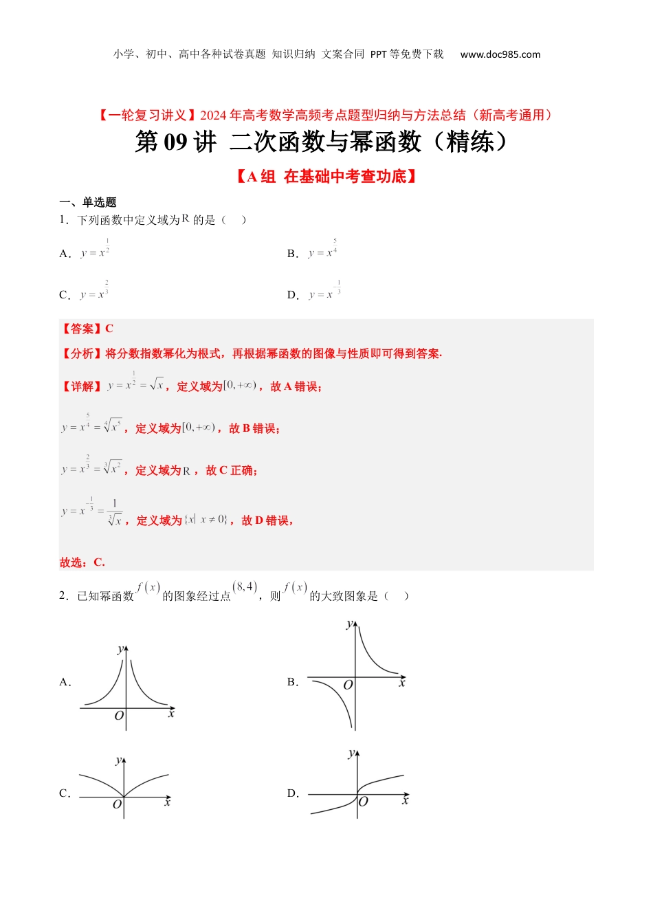 小学、初中、高中各种试卷真题知识归纳文案合同PPT等免费下载www.doc985.com【一轮复习讲义】2024年高考数学高频考点题型归纳与方法总结(新高考通用)第09讲二次函数与幂函数(精练)【A组在基础中考查功底】一、单选题1.下列函数中定义域为的是()A.B.C.D.【答案】C【分析】将分数指数幂化为根式,再根据幂函数的图像与性质即可得到答案.【详解】,定义域为,故A错误;,定义域为,故B错误;,定义域为,故C正确;,定义域为,故D错误,故选:C.2.已知幂函数的图象经过点,则的大致图象是()A.B.C.D.小学、初中、高中各种试卷真题知识归纳文案合同PPT等免费下载www.doc985.com【答案】C【分析】先求出函数的解析式,再求出函数的定义域和奇偶性判断即可.【详解】设,因为的图象经过点,所以,即,解得,则,因为,所以为偶函数,排除B、D,因为的定义域为,排除A.因为在内单调递增,结合偶函数可得在内单调递减,故C满足,故选:C.3.设,则“”是“”的()A.充分不必要条件B.必要不充分条件C.充分必要条件D.既不充分也不必要条件【答案】D【分析】根据充分必要条件的定义结合不等式的性质、对数函数性质、幂函数性质求解.【详解】由得即,则有,取,则,所以推不到,由得,取,则,则有,所以推不到,所以“”是“”的既不充分也不必要条件,故选:D.4.已知函数是幂函数,且在上递减,则实数()小学、初中、高中各种试卷真题知识归纳文案合同PPT等免费下载www.doc985.comA.B.2或C.4D.2【答案】D【分析】由题可知,且,解出并代入验证即可.【详解】由题知是幂函数,则,解得或,在上递减,,将代入可得,不符合题意,故舍去,将代入可得,符合题意,故.故选:D5.已知函数是幂函数,则下列关于说法正确的是()A.奇函数B.偶函数C.定义域为D.在单调递减【答案】C【分析】根据函数为幂函数,得到,从而求出定义域和单调性,并得到既不是奇函数,也不是偶函数.【详解】为幂函数,故,解得:,所以,定义域为,不关于原点对称,所以既不是奇函数,也不是偶函数,AB错误,在上单调递增,D错误.小学、初中、高中各种试卷真题知识归纳文案合同PPT等免费下载www.doc985.com故选:C6.的最大值是()A.B.2C.D.4【答案】A【分析】设可得,配方后利用二次函数的性质求解即可.【详解】设,则,因为,所以时,的最大值是,故选:A.7.已知函数在区间上是单调函数,则实数k的取值范围是()A.B.C.D.【答案】C【分析】根据二次函数的性质可得或,解出即可得出实数k的取值范围.【详解】函数的对称轴为.若函数在区间上单调递减,则应有,所以;若函数在区间上单调递增,则应有,所以.综上所述,实数k的取值范围是或.故选:C.小学、初中、高中各种试卷真题知识归纳文案合同PPT等免费下载www.doc985.com8.设是定义在上偶函数,则在区间上是()A.增函数B.减函数C.先增后减函数D.与,有关,不能确定【答案】B【分析】根据偶函数的特点解出,然后根据二次函数的图像和性质进行判断即可.【详解】是定义在上偶函数,∴定义域关于原点对称,即,∴,则,由,即,解得,∴,函数图像抛物线开口向下,对称轴为,则函数在区间上是减函数.故选:B.9.幂函数在R上单调递增,则函数的图象过定点()A.(1,1)B.(1,2)C.(-3,1)D.(-3,2)【答案】D【分析】由函数为幂函数且在R上单调递增,可得,再由指数函数过定点,即可得函数所过的定点.【详解】解:因为为幂函数且在R上单调递增,所以,解得,所以,又因为指数函数恒过定点,小学、初中、高中各种试卷真题知识归纳文案合同PPT等免费下载www.doc985.com所以恒过定点.故选:D.二、填空题10.若函数在区间内存在最小值,则的取值范围是___________.【答案】【分析】根据二次函数的性质确定在开区间内存在最小值的情况列不等式,即可得的取值范围是.【详解】解:二次函数的对称轴为,且二次函数开口向上若函数在开区间内存在最小值,则,即,此时函数在处能取到最小值,故的取值范围是.故答案为:.11.已知函数,是严格减函数,则实数的取值范围是______.【答案】【分析】分,讨论,根据条件可得出关于实数的不等式(组...