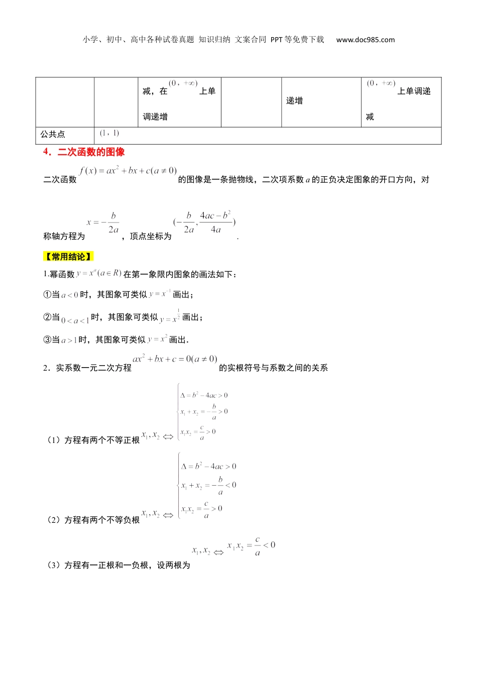 小学、初中、高中各种试卷真题知识归纳文案合同PPT等免费下载www.doc985.com【一轮复习讲义】2024年高考数学高频考点题型归纳与方法总结(新高考通用)第09讲二次函数与幂函数(精讲)题型目录一览①幂函数的定义与图像②幂函数的性质和综合应用③二次函数单调性问题④二次函数最值问题⑤二次函数恒成立问题1.幂函数的定义一般地,(为有理数)的函数,即以底数为自变量,幂为因变量,指数为常数的函数称为幂函数.2.幂函数的特征:同时满足一下三个条件才是幂函数①的系数为1;②的底数是自变量;③指数为常数.(3)幂函数的图象和性质3.常见的幂函数图像及性质:函数图象定义域值域奇偶性奇偶奇非奇非偶奇单调性在上单调递增在上单调递在上单调递增在上单调在和一、知识点梳理小学、初中、高中各种试卷真题知识归纳文案合同PPT等免费下载www.doc985.com减,在上单调递增递增上单调递减公共点4.二次函数的图像二次函数的图像是一条抛物线,二次项系数a的正负决定图象的开口方向,对称轴方程为,顶点坐标为.【常用结论】1.幂函数在第一象限内图象的画法如下:①当时,其图象可类似画出;②当时,其图象可类似画出;③当时,其图象可类似画出.2.实系数一元二次方程的实根符号与系数之间的关系(1)方程有两个不等正根(2)方程有两个不等负根(3)方程有一正根和一负根,设两根为小学、初中、高中各种试卷真题知识归纳文案合同PPT等免费下载www.doc985.com题型一幂函数的定义与图像策略方法若函幂数y=xα(α∈Z)是偶函数,则α必偶.为数当α是分数时,一般其先化将根式为,再判.断【典例1】已知幂函数满足,则的值为()A.2B.C.D.【答案】B【分析】设出幂函数的解析式,根据已知,求出参数的关系式,即可计算作答.【详解】依题意,设,则,所以.故选:B【题型训练】一、单选题1.现有下列函数:①;②;③;④;⑤;⑥;⑦,其中幂函数的个数为()二、题型分类精讲小学、初中、高中各种试卷真题知识归纳文案合同PPT等免费下载www.doc985.comA.1B.2C.3D.4【答案】B【分析】根据幂函数的定义逐个辨析即可【详解】幂函数满足形式,故,满足条件,共2个故选:B2.已知为幂函数,且,则()A.B.C.D.【答案】B【分析】根据幂函数及求其解析式,进而求.【详解】因为为幂函数,设,则,所以,可得,则.故选:B3.下列幂函数中,定义域为R的幂函数是()A.B.C.D.【答案】D【分析】利用分数指数式与根式的互化,结合具体函数的定义域的求法逐项分析即可求出结果.【详解】A,则需要满足,即,所以函数的定义域为,故A不符合题意;B,则需要满足,所以函数的定义域为,故B不符合题意;小学、初中、高中各种试卷真题知识归纳文案合同PPT等免费下载www.doc985.comC,则需要满足,所以函数的定义域为,故C不符合题意;D,故函数的定义域为,故D正确;故选:D.4.已知幂函数的图像过点,则的值域是()A.B.C.D.【答案】D【解析】先求出幂函数解析式,根据解析式即可求出值域.【详解】幂函数的图像过点,,解得,,的值域是.故选:D.5.函数的图象大致为()A.B.C.D.【答案】C小学、初中、高中各种试卷真题知识归纳文案合同PPT等免费下载www.doc985.com【分析】利用函数的奇偶性及幂函数的性质进行排除可得答案.【详解】因为,所以为偶函数,排除A,B选项;易知当时,为增函数,且增加幅度较为缓和,所以D不正确.故选:C.6.下列函数中,其图像如图所示的函数为()A.B.C.D.【答案】A【分析】根据函数的性质逐项分析即得.【详解】由图象可知函数为奇函数,定义域为,且在单调递减,对于A,,定义域为,,所以函数为奇函数,在单调递减,故A正确;对于B,,定义域为,故B错误;对于C,,定义域为,故C错误;对于D,,定义域为,,函数为偶函数,故D错误.故选:A.小学、初中、高中各种试卷真题知识归纳文案合同PPT等免费下载www.doc985.com7.如图所示是函数(且互质)的图象,则()A.是奇数且B.是偶数,是奇数,且C.是偶数,是奇数,且D.是偶数,且【答案】C【分析】根据幂函数的性质及图象判断即可;【详解】解:函数的图象关于轴对称,故为奇数,为偶数,在第一象...